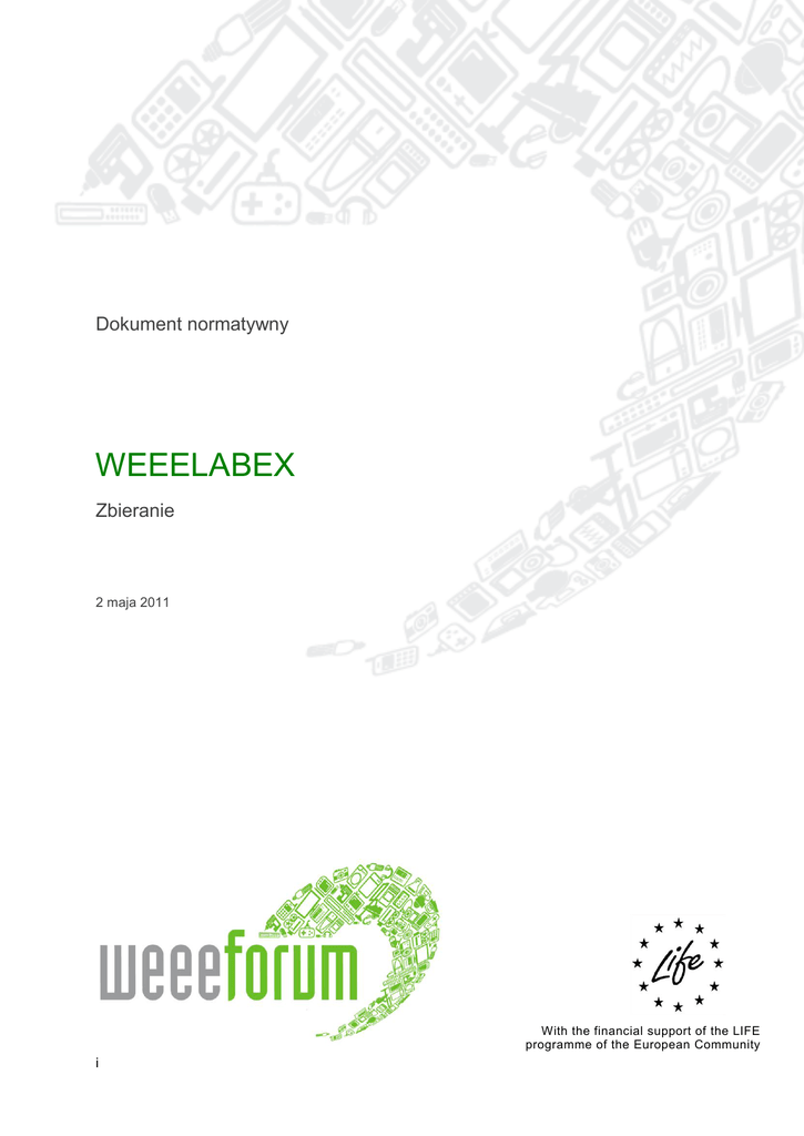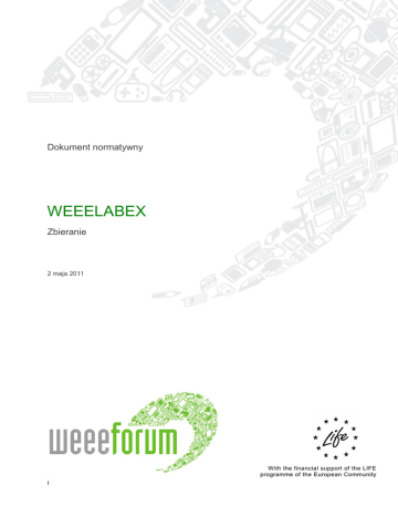 WEEELABEX normative document on Collection V9.0 Dokument normatywny WEEELABEX Zbieranie 2 maja 2011 With the financial support of the LIFE programme of the European Community i WEEELABEX normative document on Collection V9.0 Spis treści 1 Zakres .............................................................................................................................. 1 2 Odniesienia normatywne .................................................................................................. 2 3 Terminy i definicje ............................................................................................................ 3 4 Wymogi administracyjne i organizacyjne ........................................................................... 5 5 Wymogi techniczne .......................................................................................................... 7 ii WEEELABEX normative document on Collection V9.0 Przedmowa Od początków projektu WEEELABEX w 2009 roku, Forum ZSEE wraz z interesariuszami ze społeczności przetwórców ZSEE i producentami sprzętu elektrycznego i elektronicznego, skupiało się na wymaganiach prawnych, które operatorzy tj. punkty zbioru, zakłady logistyczne i zakłady przetwarzania muszą spełniać. Po raz pierwszy wszystkie wymogi są zaprezentowane w jednym pakiecie i w spójnej strukturze. Poprzednie wersje podlegały wzmożonym dyskusjom w różnych grupach roboczych. Wersja 9.0 wynika z jednogłośnego zatwierdzenia przez Walne Zgromadzenie Forum ZSEE dn. 1 kwietnia 2011 r. w Amsterdamie. W 2011 r. i 2012 r. projekt WEEELABEX będzie się koncentrował na weryfikacji zgodności. Wśród wyników przewiduje się opracowanie modelu zgłaszania audytu, protokołów pom iaru danych wejściowych, protokołów z pobierania próbek i analiz, podręcznik ów z audytów, formularzy deklaracji zgodności, definicji wartości docelowych i koncentracji, definicji dossier audytu i możliwie dodatkowych wytycznych. Aby pomóc zarządzającym projektem WEEELABEX w wykonaniu tych zadań, opracowano „listę punktów uwagi" zawierającą wszystkie elementy (wcześniej podkreślone jako drogowskazy w formie uwag i komentarzy w dokumencie normatywnym), które wymagają dalszego zbadania, są związane z weryfikac ją zgodności lub potrzebą zwrócenia na nie dalszej uwagi. Przewiduje się również powołanie swoistej organizacji WEEELABEX – w mniejszym dokumencie określanej jako "[WEEELABEX]" – której struktura zarządzania i model biznesowy będą omawiane. Audytorzy zostaną przeszkoleni do przeprowadzania audytów w celu weryfikacji zgodności WEEELABEX – profile audytorów powinny obejmować między innymi wymogi zachowania poufności i obiektywizmu. Ponadto zachęca się do wykorzystania narzędzia WF_RepTool opartego na sieci, opracowanego przez Forum ZSEE, które pozwala operatorom zgłaszać wskaźniki recyklingu i odzysku w oparciu o jednolite definicje. Organizacje członków Forum ZSEE oraz bardziej ogólnie inne organizacje, które mogą włączyć się do organizacji WEEELABEX (zwane dalej "Systemami ZSEE") muszą zintegrować wszystkie postanowienia zawarte w dokumencie normatywnym w swoich kontraktach z operatorami. Systemy ZSEE będą zwierać kontrakty wyłącznie z operatorami, którzy spełniają wymogi tego dokumentu normatywnego lub mogą wykazać, że spełniają równoznaczne specyfikacje. Na spotkaniu 1 kwietnia 2011 r. w Amsterdamie, systemy ZSEE podjęły decyzję, że będą wymagać od operatorów, z którymi zawarły kontrakt zgodności z wymogami WEEELABEX do 31 grudnia 2013 r. (stare państwa członkowskie) i 31 grudnia 2014 r. (nowe państwa członkowskie). Czołówka „rannych ptaszków” zacznie zdobywać doświadczenie przez wdrożenie w 2011-12 i przekaże swoje doświadczenia kierownictwu projektu WEEELABEX. Do 1 października 2012 r. tj. w ciągu 18 miesięcy po przyjęciu norm 1 kwietnia 2011 r., wersja 9.0 nie będzie modyfikowana. Dyskusje formalne i zatwierdzenie wymogów WEEELABEX w ramach CENELEC (lub równoznacznej organizacji normalizacyjnej) nie rozpocznie się przed przyjęciem nowej wersji dyrektywy 2002/96/WE. iii WEEELABEX normative document on Collection V9.0 Wprowadzenie Wymogi normatywne WEEELABEX określają działania związane z ochroną środowiska i zdrowia i bezpieczeństwa przez zapobieganie i łagodzenie negatywnych skutków zbierania, składowania i obróbki zużytego sprzętu elektrycznego i elektronicznego (ZSEE). Określa zarówno wymogi techniczne jak i dotyczące zarządzania dla operatorów, które mogą zostać zintegrowane w innych wymogach dotyczących zarządzania i służyć pomocą organizacjom w spełnianiu wymagań związanych z odpowiednim postępowanie m z ZSEE. Zgodność z wymogami normatywnymi WEEELABEX nie może sugerować zwolnienia z obowiązków prawnych. Niniejszy dokument normatywny nie ma na celu tworzenia barier handlowych ani zwiększenia czy zmniejszenia obowiązków prawnych organizacji. Celem jest to, by niniejszy dokument normatywny miał zastosowanie do wszystkich typów i rozmiarów organizacji i by uwzględniał różnorodne warunki geograficzne, kulturowe i społeczne. Struktura niniejszego dokumentu normatywnego jest zgodna z ogólnymi zasadami stru ktury i sporządzania dokumentów normatywnych. Klauzule 1, 2 i 3 wprowadzają i kształtują dokument. Klauzula 4 odnosi się do zasad administracyjnych i organizacyjnych dla operatorów. Klauzula 5 obejmuje wymogi techniczne działalności w punktach zbiórki. Niniejszy dokument normatywny zawiera treści dotyczące działań związanych z przygotowaniem do ponownego użycia. Jednak wymogi dotyczące przygotowania do ponownego użycia dotyczą tego, co konieczne, by sprzęt rynkowy przygotowany do ponownego użycia wykraczał poza zakres niniejszego dokumentu i nie zajmujemy się nimi tutaj. Uzgodniono ogólnie, że każda norma związana z wprowadzaniem na rynek sprzętu przygotowanego do ponownego u