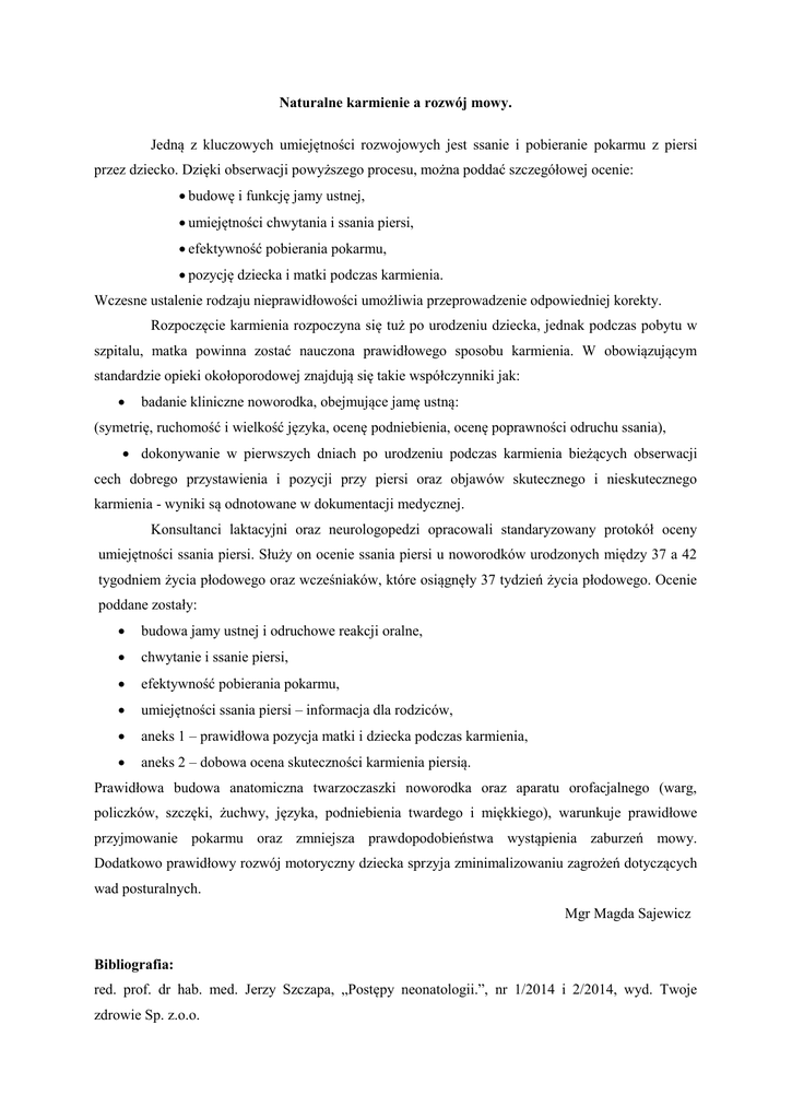 Naturalne karmienie a rozwój mowy. Jedną z kluczowych umiejętności rozwojowych jest ssanie i pobieranie pokarmu z piersi przez dziecko. Dzięki obserwacji powyższego procesu, można poddać szczegółowej ocenie: budowę i funkcję jamy ustnej, umiejętności chwytania i ssania piersi, efektywność pobierania pokarmu, pozycję dziecka i matki podczas karmienia. Wczesne ustalenie rodzaju nieprawidłowości umożliwia przeprowadzenie odpowiedniej korekty. Rozpoczęcie karmienia rozpoczyna się tuż po urodzeniu dziecka, jednak podczas pobytu w szpitalu, matka powinna zostać nauczona prawidłowego sposobu karmienia. W obowiązującym standardzie opieki okołoporodowej znajdują się takie współczynniki jak: badanie kliniczne noworodka, obejmujące jamę ustną: (symetrię, ruchomość i wielkość języka, ocenę podniebienia, ocenę poprawności odruchu ssania), dokonywanie w pierwszych dniach po urodzeniu podczas karmienia bieżących obserwacji cech dobrego przystawienia i pozycji przy piersi oraz objawów skutecznego i nieskutecznego karmienia - wyniki są odnotowane w dokumentacji medycznej. Konsultanci laktacyjni oraz neurologopedzi opracowali standaryzowany protokół oceny umiejętności ssania piersi. Służy on ocenie ssania piersi u noworodków urodzonych między 37 a 42 tygodniem życia płodowego oraz wcześniaków, które osiągnęły 37 tydzień życia płodowego. Ocenie poddane zostały: budowa jamy ustnej i odruchowe reakcji oralne, chwytanie i ssanie piersi, efektywność pobierania pokarmu, umiejętności ssania piersi – informacja dla rodziców, aneks 1 – prawidłowa pozycja matki i dziecka podczas karmienia, aneks 2 – dobowa ocena skuteczności karmienia piersią. Prawidłowa budowa anatomiczna twarzoczaszki noworodka oraz aparatu orofacjalnego (warg, policzków, szczęki, żuchwy, języka, podniebienia twardego i miękkiego), warunkuje prawidłowe przyjmowanie pokarmu oraz zmniejsza prawdopodobieństwa wystąpienia zaburzeń mowy. Dodatkowo prawidłowy rozwój motoryczny dziecka sprzyja zminimalizowaniu zagrożeń dotyczących wad posturalnych. Mgr Magda Sajewicz Bibliografia: red. prof. dr hab. med. Jerzy Szczapa, „Postępy neonatologii.”, nr 1/2014 i 2/2014, wyd. Twoje zdrowie Sp. z.o.o.