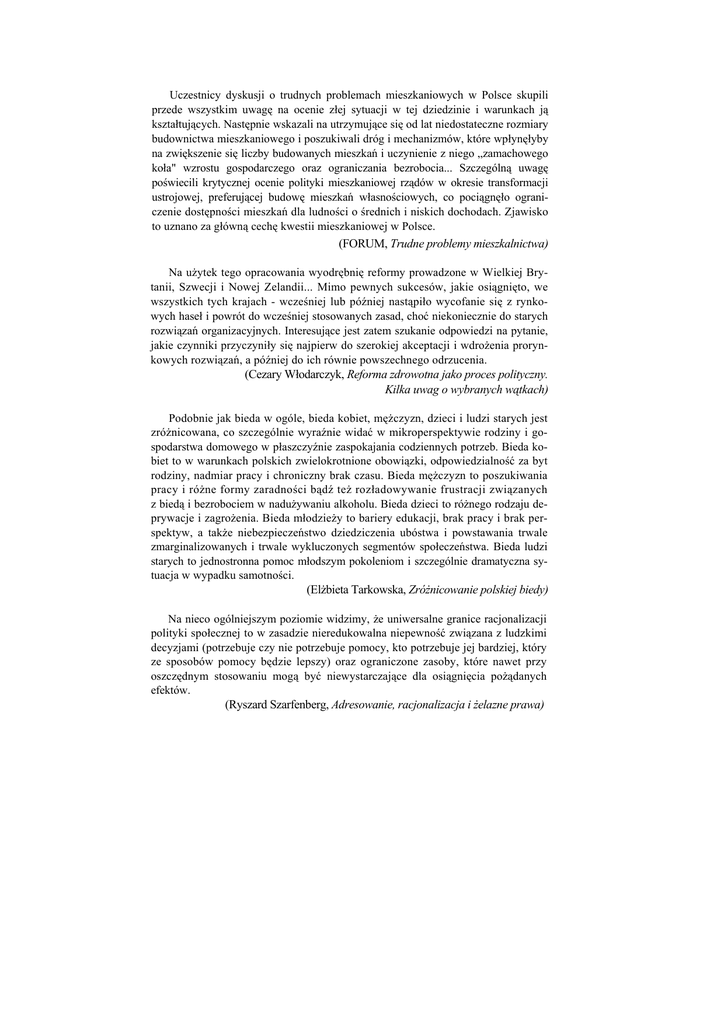 Uczestnicy dyskusji o trudnych problemach mieszkaniowych w Polsce skupili przede wszystkim uwagę na ocenie złej sytuacji w tej dziedzinie i warunkach ją kształtujących. Następnie wskazali na utrzymujące się od lat niedostateczne rozmiary budownictwa mieszkaniowego i poszukiwali dróg i mechanizmów, które wpłynęłyby na zwiększenie się liczby budowanych mieszkań i uczynienie z niego „zamachowego koła" wzrostu gospodarczego oraz ograniczania bezrobocia... Szczególną uwagę poświecili krytycznej ocenie polityki mieszkaniowej rządów w okresie transformacji ustrojowej, preferującej budowę mieszkań własnościowych, co pociągnęło ograniczenie dostępności mieszkań dla ludności o średnich i niskich dochodach. Zjawisko to uznano za główną cechę kwestii mieszkaniowej w Polsce. (FORUM, Trudne problemy mieszkalnictwa) Na użytek tego opracowania wyodrębnię reformy prowadzone w Wielkiej Brytanii, Szwecji i Nowej Zelandii... Mimo pewnych sukcesów, jakie osiągnięto, we wszystkich tych krajach - wcześniej lub później nastąpiło wycofanie się z rynkowych haseł i powrót do wcześniej stosowanych zasad, choć niekoniecznie do starych rozwiązań organizacyjnych. Interesujące jest zatem szukanie odpowiedzi na pytanie, jakie czynniki przyczyniły się najpierw do szerokiej akceptacji i wdrożenia prorynkowych rozwiązań, a później do ich równie powszechnego odrzucenia. (Cezary Włodarczyk, Reforma zdrowotna jako proces polityczny. Kilka uwag o wybranych wątkach) Podobnie jak bieda w ogóle, bieda kobiet, mężczyzn, dzieci i ludzi starych jest zróżnicowana, co szczególnie wyraźnie widać w mikroperspektywie rodziny i gospodarstwa domowego w płaszczyźnie zaspokajania codziennych potrzeb. Bieda kobiet to w warunkach polskich zwielokrotnione obowiązki, odpowiedzialność za byt rodziny, nadmiar pracy i chroniczny brak czasu. Bieda mężczyzn to poszukiwania pracy i różne formy zaradności bądź też rozładowywanie frustracji związanych z biedą i bezrobociem w nadużywaniu alkoholu. Bieda dzieci to różnego rodzaju deprywacje i zagrożenia. Bieda młodzieży to bariery edukacji, brak pracy i brak perspektyw, a także niebezpieczeństwo dziedziczenia ubóstwa i powstawania trwale zmarginalizowanych i trwale wykluczonych segmentów społeczeństwa. Bieda ludzi starych to jednostronna pomoc młodszym pokoleniom i szczególnie dramatyczna sytuacja w wypadku samotności. (Elżbieta Tarkowska, Zróżnicowanie polskiej biedy) Na nieco ogólniejszym poziomie widzimy, że uniwersalne granice racjonalizacji polityki społecznej to w zasadzie nieredukowalna niepewność związana z ludzkimi decyzjami (potrzebuje czy nie potrzebuje pomocy, kto potrzebuje jej bardziej, który ze sposobów pomocy będzie lepszy) oraz ograniczone zasoby, które nawet przy oszczędnym stosowaniu mogą być niewystarczające dla osiągnięcia pożądanych efektów. (Ryszard Szarfenberg, Adresowanie, racjonalizacja i żelazne prawa)