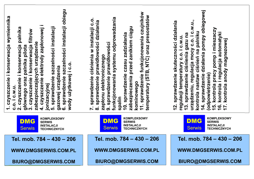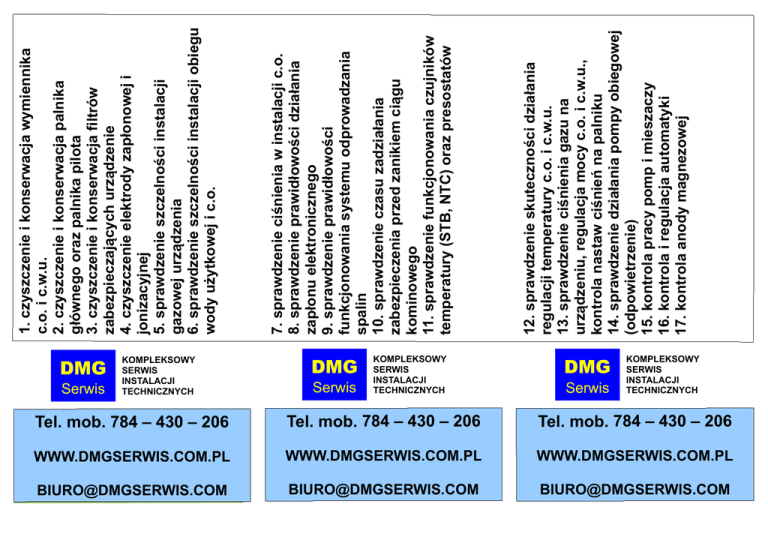 DMG Serwis KOMPLEKSOWY SERWIS INSTALACJI TECHNICZNYCH DMG Serwis KOMPLEKSOWY SERWIS INSTALACJI TECHNICZNYCH DMG Serwis KOMPLEKSOWY SERWIS INSTALACJI TECHNICZNYCH Tel. mob. XXX – 784 XXX–– 430 XXX– 206 Tel. mob. 784 – 430 – 206 Tel. mob. 784 – 430 – 206 WWW.DMGSERWIS.COM.PL WWW.DMGSERWIS.COM.PL WWW.DMGSERWIS.COM.PL WWW.DMGSERWIS.COM.PL [email protected] [email protected] [email protected] [email protected] 12. sprawdzenie skuteczności działania regulacji temperatury c.o. i c.w.u. 13. sprawdzenie ciśnienia gazu na urządzeniu, regulacja mocy c.o. i c.w.u., kontrola nastaw ciśnień na palniku 14. sprawdzenie działania pompy obiegowej (odpowietrzenie) 15. kontrola pracy pomp i mieszaczy 16. kontrola i regulacja automatyki 17. kontrola anody magnezowej 7. sprawdzenie ciśnienia w instalacji c.o. 8. sprawdzenie prawidłowości działania zapłonu elektronicznego 9. sprawdzenie prawidłowości funkcjonowania systemu odprowadzania spalin 10. sprawdzenie czasu zadziałania zabezpieczenia przed zanikiem ciągu kominowego 11. sprawdzenie funkcjonowania czujników temperatury (STB, NTC) oraz presostatów 1. czyszczenie i konserwacja wymiennika c.o. i c.w.u. 2. czyszczenie i konserwacja palnika głównego oraz palnika pilota 3. czyszczenie i konserwacja filtrów zabezpieczających urządzenie 4. czyszczenie elektrody zapłonowej i jonizacyjnej 5. sprawdzenie szczelności instalacji gazowej urządzenia 6. sprawdzenie szczelności instalacji obiegu wody użytkowej i c.o.