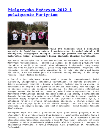 Pielgrzymka Mężczyzn 2012 i poświęcenie Martyrium Prawie 800 mężczyzn wraz z rodzinami przybyło do Pratulina, w sobotę 6 października, by wziąć udział w II Diecezjalnej Pielgrzymce Mężczyzn. Centralnym punktem uroczystości była Eucharystia, której przewodniczył Biskup Siedlecki Zbigniew Kiernikowski. Spotkanie rozpoczęło się otwarciem Dróżek Męczenników Podlaskich oraz Martyrium Pratulińskiego. – Bardzo się cieszę, że to miejsce przybiera taki charakter z racji przestrzeni, ukształtowania i obecności zabytkowego kościoła oraz dalszych aranżacji, jakie tutaj będą wykonywane. Przybiera taki charakter, dzięki któremu można wspominać to, co tutaj się stało pod koniec XIX wieku, a co tak ważne jest dla historii naszej diecezji i dla całego regionu – mówił Biskup Siedlecki. – Pratulin jest miejscem, które mówi o prawdzie, zaangażowaniu ludzi świeckich, umiejętności strzeżenia wszystkiego, co zostało przekazane w dobrze rozumianej tradycji i trosce o jedność. Jedność opartą na wierze, na odniesieniu do krzyża i na łączności ze Stolicą Apostolską. Mam nadzieję, że to miejsce stanie się miejscem świadectwa, by dzisiejszemu człowiekowi pomagać stawać się świadkiem, nawet w jakiejś mierze męczennikiem. Niech Martyrium Pratulińskie będzie miejscem uczenia się prawdy o konieczności dawania świadectwa dla pokazania wielkości człowieka żyjącego zgodnie z zamysłem Boga; miejscem nawracania się, pytania o fundament życia, o układanie relacji z drugim człowiekiem; miejscem, w którym uczymy się odniesienia swojego życia nie do siebie samego, lecz do krzyża Jezusa Chrystusa i do zamysłu Bożego, jaki jest w człowieku – mówił Pasterz Kościoła Siedleckiego. Niezapomnianym dla wielu przeżyciem była premierowa projekcja filmu „Pratulin”. Film wyreżyserowała Olga Kałagate – absolwentka Wydziału Radia i Telewizji na Uniwersytecie Śląskim w Katowicach. Film opowiada historię błogosławionego Wincentego Lewoniuka i jego 12 Towarzyszy, pokazuje ich wiarę i męstwo, a także przedstawia piękne nadbużańskie krajobrazy i zachęca do odwiedzenia Pratulina. W filmie wystąpili m.in. potomkowie bł. Męczenników Podlaskich. Po zakończonej projekcji filmu na placu przed kościołem rozpoczęła się Eucharystia, której przewodniczył Biskup Siedlecki. – Jezus wydał siebie, byśmy mogli być jednością – mówił w homilii Ksiądz Biskup. – W słowach Jezusa, „Ojcze, zachowaj ich w Twoim imieniu”, odnajdujemy klucz do jedności. Człowiek od początku został stworzony do jedności. Ta jedność została zaburzona przez grzech, ale przywrócona przez Jezusa Chrystusa. On stał się człowiekiem, byśmy zostali uzdolnieni do życia w komunii. Przez ofiarę z siebie, otworzył drogę jedności. Każdy, kto w Nim trwa, będzie budował jedność z drugim człowiekiem. Dziś chcemy pochylić czoło przed prawdą Chrystusa, której świadkami stali się błogosławieni Męczennicy z Pratulina. Oni dali się po ludzku pokonać, pozwalając, by dokonało się w nich dzieło Boga – kontynuował Biskup Siedlecki. – Jeśli Bóg jest ze mną, zaczynam rozumieć, że Jezus Chrystus jest prawdą i życiem, i nic nie odłączy mnie od Jego miłości. Błogosławieni Męczennicy odkryli perspektywę życia tam, gdzie inni widzieli przegraną i śmierć. Męczennicy pomagają nam trwać w nurcie wiary i żyć mocą chrztu; pomagają nam zrozumieć, że lepiej być skrzywdzonym niż krzywdzić, oszukiwanym niż oszukiwać, prześladowanym niż prześladować. W tym wszystkim odnosimy pełne zwycięstwo dzięki Temu, który nas umiłował. Dziękujemy Bogu z tych świadków, którzy uwierzyli przed nami i przekazali nam wiarę. Prosimy też Boga, byśmy potrafili przekazywać wiarę młodemu pokoleniu. 10 czerwca 1999 roku podczas wizyty w Siedlcach Jan Paweł II przypomniał, że „dzisiaj może bardziej niż w innym czasie trzeba autentycznego świadectwa wiary ukazanego życiem świeckich uczniów Chrystusa – niewiast i mężczyzn, młodych i starszych. Potrzeba zdecydowanego świadectwa wierności Kościołowi i odpowiedzialności za Kościół, który przez dwadzieścia wieków niesie wszystkim ludom i narodom zbawienie i głosi niezmienną naukę Ewangelii. Ludzkość stoi w obliczu rozmaitych trudności, problemów i gwałtownych zmian, przeżywa niejednokrotnie dramatyczne wstrząsy i rozdarcia. W tym świecie wielu ludzi, zwłaszcza młodych, doświadcza zagubienia i zranienia, niektórzy padają ofiarą sekt i religijnych wypaczeń czy też manipulowania prawdą. Inni ulegają różnym formom zniewolenia. Upowszechniają się postawy egoizmu, niesprawiedliwości i braku wrażliwości na potrzeby innych ludzi. Wobec tych i wielu innych wyzwań współczesności staje Kościół. Chce skutecznie nieść ludziom pomoc i dlatego potrzebuje zaangażowania wiernych świeckich, którzy pod kierunkiem swoich pasterzy będą czynnie uczestniczyć w Jego zbawczej misji”. Żyjemy w świecie, który ma wiele zamętu. Jeżeli nie mamy odniesienia do krzyża Jezusa Chrystusa, uczestniczymy w tym zamęcie. Jezus poświęcił siebie, byśmy byli w prawdzie i stanowili jedno, byśmy mieli radość w sercu pomimo trudności i niepowodzeń. Jesteśmy tutaj, by wchodzić w trudne sanktuarium obecności Boga przez męczeństwo człowieka. Tego męstwa w wierze potrzeba szczególnie mężczyznom. Oni potrzebują takiej relacji, w której ktoś będzie otwierać im bok i wprowadzać w pokorną postawę bycia głową rodziny w mocy Jezusa Chrystusa – nauczał Pasterz Kościoła Siedleckiego. Podczas pielgrzymki mężczyzn nie mogło zabraknąć rywalizacji sportowej. Wśród konkurencji znalazły się: piłowanie pieńka na czas, przeciąganie liny, przerzucanie opony traktorowej, bieg w workach, konkurs kulturystyczny, przenoszenie snopków na czas, rzut beretem sołtysa, bieg w gaciach dla dwojga oraz n