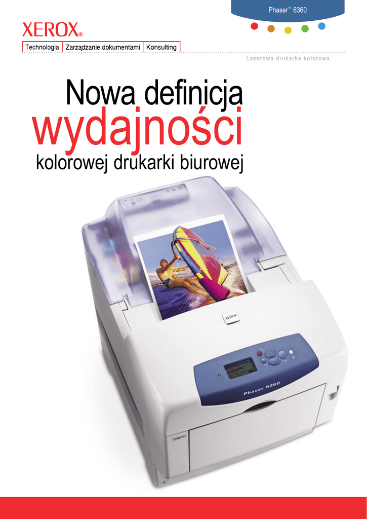 Phaser™ 6360 Laserowa drukarka kolorowa Nowa definicja wydajności kolorowej drukarki biurowej Phaser 6360 ™ Kolorowa drukarka laserowa Jako urządzenie, które wyznacza nowe standardy dla wysokowydajnych kolorowych drukarek laserowych, Xerox Phaser 6360 przewodzi na rynku największej szybkości drukowania w swojej klasie oraz wyjątkowej wydajności druku w kolorze. Łatwa w obsłudze drukarka laserowa Phaser 6360, zaprojektowana tak, by mogła spełniać surowe wymagania środowiska biurowe o dużym obciążeniu zadaniami drukowania, to wybór nie tylko oczywisty, lecz także jedyny. Niezrównana wydajność Uproszczone drukowanie: W dążeniu do największej szybkości drukowania Phaser 6360 określa tempo. Dzięki błyskawicznej instalacji i bezproblemowej pracy, drukarka Phaser 6360 zapewnia niezrównaną łatwość użytkowania. • Uzyskaj niezrównane kolory profesjonalnej jakości przy dużej szybkości drukowania wynoszącej do 40 stron na minutę — tak dużej, że możesz teraz we własnym biurze realizować zadania, które dotąd zlecałeś firmom zewnętrznym. • Utrzymaj efektywność w obciążonym pracą środowisku dzięki czasowi drukowania pierwszej strony wynoszącemu zaledwie 9 sekund. • Rozdzielczość druku wynosząca 2400 dpi w połączeniu z językiem opisu stron Adobe® PostScript® 3™ zapewnia żywe, wierne kolory oraz ostrość drukowanego tekstu i obrazu. • Jako jedyna na rynku drukarka kolorowa dla formatu A4 z wbudowanym procesorem 1 GHz, Phaser 6360 posiada moc wystarczającą do realizacji nawet najbardziej złożonych zadań drukowania. • Xerox Phaser 6360 (oprócz wesji N), wyposażony jest standardowo w funkcję bezpośredniego drukowania dwustronnego, zapewniając szybki i automatyczny druk dwustronny. • Przyjazne dla użytkownika oprogramowanie instalacyjne zapewnia sprawną pracę drukarki Phaser 6360 w biurowej sieci w ciągu kilku minut od wyjęcia z opakowania. • System rozwiązywania problemów online PhaserSMART™ oszczędza czas zapewniając dostęp do systemu Bazy wiedzy Xerox przez 24 godziny na dobę i 7 dni w tygodniu. • Sprawdź stan zadania drukowania nie ruszając się z wygodnego fotela dzięki wbudowanemu serwerowi sieciowemu Xerox CentreWare® IS, który bezproblemowo współpracuje z Twoją przeglądarką. • Wbudowana funkcja PrintingScout™ monitoruje przebieg zadań drukowania i natychmiast informuje o kłopotach, podając na czas propozycje działań naprawczych. • Inteligentne zasobniki podczas drukowania pokazują wszystkie dostępne typy i rozmiary nośników, dzięki czemu nie musisz bawić się w zgadywanie. • Wygodne powiadomienia na e-mail informują administratorów sieci o typowych przestojach, spowodowanych na przykład niskim poziomem tonera, co pomaga w utrzymaniu nieprzerwanej pracy. Phaser™ 6360 Łatwość zarządzania, konfiguracji i monitorowania pracy drukarki Phaser 6360 dzięki wbudowanemu intuicyjnemu oprogramowaniu. Spektakularne rezultaty. Przyciągająca wzrok jakość koloru ożywi biurowe wydruki. Podawane w czasie rzeczywistym informacje o stanie zasobnika papieru i poziomie materiałów eksploatacyjnych pozwalają podjąć niezbędne działania zanim zapasy się wyczerpią. Skonstruowana na potrzeby udostępniania Duża pojemność zasobników papieru, potężna wydajność i bezproblemowa integracja z siecią czynią drukarkę Phaser 6360 najlepszym rozwiązaniem dla wielu użytkowników. • Maksymalny wsad papieru wynoszący 2.350 stron oraz wysokowydajne kasety z tonerem sprawiają, że drukarka Phaser 6360 jest w każdej chwili gotowa do realizacji ciągłego strumienia zadań drukowania. • Maksymalnie pięć zasobników papieru pozwala bez trudu dostosować drukarkę Phaser 6360 do rozmiarów biura. • Cykl roboczy wynoszący 100.000 stron miesięcznie zapewnia niezawodną pracę w wymagających środowiskach biurowych. • Różnorodność możliwości drukowania — od broszury poprzez baner, aż po pełen zakres rozmiarów niestandardowych — stwarza pole do popisu dla Twojej kreatywności. • Administratorzy mogą bez trudu zbierać, organizować i analizować dane rozrachunkowe zadań drukowania, pochodzące z różnych drukarek, dzięki Narzędziu do analizy użytkowania. Drukarka Phaser 6360 jest nie tylko niezwykle szybka i łatwa w użyciu - jej konstrukcja zapewnia też maksymalną elastyczność. W miarę zwiększania się liczby użytkowników wzrosnąć może także obciążenie drukarki. 150-arkuszowy standardowy zasobnik uniwersalny obsługuje szeroki wachlarz nośników od pism oficjalnych po banery i od kartonów po koperty. Standardowy zasobnik na 550 arkuszy zwiększa wydajność w przypadku drukowania rozszerzonego. Opcjonalny zasobnik na 550 arkuszy zapewnia dodatkową wygodę i niekłopotliwe uzupełnianie zapasu nośnika. Dodaj wysokowydajny podajnik na 1.100 arkuszy, by zmienić urządzenie Phaser 6360 w wygodną drukarkę podłogową o ogólnej pojemności papieru wynoszącej 2.350 arkuszy. www.xerox.pl Phaser™ 6360 Aby uzyskać więcej informacji, prosimy skontaktować z lokalnym przedstawicielem handlowym firmy Xerox, lub odwiedzić stronę internetową www.xerox.pl Phaser 6360N Phaser 6360DN Phaser 6360DA Phaser 6360DB Phaser 6360DT 100.000 stron/miesiąc* Cykl roboczy Obsługa papieru Zasobnik 1 (MPT): 150 arkuszy; rozmiary do wyboru: od 89 x 140 mm do 216 x 914 mm Podawanie papieru W standardzie Taca 2: 550 arkuszy; rozmiary do wyboru: Do formatu A4 Opcjonalnie Dodatkowy podajnik na 550 arkuszy Opcjonalnie Dodatkowy podajnik na 1100 arkuszy 250 arkuszy Wyjście papieru Opcjonalnie W standardzie Drukowanie obustronne Drukowanie Czas drukowania pierwszej strony Rozdzielczość (maksymalna) Procesor Pamięć (standardowa/ maksymalna) Możliwość podłączenia Języki opisu strony 512 MB / 1GB 10/100Base-TX Ethernet, USB 2.0 Adobe PostScript 3, emulacja PCL 5c Druk broszur, Druk plakatów, Negatywy, Obrazy lustrzane, Skalowanie, Zna