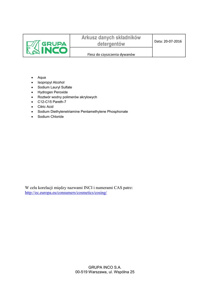 Arkusz danych składników detergentów Flesz do czyszczenia dywanów Aqua Isopropyl Alcohol Sodium Lauryl Sulfate Hydrogen Peroxide Roztwór wodny polimerów akrylowych C12-C15 Pareth-7 Citric Acid Sodium Diethylenetriamine Pentamethylene Phosphonate Sodium Chloride W celu korelacji między nazwami INCI i numerami CAS patrz: http://ec.europa.eu/consumers/cosmetics/cosing/ GRUPA INCO S.A. 00-519 Warszawa, ul. Wspólna 25 Data: 20-07-2016