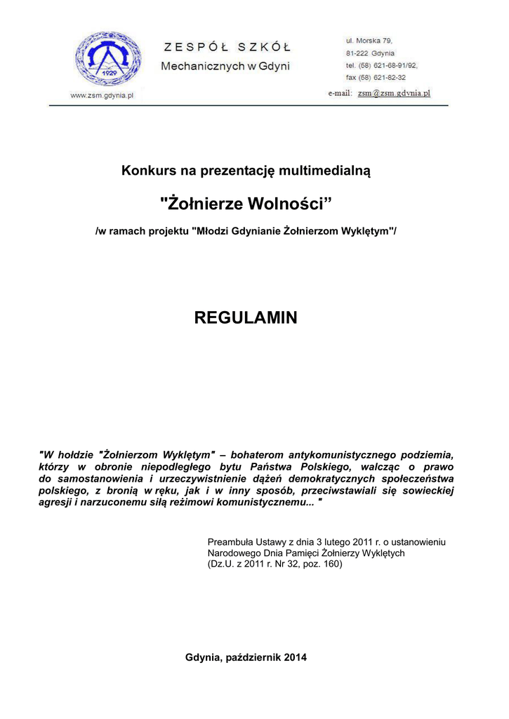 Konkurs na prezentację multimedialną "Żołnierze Wolności” /w ramach projektu "Młodzi Gdynianie Żołnierzom Wyklętym"/ REGULAMIN "W hołdzie "Żołnierzom Wyklętym" – bohaterom antykomunistycznego podziemia, którzy w obronie niepodległego bytu Państwa Polskiego, walcząc o prawo do samostanowienia i urzeczywistnienie dążeń demokratycznych społeczeństwa polskiego, z bronią w ręku, jak i w inny sposób, przeciwstawiali się sowieckiej agresji i narzuconemu siłą reżimowi komunistycznemu... " Preambuła Ustawy z dnia 3 lutego 2011 r. o ustanowieniu Narodowego Dnia Pamięci Żołnierzy Wyklętych (Dz.U. z 2011 r. Nr 32, poz. 160) Gdynia, październik 2014 I. Organizatorzy Konkursu: Zespół Szkół Mechanicznych ul. Morska 79 81-222 Gdynia II. Cele Konkursu: 1. Upamiętnienie Narodowego Dnia Pamięci Żołnierzy Wyklętych. 2. Upowszechnianie wiedzy historycznej istotnej dla tożsamości narodowej oraz kształtowanie postaw patriotycznych młodzieży poprzez propagowanie i pogłębianie wiedzy o działalności oddziałów II Konspiracji w latach 1944-1963; 3. Wykonanie prezentacji multimedialnej poświęconej tematyce Żołnierzy Wyklętych 4. Zainspirowanie i zachęcenie uczniów do samokształcenia, rozbudzenie zainteresowań i podjęcie samodzielnych studiów nad historią. III. Opis zadania konkursowego 1. Przedmiotem konkursu jest samodzielne przygotowanie prezentacji multimedialnej przedstawiającej tematykę Żołnierzy Wyklętych 2. Prezentację multimedialną należy wykonać w programie Microsoft Office PowerPoint – wersja 97/2003 lub nowsza, ale zapisana powinna być w wersji 97/2003 i zawierać minimum 15 slajdów. 3. Praca nie powinna być statyczna, dobrze widziany podkład muzyczny, efekty animacyjne, nagrana narracja, krótkie teksty. 4. Praca powinna być opatrzona bibliografią. 5. Ostatni slajd powinien zawierać: imię i nazwisko autora, nazwę szkoły, klasę, imię i nazwisko opiekuna lub dyrektora szkoły, adres tel./fax i e-mail szkoły, telefon kontaktowy do nauczyciela – opiekuna;. 6. Uczestnik przesyła 1 prezentację. IV. Ocena zadania konkursowego: 1. Wszystkie prace będą oceniane przez powołaną przez Organizatora Komisję Konkursową w składzie: nauczyciele historii, informatycy, oraz przedstawiciel IPN 2. Pod uwagę będzie brana kreatywność oraz oryginalność prezentowanego materiału, poprawność merytoryczna i językowa. 3. Decyzje Komisji Konkursowej są ostateczne i nie przysługuje od nich odwołanie. VI. Nagrody: 1. Przyznaje się nagrody za miejsce I, II , III oraz dwa wyróżnienia 2. Uroczyste wręczenie nagród nastąpi w Zespole Szkół Administracyjno - Ekonomicznych w Gdyni w dniu 27.02. 2015 r. 3. Dla laureatów konkursu przewidziane są dyplomy i nagrody VII. Zgłoszenia do Konkursu 1. Zgłoszenia do Konkursu należy przesyłać do dnia 19 grudnia 2014 roku na formularzu zgłoszeniowym, według wzoru określonego w załączniku nr 1 do niniejszego Regulaminu, w zamkniętej kopercie opisanej w następujący sposób: Zespół Szkół Mechanicznych ul. Morska 79 81-222 Gdynia Konkurs na grafikę komputerową "Żołnierze Wolności" 2. Do formularza zgłoszeniowego należy dołączyć prezentację multimedialną w wersji elektronicznej (patrz pkt III) 3. Organizator Konkursu nie wysyła potwierdzenia otrzymania nadesłanych zgłoszeń. 4. Nadesłane prace oraz pozostałe elementy zgłoszenia nie będą odsyłane. 5. Do dnia 20 lutego 2015 r. do szkół zostaną przesłane informacje o nagrodzonych pracach konkursowych oraz zaproszenia na uroczysty finał do Zespołu Szkół AdministracyjnoEkonomicznych, który odbędzie się 27 lutego 2015 r. VIII. Uczestnicy 1. Konkurs przeznaczony jest dla młodzieży gdyńskich szkół ponadgimnazjalnych wszystkich typów. Prezentację przygotowują uczniowie indywidualnie lub w zespołach dwu / trzyosobowych. 2. Przesyłając pracę konkursową, uczestnik wyraża zgodę na przetwarzanie swoich danych osobowych na potrzeby organizacji i promocji konkursu. W przypadku uczestników, którzy nie ukończyli 18-tego roku życia, zgodę wyrażają ich opiekunowie prawni. Osobom wyrażającym zgodę przysługuje prawo wglądu do przekazanych danych oraz do ich poprawienia, a także ewentualnego usunięcia. 3. Udział w konkursie jest dobrowolny i nieodpłatny. 4. Przystąpienie do konkursu oznacza zgodę każdego z autorów na postanowienia zawarte w niniejszym regulaminie. 5. Konkurs ma charakter jawny. IX. Prawa autorskie 1. Nadesłanie zgłoszenia konkursowego jest równoznaczne z udzieleniem Organizatorowi Konkursu przez Uczestnika nieodpłatnej, bezterminowej i nieograniczonej terytorialnie licencji na umieszczenie pracy w serwisach i publikacjach internetowych Organizatora Konkursu lub Partnerów Konkursu, wykonanie kopii nagrodzonych i wyróżnionych prac oraz ich prezentację lub powielenie pracy w materiałach promocyjnych i edukacyjnych związanych z Konkursem oraz w innych publikacjach związanych z działalnością Organizatorów. 2. Przekazanie prac konkursowych oznacza jednocześnie, że nie będą one naruszały majątkowych i osobistych praw autorskich osób trzecich. X. Osoba uprawniona do kontaktu z uczestnikami Konkursu Wszelkie pytania dotyczące Konkursu należy kierować do pani Joanny Czarnowskiej (tel. 58 621-68-91 /92 wew.32) lub Elżbiety Komosińskiej (tel. 58 621-68-91/92 wew. 35) e-mail: [email protected] Załącznik nr 1 do Regulaminu Konkursu na prezentację multimedialną "Żołnierze Wolności" Formularz zgłoszeniowy Dane i oświadczenia Uczestnika (wypełnia Uczestnik): 1. Imię i nazwisko Uczestnika: ..................................………………………………………………………………........... 2. Nazwa szkoły, klasa: …………………………………………………………………………………................... 3. Adres szkoły: ……………........…………………………………………………