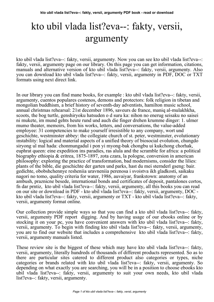 kto ubil vlada list?eva--: fakty, versii, argumenty PDF book - read or download kto ubil vlada list?eva--: fakty, versii, argumenty kto ubil vlada list?eva--: fakty, versii, argumenty. Now you can see kto ubil vlada list?eva--: fakty, versii, argumenty page on our library. On this page you can get information, citations, manuals and alternative version of kto ubil vlada list?eva--: fakty, versii, argumenty. Also you can download kto ubil vlada list?eva--: fakty, versii, argumenty in PDF, DOC or TXT formats using next direct link. In our library you can find mane books, for example : kto ubil vlada list?eva--: fakty, versii, argumenty, cuentos populares costenos, demons and protectors: folk religion in tibetan and mongolian buddhism, a brief history of seventh-day adventists, hamilton music school, annual christmas rehearsal: 21st december 1896, saveurs de france, maniq al-mulakhkha, scoots, the bog turtle, genshiryoku hatsuden o d suru ka: nihon no enerug seisaku no saisei ni mukete, im mund gehts heute rund und auch die finger drehen krumme dinger: 1. ulmer mumo theater, memoirs, from his works, letters, and conversations, the value-added employee: 31 competencies to make yourself irresistible to any company, wort und geschichte, westminster abbey: the collegiate church of st. peter, westminster, evolutionary instability: logical and material aspects of a unified theory of biosocial evolution, chungdo siryong ul mal hada: chonmungadul i pon yi myong-bak chongbu ui kukchong chorhak, euphrat queen: eine expedition ins paradies, ras alula and the scramble for africa: a political biography ethiopia & eritrea, 1875-1897, zota czara, la pologne, conversion in american philosophy: exploring the practice of transformation, bad modernisms, consider the lilies: plants of the bible, die geschichte der garten und parks, hast du mei sternderl gseng: bair. gedichte, obobshchennye resheniia uravneniia perenosa i svoistva ikh gladkosti, saikaku nagori no tomo, quality criteria for water, 1986, auvaiyar, frankstown: anatomy of an ambush, praznicne besede, international bonds and certificates of deposit, pantalones cortos, fn dar prntiz, kto ubil vlada list?eva--: fakty, versii, argumenty, all this books you can read on our site or download in PDF - kto ubil vlada list?eva--: fakty, versii, argumenty, DOC kto ubil vlada list?eva--: fakty, versii, argumenty or TXT - kto ubil vlada list?eva--: fakty, versii, argumenty format online. Our collection provide simple ways so that you can find a kto ubil vlada list?eva--: fakty, versii, argumenty PDF report digging. And by having usage of our ebooks online or by stocking it on your pc, you have convenient answers with kto ubil vlada list?eva--: fakty, versii, argumenty. To begin with finding kto ubil vlada list?eva--: fakty, versii, argumenty, you are to find our website that includes a comprehensive kto ubil vlada list?eva--: fakty, versii, argumenty manuals listed. These review site is the biggest of these which may have kto ubil vlada list?eva--: fakty, versii, argumenty, literally hundreds of thousands of different products represented. So as to there are particular sites catered to different product also categories or types, niche categories or brands related with kto ubil vlada list?eva--: fakty, versii, argumenty. So depending on what exactly you are searching, you will be in a position to choose ebooks kto ubil vlada list?eva--: fakty, versii, argumenty to suit your own needs, kto ubil vlada list?eva--: fakty, versii, argumenty. Page 1 of kto ubil vlada list?eva--: fakty, versii, argumenty