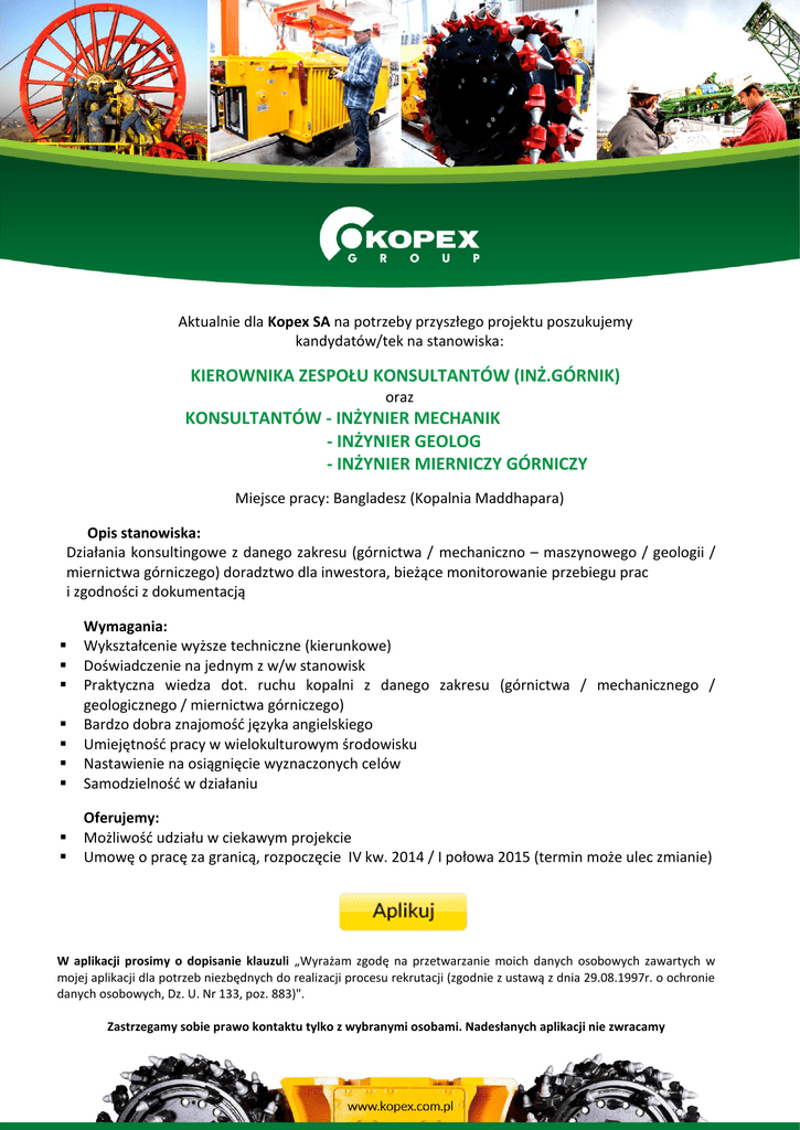Aktualnie dla Kopex SA na potrzeby przyszłego projektu poszukujemy kandydatów/tek na stanowiska: KIEROWNIKA ZESPOŁU KONSULTANTÓW (INŻ.GÓRNIK) oraz KONSULTANTÓW - INŻYNIER MECHANIK - INŻYNIER GEOLOG - INŻYNIER MIERNICZY GÓRNICZY Miejsce pracy: Bangladesz (Kopalnia Maddhapara) Opis stanowiska: Działania konsultingowe z danego zakresu (górnictwa / mechaniczno – maszynowego / geologii / miernictwa górniczego) doradztwo dla inwestora, bieżące monitorowanie przebiegu prac i zgodności z dokumentacją Wymagania: Wykształcenie wyższe techniczne (kierunkowe) Doświadczenie na jednym z w/w stanowisk Praktyczna wiedza dot. ruchu kopalni z danego zakresu (górnictwa / mechanicznego / geologicznego / miernictwa górniczego) Bardzo dobra znajomość języka angielskiego Umiejętność pracy w wielokulturowym środowisku Nastawienie na osiągnięcie wyznaczonych celów Samodzielność w działaniu Oferujemy: Możliwość udziału w ciekawym projekcie Umowę o pracę za granicą, rozpoczęcie IV kw. 2014 / I połowa 2015 (termin może ulec zmianie) W aplikacji prosimy o dopisanie klauzuli „Wyrażam zgodę na przetwarzanie moich danych osobowych zawartych w mojej aplikacji dla potrzeb niezbędnych do realizacji procesu rekrutacji (zgodnie z ustawą z dnia 29.08.1997r. o ochronie danych osobowych, Dz. U. Nr 133, poz. 883)". Zastrzegamy sobie prawo kontaktu tylko z wybranymi osobami. Nadesłanych aplikacji nie zwracamy