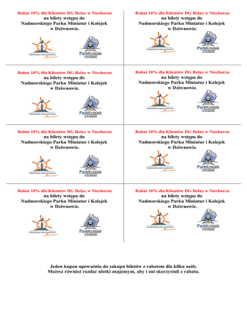 Rabat 10% dla Klientów DG Relax w Niechorzu Rabat 10% dla Klientów DG Relax w Niechorzu na bilety wstępu do Nadmorskiego Parku Miniatur i Kolejek w Dziwnowie. na bilety wstępu do Nadmorskiego Parku Miniatur i Kolejek w Dziwnowie. Rabat 10% dla Klientów DG Relax w Niechorzu Rabat 10% dla Klientów DG Relax w Niechorzu na bilety wstępu do Nadmorskiego Parku Miniatur i Kolejek w Dziwnowie. na bilety wstępu do Nadmorskiego Parku Miniatur i Kolejek w Dziwnowie. Rabat 10% dla Klientów DG Relax w Niechorzu Rabat 10% dla Klientów DG Relax w Niechorzu na bilety wstępu do Nadmorskiego Parku Miniatur i Kolejek w Dziwnowie. na bilety wstępu do Nadmorskiego Parku Miniatur i Kolejek w Dziwnowie. Rabat 10% dla Klientów DG Relax w Niechorzu Rabat 10% dla Klientów DG Relax w Niechorzu na bilety wstępu do Nadmorskiego Parku Miniatur i Kolejek w Dziwnowie. na bilety wstępu do Nadmorskiego Parku Miniatur i Kolejek w Dziwnowie. Jeden kupon upoważnia do zakupu biletów z rabatem dla kilku osób. Możesz również rozdać ulotki znajomym, aby i oni skorzystali z rabatu.
