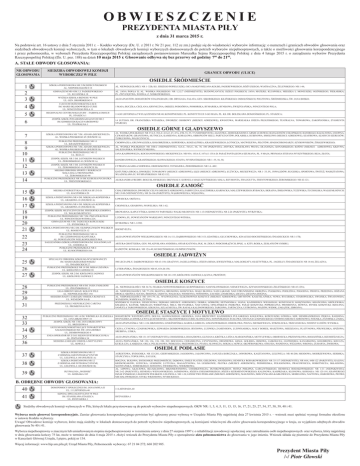 OBWIESZCZENIE PREZYDENTA MIASTA PIŁY z dnia 31 marca 2015 r. Na podstawie art. 16 ustawy z dnia 5 stycznia 2011 r. – Kodeks wyborczy (Dz. U. z 2011 r. Nr 21 poz. 112 ze zm.) podaje się do wiadomości wyborców informację: o numerach i granicach obwodów głosowania oraz siedzibach obwodowych komisji wyborczych, w tym o lokalach obwodowych komisji wyborczych dostosowanych do potrzeb wyborców niepełnosprawnych, a także o możliwości głosowania korespondencyjnego i przez pełnomocnika, w wyborach Prezydenta Rzeczypospolitej Polskiej zarządzonych postanowieniem Marszałka Sejmu Rzeczypospolitej Polskiej z dnia 4 lutego 2015 r. o zarządzeniu wyborów Prezydenta Rzeczypospolitej Polskiej (Dz. U. poz. 188) na dzień 10 maja 2015 r. Głosowanie odbywa się bez przerwy od godziny 700 do 2100. A. STAŁE OBWODY GŁOSOWANIA: NR OBWODU głosowania SIEDZIBA OBWODOWEJ KOMISJI WYBORCZEJ W PILE GRANICE OBWODU (ULICE) OSIEDLE ŚRÓDMIEŚCIE 1 2 3 SZKOŁA PODSTAWOWA NR 5 IM DZIECI POLSKICH AL. NIEPODLEGŁOŚCI 18 WYŻSZA SZKOŁA BIZNESU W PILE UL. GEN. SIKORSKIEGO 9 ALEJA PIASTÓW; BOHATERÓW STALINGRADU; DR. DRYGASA; FAŁATA; GEN. SIKORSKIEGO; KILIŃSKIEGO; OSSOLIŃSKICH; POCZTOWA; ŚRÓDMIEJSKA; ŚW. JANA BOSKO; 4 I LICEUM OGÓLNOKSZTAŁCĄCE IM. MARII SKŁODOWSKIEJ-CURIE UL. WINCENTEGO POLA 11 1 MAJA; BUCZKA; CEGLANA; KRYNICZNA; OKRZEI; PODGÓRNA; POMORSKA; RYMARSKA; RYNKOWA; ŚWIĘTOJAŃSKA; WINCENTEGO POLA; 5 REGIONALNE CENTRUM KULTURY – FABRYKA EMOCJI PL. STASZICA 1 6 ZESPÓŁ SZKÓŁ PONADGIMNAZJALNYCH NR 2 IM. KOMISJI EDUKACJI NARODOWEJ UL. TEATRALNA 1 14 LUTEGO; DR. FRANCISZKA WITASZKA; DWORZEC OSOBOWY (MIEJSCE ADRESOWE); KWIATOWA; MARSZAŁKA JÓZEFA PIŁSUDSKIEGO; TEATRALNA; TOWAROWA; ZAKOPIAŃSKA; ZYGMUNTA STAREGO; SZKOŁA PODSTAWOWA NR 7 IM. ADAMA MICKIEWICZA AL. WOJSKA POLSKIEGO 45 (WEJŚCIE A) AL. WOJSKA POLSKIEGO: NR 37A-F, 39A-F, 41A-F, 47, 47A, 47B, 53, 55, 57 (NIEPARZYSTE); AGATOWA; ARMII KRAJOWEJ; ARMII LUDOWEJ; BATALIONÓW CHŁOPSKICH; BATOREGO; BAZALTOWA; CHOPINA; CZWARTAKÓW; GRANITOWA; HUTNICZA; KAMIENNA; KORALOWA; OBROŃCÓW HELU; PARTYZANTÓW; POŁABSKA; RUBINOWA; SMOLEWO (MIEJSCE ADRESOWE); SZAFIROWA; SZARYCH SZEREGÓW; TURKUSOWA; WALECZNYCH; 7 8 9 10 11 12 13 14 GIMNAZJUM NR 4 IM. I.J. PADEREWSKIEGO UL. KUJAWSKA 18 PUBLICZNE PRZEDSZKOLE NR 13 UL. KRASZEWSKIEGO 2 SZKOŁA PODSTAWOWA NR 7 IM. ADAMA MICKIEWICZA AL. WOJSKA POLSKIEGO 45 (WEJŚCIE B) PUBLICZNE PRZEDSZKOLE NR 12 UL. REJA 11 ZESPÓŁ SZKÓŁ NR 3 IM. LOTNIKÓW POLSKICH UL. ŻEROMSKIEGO 41 (WEJŚCIE A) ZESPÓŁ SZKÓŁ NR 3 IM. LOTNIKÓW POLSKICH UL. ŻEROMSKIEGO 41 (WEJŚCIE B) MIEJSKI OŚRODEK SPORTU I REKREACJI MAŁA HALA TRENINGOWA UL. ŻEROMSKIEGO 90 PUBLICZNE PRZEDSZKOLE NR 18 IM. KUBUSIA PUCHATKA UL. TRENTOWSKIEGO 3 15 16 17 18 19 20 21 SZKOŁA PODSTAWOWA NR 2 IM. OLIMPIJCZYKÓW POLSKICH UL. ROOSEVELTA 12 22 23 24 PUBLICZNE PRZEDSZKOLE NR 16 IM. CZERWONEGO KAPTURKA AL. POWSTAŃCÓW WIELKOPOLSKICH 86A SALEZJAŃSKA SZKOŁA PODSTAWOWA IM. JANA PAWŁA II UL. ANDERSA 34 PUBLICZNE PRZEDSZKOLE NR 4 UL. KUSOCIŃSKIEGO 10A 25 26 27 SPECJALNY OŚRODEK SZKOLNO-WYCHOWAWCZY IM. MARII GRZEGORZEWSKIEJ UL. ŚNIADECKICH 27 PUBLICZNE PRZEDSZKOLE NR 19 IM. MISIA USZATKA UL. KRÓLOWEJ JADWIGI 20 28 29 30 31 PUBLICZNE PRZEDSZKOLE NR 6 IM. JASIA I MAŁGOSI UL. ŻELEŃSKIEGO 15 LIGA OBRONY KRAJU KOŁO W PILE AL. NIEPODLEGŁOŚCI 154 SIEDZIBA RADY I ZARZĄDU OSIEDLA KOSZYCE UL. WENEDÓW 8A-B MIEJSKA ENERGETYKA CIEPLNA SP. Z O.O. UL. KACZORSKA 20 AL. NIEPODLEGŁOŚCI: NR 1–32B; KS. JERZEGO POPIEŁUSZKI; OJCA MAKSYMILIANA KOLBE; PADEREWSKIEGO; RÓŻYCKIEGO; WIATRACZNA; ŻELEŃSKIEGO: NR 1-44; AL. JANA PAWŁA II; AL. WOJSKA POLSKIEGO: NR 1,3,5,7 (NIEPARZYSTE); BUDOWLANYCH; DZIECI POLSKICH; JANA MATEJKI; KUJAWSKA; MIESZKA I; MONIUSZKI; OGIŃSKIEGO; PIEKARSKA; PL. ZWYCIĘSTWA; WODNA; Z. NOSKOWSKIEGO; 11-GO LISTOPADA Z WYŁĄCZENIEM NR 40; KONOPNICKIEJ; PL. KONSTYTUCJI 3-GO MAJA; PL. KS. DR. BOLESŁAWA DOMAŃSKIEGO; PL. STASZICA; OSIEDLE GÓRNE I GŁADYSZEWO CHORWACKA; GRUNWALDZKA; KOŁOBRZESKA; KOPERNIKA; KOSZALIŃSKA; KRASZEWSKIEGO; LOTNICZA; MATWIEJEWA; PILOTÓW; SPADOCHRONIARZY; SZYBOWNIKÓW; ŻÓŁKIEWSKIEGO; AL. WOJSKA POLSKIEGO: NR 35B-C (NIEPARZYSTE); 52A-C, 54A-C, 66, 70, 100 (PARZYSTE); ASNYKA; BOLESŁAWA PRUSA; DŁUGOSZA; KONARSKIEGO; KOŚNO (MIEJSCE ADRESOWE); KRZYWA; SALEZJAŃSKA; WYPOCZYNKOWA; JANA KASPROWICZA; KOCHANOWSKIEGO; MICKIEWICZA: NR 95A–103A-F, 107A-I–135A-D; PASAŻ PANTALEONA SZUMANA; PL. 9 MAJA; PRYMASA STEFANA WYSZYŃSKIEGO; REJA; ZŁOTA; KONDRATOWICZA; KRASIŃSKIEGO; SŁOWACKIEGO; STAFFA; WYSPIAŃSKIEGO: NR 1–55, 56, 58; CYPRIANA KAMILA NORWIDA; ORZESZKOWEJ; TETMAJERA; ŻEROMSKIEGO: NR 1A–40C; KOTUŃSKA DROGA; DWORZEC TOWAROWY (MIEJSCE ADRESOWE); ŁĘGI (MIEJSCE ADRESOWE); ŁUŻYCKA; MICKIEWICZA: NR 1–33; PL. INWALIDÓW; RUGIJSKA; SPORTOWA; ŚWITEŹ; WARSZTATOWA; WŁADYSŁAWA IV; WYSPIAŃSKIEGO: NR 82-132; ALEKSANDRA FREDRY; BOGUSŁAWSKIEGO; DRZYMAŁY; KORNELA MAKUSZYŃSKIEGO; MAŁA; REYMONTA; TRAUGUTTA; TRENTOWSKIEGO; ŻEROMSKIEGO: NR 42-121; OSIEDLE ZAMOŚĆ CHAŁUBIŃSKIEGO; DWORZEC CELNY (MIEJSCE ADRESOWE); FABRYCZNA; KACZORSKA; KARPACKA; MALCZEWSKIEGO; RYBACKA; SKRAJNA; ŚMIŁOWSKA; TCZEWSKA; TUCHOLSKA; WALKI MŁODYCH: NR 15-89 (NIEPARZYSTE); NR 26-106 (PARZYSTE); WĄGROWIECKA; WĘGLOWA; SZKOŁA PODSTAWOWA NR 4 IM. MIKOŁAJA KOPERNIKA UL. GRABOWA 18 (WEJŚCIE A) ŁOWIECKA; OKÓLNA; SZKOŁA PODSTAWOWA NR 4 IM. MIKOŁAJA KOPERNIKA UL. GRABOWA 18 (WEJŚCIE B) CHOJNICKA; GRABOWA; WAWELSKA: NR 1-62; ZESPÓŁ SZKÓŁ MUZYCZNYCH IM. FRYDERYKA CHOPINA UL. WALKI MŁODYCH 1 PUBLICZNE PRZEDSZKOLE NR 7 IM. PSZCZÓŁKI MAI UL. WINCENTEGO WITOSA 22A GIMNAZJUM NR 5 IM. TADEUSZA KOŚCIUSZKI UL. BYDGOSKA 23 ZESPÓŁ SZKÓŁ NR 2 IM. KRÓLOWEJ JADWIGI UL. KRÓLOWEJ JADWIGI 2 PRZEDSZKOLE NIEPUBLICZNE CARITAS UL. PROMIENNA19U/8 32 33 34 35 36 PUBLICZNE PRZEDSZKOLE NR 14 IM. WRÓBELKA ELEMELKA UL. JANA BRZECHWY 10 ZESPÓŁ SZKÓŁ NR 1 IM. JANA BRZECHWY UL. BRZOZOWA 4 LICEUM OGÓLNOKSZTAŁCĄCE TOWARZYSTWA S