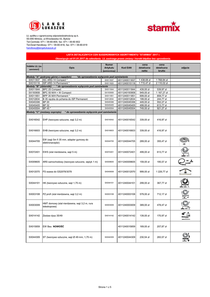 LŁ spółka z ograniczoną odpowiedzialnością sp.k. 55-095 Mirków, ul.Wrocławska 43, Byków Tel.Centrala: 071 / 39-80-800, fax: 071 / 39-80 802 Tel.Dział Handlowy: 071 / 39-80-818, fax: 071 / 39-80-819 [email protected] LISTA DETALICZNYCH CEN SUGEROWANYCH ASORTYMENTU "STARMIX" 2017 r. Obowiązuje od 01.01.2017 do odwołania. LŁ zastrzega prawo zmiany i korekt błędów bez uprzedzenia. Indeks LŁ (do zamówień) Opis Numer Artykułu Kod EAN (pomocniczy) Moduły "A" (pokrywy górne z napędem) *do sprowadzenia wyłącznie pod zamówienie SX011837 SX011837 ISC ARD-14 Compact * 4011240011837 SX011820 SX015118 ISP ARD-14 Permanent * 4011240015118 Moduły "B" (zbiorniki) * do sprowadzenia wyłącznie pod zamówienie SX011844 SX011844 BPC 25 Compact 4011240011844 SX193908 SX193908 BPC 50 M/H + W Compact 4011240193908 SX011851 SX011851 BPP 35 M/H Permanent * 4011240011851 SX012834 SX012834 B 35 rączka do pchania do ISP Permanent 4011240012834 SX045306 SX045306 BP 20 4011240045306 SX045405 SX045405 BP 32 4011240045405 SX045504 4011240045504 SX045504 BP 45 * Moduły "C" (zestawy osprzętu) cena detaliczna netto cena detaliczna brutto 1 438,08 zł 1 715,47 zł 1 768,84 zł 2 110,02 zł 439,00 zł 949,00 zł 699,00 zł 199,00 zł 449,00 zł 499,00 zł 749,00 zł 539,97 zł 1 167,27 zł 859,77 zł 244,77 zł 552,27 zł 613,77 zł 921,27 zł * do sprowadzenia wyłącznie pod zamówienie SX016542 EHP (tworzywo sztuczne, wąż 3,2 m) SX016542 4011240016542 339,00 zł 416,97 zł SX016603 EHB (tworzywo sztuczne, wąż 3,2 m) SX016603 4011240016603 339,00 zł 416,97 zł SX044705 EW (wąż 5m fi 35 mm, adapter gumowy do elektronarzędzi) SX044705 4011240044705 289,00 zł 355,47 zł SX072401 EWS (stal nierdzewna, wąż 5 m) SX072401 4011240072401 499,00 zł 613,77 zł SX009605 ARS samochodowy (tworzywo sztuczne, wężyk 1 m) SX009605 4011240009605 159,00 zł 195,57 zł SX012070 FS ssawa do GS2078/3078 SX040608 4011240012070 999,00 zł 1 228,77 zł SX044101 HK (tworzywo sztuczne, wąż 1,75 m) SX044101 4011240044101 299,00 zł 367,77 zł SX003108 PZ profi (stal nierdzewna, wąż 3,2 m) SX003108 4011240003108 579,00 zł 712,17 zł SX003009 HMT domowy (stal nierdzewna, wąż 3,2 m, rura teleskopowa) SX003009 4011240003009 389,00 zł 478,47 zł SX014142 Zestaw dysz 35/49 SX014142 4011240014142 139,00 zł 170,97 zł SX015859 EW Bau NOWOŚĆ 4011240015859 169,00 zł 207,87 zł SX044309 ST (tworzywo sztuczne, wąż Ø 49 mm, 1,75 m) 4011240044309 230,54 zł 283,57 zł SX044309 Strona 1 z 5 zdjęcie Filtry do wszystkich odkurzaczy serii IS, ISC, ISP, Metabo ASR, Bosch GAS 25/50 (modele z autootrząsaniem filtrów) SX416038 FK 4300 celuloza, wychwytywanie pyłów 99,8%, kpl. 2 szt SX416038 4011240416038 379,00 zł 466,17 zł SX416069 FKP 4300 poliester, wychwytywanie 99,93-99,99% (klasa M), kpl. 2 szt SX416069 4011240416069 479,00 zł 589,17 zł SX419190 FKP 4300 HEPA, wychwytywanie 99,995% (klasa H), kpl. 2 szt SX419190 4011240419190 799,00 zł 982,77 zł SX425740 FKPN 3000 NANO, 99,93% (klasa M, pył mokry), kpl. 2 szt SX425740 4011240425740 499,00 zł 613,77 zł Filtry do wszystkich odkurzaczy serii HS oraz AS AR-1232 EH+ * do sprowadzenia wyłącznie pod zamówienie SX415109 FPP 3600 poliester, wychwytywanie pyłów 99,9%, do modeli HS A (do modeli bez autootrząsania filtra) SX415109 4011240415109 199,00 zł 244,77 zł SX413464 FPPR 3600 poliester, wychwytywanie 99,9%, do modeli HS AR 20/32 oraz AS AR-1232 EH+ (do modeli z autootrząsaniem filtra) SX413464 4011240413464 239,00 zł 293,97 zł SX413372 FPPR 7200 poliester, wychwytywanie 99,9%, do modeli HS AR 35-55 l SX413372 4011240413372 359,00 zł 441,57 zł SX414171 FPPR 7200 HEPA, wychwytywanie 99,995%, do modeli HS AR 35-55 l * SX414171 4011240414171 579,00 zł 712,17 zł Filtry do serii GS/AS SX413525 FP 3200 celuloza, wychtwytywanie 99,8%, do GS 2078 / 3078 PZ SX413525 4011240413525 199,00 zł 244,77 zł SX411729 FP 3600 celuloza, wychwytywanie 99,8%, do modeli 20 - 35 l SX411729 4011240411729 139,00 zł 170,97 zł SX413471 FP 7200 celuloza, wychwytywanie 99,8%, do modeli 45 l SX413471 4011240413471 219,00 zł 269,37 zł 436142 4011240436142 119,00 zł 146,37 zł Worki do serii IS/HS/GS/AS/NSG/NTS SX436142 * wielokrotnego użytku FBV 14 worki materiałowe 14 l kpl 10 szt do TS 1214 RTS SX434827 FBV 20 worki materiałowe 20 l kpl 5 szt 434827 4011240434827 94,00 zł 115,62 zł SX411231 FBV 35 materiałowe 35 l , kpl. 5 szt, do wszystkich ISP, ISC ARD 25/35 l SX411231 4011240411231 139,00 zł 170,97 zł SX435039 FBV 45/50 worki materiałowe 45l kpl 5 szt 435039 4011240435039 199,00 zł 244,77 zł SX425764 PE poliester, kpl. 5 szt wyłącznie do ISP ARM / ARH * 25-35 litrów SX425764 4011240425764 229,00 zł 281,67 zł SX425757 PE Azbest, poliester, kpl. 5 szt wyłącznie do ISP ARH Asbestos * 25-35 litrów SX425757 4011240425757 259,00 zł 318,57 zł SX413044 4011240413044 219,00 zł 269,37 zł Worki do serii GS SX413044 FB 78 papierowe, 78 l, kpl. 5 szt do GS 2078 / 3078 PZ Strona 2 z 5 Pozostałe akcesoria filtrujące SX415666 SX413082 SX411743 SX413280 SX413501 SX418735 * do sprowadzenia wyłącznie pod zamówienie FSP 3500 kaptur poliestrowy do zbiorników okrągłych 3 20/22 l (2500 cm ). Wielokrotnego użycia, odporny na wodę. Pre-filtr do trudnych drobnych pyłów (gładzie, mąka, drewno, wapno itp.). Do pracy z zamontowanym filtrem głównym (druga warstwa filtracyjna). Spełnia klasę filtracji M FSP 5000 kaptur poliestrowy do zbiorników okrągłych 3 30-55 l (4000 cm ) Wielokrotnego użycia, odporny na wodę. Pre-filtr do trudnych drobnych pyłów (gładzie, mąka, drewno, wapno itp.). Do pracy z zamontowanym filtrem głównym (druga warstwa filtracyjna). Spełnia klasę filtracji M FST 3000 K kaptur bawełniany do zbiorników 3 okrągłych 20 l (3000 cm ). Wielokrotnego użycia, odporny na wodę. Pre-filtr do pracy z odpadami w postaci ziaren i zróżnicowanych odpadów. Praca z zamontowanym filtrem głównym (druga warstwa filtracyjna
