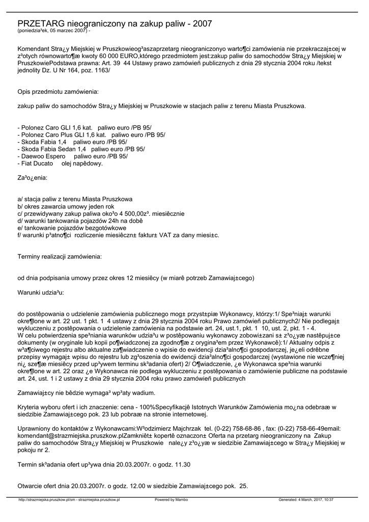 PRZETARG nieograniczony na zakup paliw - 2007 (poniedzia³ek, 05 marzec 2007) - Komendant Stra¿y Miejskiej w Pruszkowieog³aszaprzetarg nieograniczonyo warto¶ci zamówienia nie przekraczaj±cej w z³otych równowarto¶æ kwoty 60 000 EURO,którego przedmiotem jest:zakup paliw do samochodów Stra¿y Miejskiej w PruszkowiePodstawa prawna: Art. 39 44 Ustawy prawo zamówieñ publicznych z dnia 29 stycznia 2004 roku /tekst jednolity Dz. U Nr 164, poz. 1163/ Opis przedmiotu zamówienia: zakup paliw do samochodów Stra¿y Miejskiej w Pruszkowie w stacjach paliw z terenu Miasta Pruszkowa. - Polonez Caro GLI 1,6 kat. paliwo euro /PB 95/ - Polonez Caro Plus GLI 1,6 kat. paliwo euro /PB 95/ - Skoda Fabia 1,4 paliwo euro /PB 95/ - Skoda Fabia Sedan 1,4 paliwo euro /PB 95/ - Daewoo Espero paliwo euro /PB 95/ - Fiat Ducato olej napêdowy. Za³o¿enia: a/ stacja paliw z terenu Miasta Pruszkowa b/ okres zawarcia umowy jeden rok c/ przewidywany zakup paliwa oko³o 4 500,00z³. miesiêcznie d/ warunki tankowania pojazdów 24h na dobê e/ tankowanie pojazdów bezgotówkowe f/ warunki p³atno¶ci rozliczenie miesiêczn± faktur± VAT za dany miesi±c. Terminy realizacji zamówienia: od dnia podpisania umowy przez okres 12 miesiêcy (w miarê potrzeb Zamawiaj±cego) Warunki udzia³u: do postêpowania o udzielenie zamówienia publicznego mog± przyst±piæ Wykonawcy, którzy:1/ Spe³niaj± warunki okre¶lone w art. 22 ust. 1 pkt. 1 4 ustawy z dnia 29 stycznia 2004 roku Prawo zamówieñ publicznych2/ Nie podlegaj± wykluczeniu z postêpowania o udzielenie zamówienia na podstawie art. 24, ust.1, pkt. 1 10, ust. 2, pkt. 1 - 4. W celu potwierdzenia spe³niania warunków udzia³u w postêpowaniu wykonawcy zobowi±zani s± z³o¿yæ nastêpuj±ce dokumenty (w oryginale lub kopii po¶wiadczonej za zgodno¶æ z orygina³em przez Wykonawcê):1/ Aktualny odpis z w³a¶ciwego rejestru albo aktualne za¶wiadczenie o wpisie do ewidencji dzia³alno¶ci gospodarczej, je¿eli odrêbne przepisy wymagaj± wpisu do rejestru lub zg³oszenia do ewidencji dzia³alno¶ci gospodarczej (wystawione nie wcze¶niej ni¿ sze¶æ miesiêcy przed up³ywem terminu sk³adania ofert) 2/ O¶wiadczenie, ¿e Wykonawca spe³nia warunki okre¶lone w art. 22 oraz ¿e Wykonawca nie podlega wykluczeniu z postêpowania o zamówienie publiczne na podstawie art. 24, ust. 1 i 2 ustawy z dnia 29 stycznia 2004 roku prawo zamówieñ publicznych Zamawiaj±cy nie bêdzie wymaga³ wp³aty wadium. Kryteria wyboru ofert i ich znaczenie: cena - 100%Specyfikacjê Istotnych Warunków Zamówienia mo¿na odebraæ w siedzibie Zamawiaj±cego pok. 23 lub pobraæ na stronie internetowej. Uprawniony do kontaktów z Wykonawcami:W³odzimierz Majchrzak tel. (0-22) 758-68-86 , fax: (0-22) 758-66-49email: [email protected]êt± kopertê oznaczon± Oferta na przetarg nieograniczony na Zakup paliw do samochodów Stra¿y Miejskiej w Pruszkowie nale¿y z³o¿yæ w siedzibie Zamawiaj±cego w Stra¿y Miejskiej w pokoju nr 2. Termin sk³adania ofert up³ywa dnia 20.03.2007r. o godz. 11.30 Otwarcie ofert dnia 20.03.2007r. o godz. 12.00 w siedzibie Zamawiaj±cego pok. 25. http://strazmiejska.pruszkow.pl/sm - strazmiejska.pruszkow.pl Powered by Mambo Generated: 4 March, 2017, 10:37 Wykonawca pozostaje zwi±zany ofert± przez okres 30 dni tj. do dnia 18.04.200 r. Zamawiaj±cy nie przewiduje zawarcia umowy ramowej. Zamawiaj±cy nie przewiduje wyboru najkorzystniejszej oferty z zastosowaniem aukcji elektronicznej.Og³oszenie zamieszczono na stronach Portalu Internetowego Urzêdu Zamówieñ Publicznych w dniu 05.03.2007r.http://www.portal.uzp.gov.pl/ Do pobrania: Specyfikacja Formularz ofertowy O¶wiadczenie Wzór umowy http://strazmiejska.pruszkow.pl/sm - strazmiejska.pruszkow.pl Powered by Mambo Generated: 4 March, 2017, 10:37