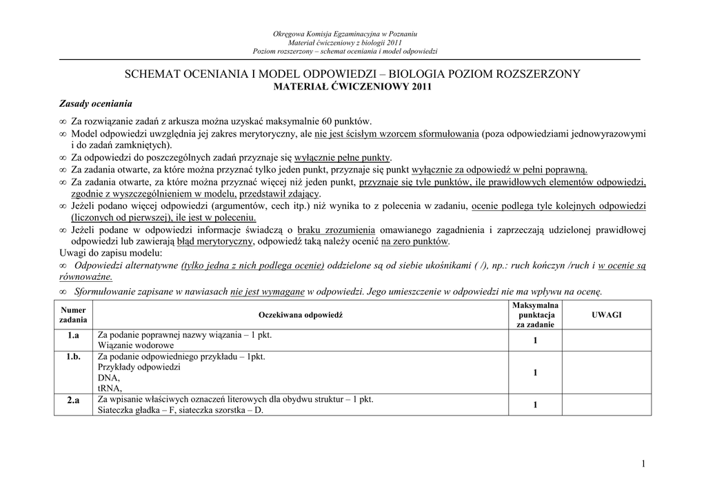 Okręgowa Komisja Egzaminacyjna w Poznaniu Materiał ćwiczeniowy z biologii 2011 Poziom rozszerzony – schemat oceniania i model odpowiedzi SCHEMAT OCENIANIA I MODEL ODPOWIEDZI – BIOLOGIA POZIOM ROZSZERZONY MATERIAŁ ĆWICZENIOWY 2011 Zasady oceniania • Za rozwiązanie zadań z arkusza można uzyskać maksymalnie 60 punktów. • Model odpowiedzi uwzględnia jej zakres merytoryczny, ale nie jest ścisłym wzorcem sformułowania (poza odpowiedziami jednowyrazowymi i do zadań zamkniętych). • Za odpowiedzi do poszczególnych zadań przyznaje się wyłącznie pełne punkty. • Za zadania otwarte, za które można przyznać tylko jeden punkt, przyznaje się punkt wyłącznie za odpowiedź w pełni poprawną. • Za zadania otwarte, za które można przyznać więcej niż jeden punkt, przyznaje się tyle punktów, ile prawidłowych elementów odpowiedzi, zgodnie z wyszczególnieniem w modelu, przedstawił zdający. • Jeżeli podano więcej odpowiedzi (argumentów, cech itp.) niż wynika to z polecenia w zadaniu, ocenie podlega tyle kolejnych odpowiedzi (liczonych od pierwszej), ile jest w poleceniu. • Jeżeli podane w odpowiedzi informacje świadczą o braku zrozumienia omawianego zagadnienia i zaprzeczają udzielonej prawidłowej odpowiedzi lub zawierają błąd merytoryczny, odpowiedź taką należy ocenić na zero punktów. Uwagi do zapisu modelu: • Odpowiedzi alternatywne (tylko jedna z nich podlega ocenie) oddzielone są od siebie ukośnikami ( /), np.: ruch kończyn /ruch i w ocenie są równoważne. • Sformułowanie zapisane w nawiasach nie jest wymagane w odpowiedzi. Jego umieszczenie w odpowiedzi nie ma wpływu na ocenę. Numer zadania 1.a 1.b. 2.a Oczekiwana odpowiedź Za podanie poprawnej nazwy wiązania – 1 pkt. Wiązanie wodorowe Za podanie odpowiedniego przykładu – 1pkt. Przykłady odpowiedzi DNA, tRNA, Za wpisanie właściwych oznaczeń literowych dla obydwu struktur – 1 pkt. Siateczka gładka – F, siateczka szorstka – D. Maksymalna punktacja za zadanie UWAGI 1 1 1 1 Okręgowa Komisja Egzaminacyjna w Poznaniu Materiał ćwiczeniowy z biologii 2011 Poziom rozszerzony – schemat oceniania i model odpowiedzi 2.b 3.a 3.b 4. 5. 6 7. Za podanie odpowiedniego przykładu funkcji każdego typu siateczki – po 1 pkt. Przykłady odpowiedzi Siateczka gładka – synteza fosfolipidów / synteza kwasów tłuszczowych / synteza steroidów. Siateczka szorstka - synteza białek / transport wyprodukowanych białek w obrębie komórki Funkcje ogólne siateczki wewnątrzplazmatycznej, które mogą być przypisane do jednego z typów: - oddziela w obrębie komórki przestrzenie, w których mogą zachodzić różne reakcje - tworzy przedział, w obrębie którego w komórce mogą być transportowane różne substancje. Za poprawny opis zestawu kontrolnego – 1 pkt. Kawałek ugotowanego ziemniaka i kawałek ugotowanej wątroby , woda utleniona, zakraplacz. Za poprawnie sformułowany wniosek do przedstawionego doświadczenia - 1pkt. Przykład odpowiedzi Katalaza występuje w komórkach roślinnych i zwierzęcych. Katalaza, występująca w komórkach roślinnych i zwierzęcych, rozkłada wodę utlenioną. Za podanie poprawnej nazwy struktury – 1 pkt. Peroksysomy Za poprawne podanie funkcji każdego z wymienionych nabłonków – po 1 pkt. Przykłady odpowiedzi 1. mikrokosmki – zwiększanie powierzchni wchłaniania składników pokarmowych. 2. rzęski – przesuwanie śluzu w drogach oddechowych/ przesuwanie zanieczyszczeń które przyczepiły się do śluzu w drogach oddechowych / przesuwanie komórki jajowej w jajowodzie. Za podkreślenie tylko wszystkich tkanek martwych – 1 pkt. korek, naczynia, sklerenchyma Za poprawne uzupełnienie każdego wiersza tabeli – po 1 pkt. Cecha Mitochondria Chloroplasty pirogronian, tlen, ADP CO2, H2O Funkcje nie mogą się powtarzać – jeżeli tak jest – zdający otrzymuje 1 pkt. 2 1 Uczeń może nie uwzględnić wody utlenionej oraz zakraplacza. 1 1 2 1 2 Podstawowe substraty 8. Główne produkty CO2, H2O, ATP Za zaznaczenie każdego z dwóch fałszywych stwierdzeń – po 1pkt. A, C aldehyd glicerynowy, tlen 2 2 Okręgowa Komisja Egzaminacyjna w Poznaniu Materiał ćwiczeniowy z biologii 2011 Poziom rozszerzony – schemat oceniania i model odpowiedzi 9.a 9.b 10. 11. 12. 13. 14. 15.a 15. b 16. 17 18. Za poprawne wyjaśnienie, uwzględniające budowę cząsteczek lub zachodzące procesy – 1 pkt. Przykład odpowiedzi CO2 nie wydziela się , ponieważ ze związku zbudowanego z trzech atomów węgla (pirogronianu) powstaje związek, który również zawiera 3 atomy węgla. Ponieważ substrat i produkt mają taką samą liczbę atomów węgla. Nie wydziela się CO2, ponieważ nie zachodzi karboksylacja. Za poprawne określenie funkcji NAD w pierwszym i drugim etapie reakcji – 1 pkt. W pierwszym etapie NAD jest utleniaczem, a w drugim reduktorem. W pierwszym etapie NAD odbiera elektrony/wodór, a w drugim dostarcza je do reakcji. Za poprawny opis inhibicji niekompetycyjnej, uwzględniający przyłączanie inhibitora do enzymu i zmianę kształtu jego centrum aktywnego – 1pkt. Przykłady odpowiedzi Inhibitor przyłączając się do enzymu (w miejscu innym niż centrum aktywne) powoduje zmianę jego centrum aktywnego w ten sposób, że uniemożliwia przyłączenie substratu, co uniemożliwia powstanie produktu. Inhibitor łączy się z enzymem, ale nie w centrum aktywnym, modyfikuje centrum aktywne w taki sposób, że enzym traci powinowactwo do substratu. Za określenie, że jest to proces anaboliczny i poprawne uzasadnienie – 1pkt. Jest to proces anaboliczny, ponieważ wymaga nakładu energii / z prostej cząsteczki (NH3) powstaje cząsteczka bardziej złożona (mocznik) / jest to reakcja syntezy. Za wskazanie każdego z dwóch błędnych stwierdzeń – po 1pkt. B, D Za wskazanie odpowiedzi B – 1pkt. Za poprawne zapisanie każdych dwóch fenotypów – po 1 pkt. AaDd- białe aaDd – żółte AAdd - białe aadd - zielo