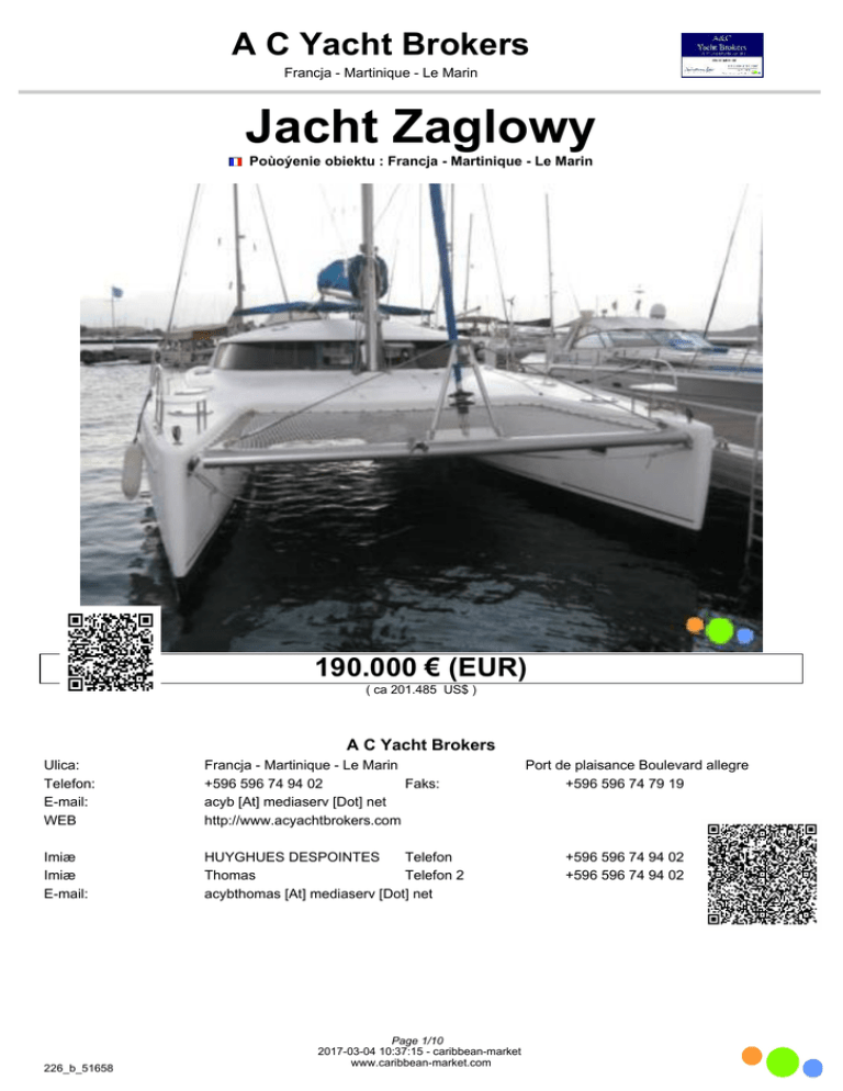 A C Yacht Brokers Francja - Martinique - Le Marin Jacht Zaglowy Poùoýenie obiektu : Francja - Martinique - Le Marin 190.000 € (EUR) ( ca 201.485 US$ ) A C Yacht Brokers Ulica: Telefon: E-mail: WEB Francja - Martinique - Le Marin +596 596 74 94 02 Faks: acyb [At] mediaserv [Dot] net http://www.acyachtbrokers.com Imiæ Imiæ E-mail: HUYGHUES DESPOINTES Telefon Thomas Telefon 2 acybthomas [At] mediaserv [Dot] net 226_b_51658 Page 1/10 2017-03-04 10:37:15 - caribbean-market www.caribbean-market.com Port de plaisance Boulevard allegre +596 596 74 79 19 +596 596 74 94 02 +596 596 74 94 02 A C Yacht Brokers Francja - Martinique - Le Marin Typ ùodzi Numer kodu Typ ùodzi Producent: Model Designer Stan Materiaù Olinowanie Rok Kolor Dùugoúã LOA Dùugoúã LWL Wysokoúã pomieszczeñ Waga 226_b_51658 Jacht Zaglowy Fountaine Pajot Belize 43 potrzebne CSF Slup 2004 biaùy 13,00 m ( 42,7 ft ) Numer kodu Zgùoú Ksztaùt kadùuba Kokpit Naprawianych roku Kontrola Szerokoúã Szkic Waga (Ballast) Dane na temat silnika - Napædy Proste Prædkoúã maksymalna Tankdaten Iloúã paliwa Woda Kanalizacja 226_b_51658 300 L( 79 Gal ) 600 L( 159 Gal ) Page 2/10 2017-03-04 10:37:15 - caribbean-market www.caribbean-market.com Francja Katamaran Kolarstwo 7,00 m ( 23,0 ft ) 1,30 m ( 4,3 ft ) A C Yacht Brokers Francja - Martinique - Le Marin Sprzæt Okræty Instruments Zaloguj Compass GPS Anemometr Scoreboard Sonar Radar Ploter NavText Fax Pogoda VHF Radio SSB Pactor El Autopilot Wiatr Kontroli Fishfinder AIS Komputer Wyposaýenie techniczne Odtwarzacz CD Radio Telewizja Ùàcznoúã satelitarna Systemu 12 V DC Systemu 24 V DC Ùadowarka Solar Cells Wiatr Generator Wave Generator Generator 110-220 V Invertor 110-220 V Moc Shore Ogrzewanie Klimatyzacja Druckwasseranlage Systemu ciepùej wody Gazowniæ Watermaker Ster strumieniowy Divecompressor Bilgepump elektrycznie Bilgepump Maunel 226_b_51658 Urzadzenie & podzial Boat Equipment 4 8 4 4 2 Anchor Winda kotwiczna Teak Kàpieliska Ladder Prysznic rufowy Rack Equipment Trap Daivits Davit Ùódki Ùódki m. AB Bukszpryt Trim Tabs Wyposaýenie wnætrz Flybridge 2. Helm na lot Boat Trailer Kabiny Koje Toalety Zùy Wùaúciciele kabiny Spiýarnia Zatopiã Kuchenka gazowa Kuchenka elektryczna Piec Benzyna Piekarnik gazowy Piekarnik Elektryczny Lodówka Zamraýarka Kuchenka mikrofalowa Zmywarka Pralnia Bezpieczeñstwo Kamizelki ratunkowe Liferaft EPRIB Szperacze System Gaúnice Page 3/10 2017-03-04 10:37:15 - caribbean-market www.caribbean-market.com Inne dodatki Szyber dach Hafenpersenning Latajàcy most Ganzpersenning Cieñ niedz Fly Markiza na rufie pokùad Bimini Sprayhood A C Yacht Brokers Francja - Martinique - Le Marin 226_b_51658 Page 4/10 2017-03-04 10:37:15 - caribbean-market www.caribbean-market.com A C Yacht Brokers Francja - Martinique - Le Marin 226_b_51658 Page 5/10 2017-03-04 10:37:15 - caribbean-market www.caribbean-market.com A C Yacht Brokers Francja - Martinique - Le Marin 226_b_51658 Page 6/10 2017-03-04 10:37:15 - caribbean-market www.caribbean-market.com A C Yacht Brokers Francja - Martinique - Le Marin 226_b_51658 Page 7/10 2017-03-04 10:37:15 - caribbean-market www.caribbean-market.com A C Yacht Brokers Francja - Martinique - Le Marin 226_b_51658 Page 8/10 2017-03-04 10:37:15 - caribbean-market www.caribbean-market.com A C Yacht Brokers Francja - Martinique - Le Marin 226_b_51658 Page 9/10 2017-03-04 10:37:15 - caribbean-market www.caribbean-market.com A C Yacht Brokers Francja - Martinique - Le Marin 226_b_51658 Page 10/10 2017-03-04 10:37:15 - caribbean-market www.caribbean-market.com