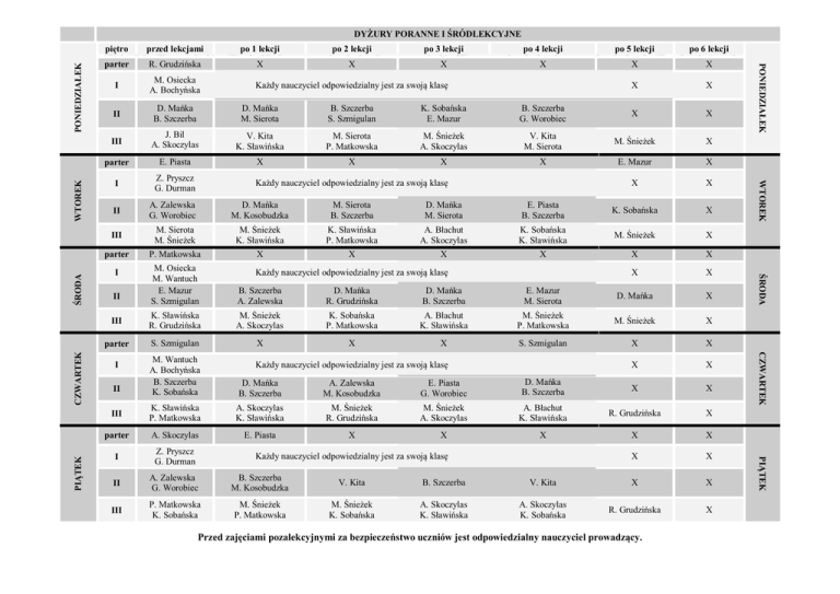 WTOREK ŚRODA CZWARTEK po 3 lekcji po 4 lekcji po 5 lekcji po 6 lekcji X X X X X I M. Osiecka A. Bochyńska Każdy nauczyciel odpowiedzialny jest za swoją klasę X X II D. Mańka B. Szczerba D. Mańka M. Sierota B. Szczerba S. Szmigulan K. Sobańska E. Mazur B. Szczerba G. Worobiec X X III J. Bil A. Skoczylas V. Kita K. Sławińska M. Sierota P. Matkowska M. Śnieżek A. Skoczylas V. Kita M. Sierota M. Śnieżek X parter E. Piasta X X X X E. Mazur X I Z. Pryszcz G. Durman X X II A. Zalewska G. Worobiec D. Mańka M. Kosobudzka M. Sierota B. Szczerba D. Mańka M. Sierota E. Piasta B. Szczerba K. Sobańska X III M. Sierota M. Śnieżek M. Śnieżek K. Sławińska K. Sławińska P. Matkowska A. Błachut A. Skoczylas K. Sobańska K. Sławińska M. Śnieżek X parter P. Matkowska X X X X X X M. Osiecka M. Wantuch E. Mazur S. Szmigulan Każdy nauczyciel odpowiedzialny jest za swoją klasę X X B. Szczerba A. Zalewska D. Mańka R. Grudzińska D. Mańka B. Szczerba E. Mazur M. Sierota D. Mańka X III K. Sławińska R. Grudzińska M. Śnieżek A. Skoczylas K. Sobańska P. Matkowska A. Błachut K. Sławińska M. Śnieżek P. Matkowska M. Śnieżek X parter S. Szmigulan X X X S. Szmigulan X X X X I II Każdy nauczyciel odpowiedzialny jest za swoją klasę M. Wantuch A. Bochyńska B. Szczerba K. Sobańska D. Mańka B. Szczerba A. Zalewska M. Kosobudzka E. Piasta G. Worobiec D. Mańka B. Szczerba X X III K. Sławińska P. Matkowska A. Skoczylas K. Sławińska M. Śnieżek R. Grudzińska M. Śnieżek A. Skoczylas A. Błachut K. Sławińska R. Grudzińska X parter A. Skoczylas E. Piasta X X X X X I Z. Pryszcz G. Durman X X II A. Zalewska G. Worobiec B. Szczerba M. Kosobudzka V. Kita B. Szczerba V. Kita X X III P. Matkowska K. Sobańska M. Śnieżek P. Matkowska M. Śnieżek K. Sobańska A. Skoczylas K. Sławińska A. Skoczylas K. Sobańska R. Grudzińska X I II Każdy nauczyciel odpowiedzialny jest za swoją klasę Każdy nauczyciel odpowiedzialny jest za swoją klasę Przed zajęciami pozalekcyjnymi za bezpieczeństwo uczniów jest odpowiedzialny nauczyciel prowadzący. PIĄTEK PIĄTEK po 2 lekcji X CZWARTEK po 1 lekcji R. Grudzińska ŚRODA przed lekcjami WTOREK piętro parter PONIEDZIAŁEK PONIEDZIAŁEK DYŻURY PORANNE I ŚRÓDLEKCYJNE