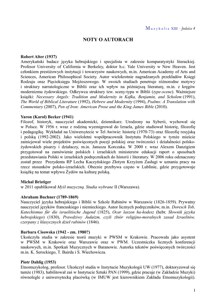 Mu z y k a l i a XIII · Judaica 4 NOTY O AUTORACH Robert Alter (1937) Amerykański badacz języka hebrajskiego i specjalista w zakresie komparatystyki literackiej. Profesor University of California w Berkeley, doktor h.c. Yale University w New Heaven. Jest członkiem prestiżowych instytucji i towarzystw naukowych, m.in. American Academy of Arts and Sciences, American Philosophical Society. Autor wielokrotnie nagradzanych przekładów Księgi Rodzaju oraz Pięcioksięgu Mojżeszowego. W swoich studiach penetruje różnorodne motywy i struktury narratologiczne w Biblii oraz ich wpływ na późniejszą literaturę, m.in. z kręgów modernizmu żydowskiego. Odkrywca struktury tzw. sceny-typu w Biblii (type-scene). Ważniejsze książki: Necessary Angels: Tradition and Modernity in Kafka, Benjamin, and Scholem (1991), The World of Biblical Literature (1992), Hebrew and Modernity (1994), Psalms: A Translation with Commentary (2007), Pen of Iron: American Prose and the King James Bible (2010). Yaron (Karol) Becker (1941) Filozof, historyk, nauczyciel akademicki, dziennikarz. Urodzony na Syberii, wychował się w Polsce. W 1956 r. wraz z rodziną wyemigrował do Izraela, gdzie studiował historię, filozofię i pedagogikę. Wykładał na Uniwersytecie w Tel Awiwie: historię (1970-73) oraz filozofię rosyjską i polską (1992-2002). Jako wieloletni współpracownik Instytutu Polskiego w tymże mieście zainicjował wiele projektów poświęconych poezji polskiej oraz twórczości i działalności polskożydowskich pisarzy i działaczy, m.in. Janusza Korczaka. W 2000 r. wraz Alexem Danzigiem przygotował na zamówienie polskich i izraelskich ministerstw edukacji raport o sposobach przedstawiania Polski w izraelskich podręcznikach do historii i literatury. W 2006 roku odznaczony został przez Prezydenta RP Lecha Kaczyńskiego Złotym Krzyżem Zasługi w uznaniu pracy na rzecz stosunków polsko-izraelskich. Obecnie przebywa często w Lublinie, gdzie przygotowuje książkę na temat wpływu Żydów na kulturę polską. Michał Bristiger w 2011 opublikował Myśl muzyczną. Studia wybrane II (Warszawa). Abraham Buchner (1789-1869) Nauczyciel języka hebrajskiego i Biblii w Szkole Rabinów w Warszawie (1826-1859). Prywatny nauczyciel języków francuskiego i niemieckiego. Autor licznych podręczników, m.in. Doresch Tob, Katechismus für die israelitische Jugend (1825), Ocar laszon ha-kodesz (hebr. Słownik języka hebrajskiego) (1830), Prawdziwy Judaizm, czyli zbiór religijno-moralnych zasad Izraelitów, czerpany z klasycznych dzieł rabinów (1846). Barbara Cisowska (1942 - zm. 1980?) Ukończyła studia w zakresie teorii muzyki w PWSM w Krakowie. Pracowała jako asystent w PWSM w Krakowie oraz Warszawie oraz w PWM. Uczestniczka licznych konferencji naukowych, m.in. Spotkań Muzycznych w Baranowie. Autorka tekstów poświęconych twórczości m.in. K. Serockiego, T. Bairda i S. Wiechowicza. Piotr Dahlig (1953) Etnomuzykolog, profesor. Ukończył studia w Instytucie Muzykologii UW (1977), doktoryzował się tamże (1983), habilitował zaś w Instytucie Sztuki PAN (1999), gdzie pracuje (w Zakładzie Muzyki) równolegle z uniwersytecką placówką (w IMUW jest kierownikiem Zakładu Etnomuzykologii). 1 Mu z y k a l i a XIII · Judaica 4 Jako szef Archiwum Fonograficznego im. Mariana Sobieskiego dokumentował w szerokiej skali polski folklor muzyczny. Specjalizuje się w historii ludowych instrumentów muzycznych, kulturze muzycznej przesiedleńców oraz muzycznym i teatralnym ruchu amatorskim. Autor książek: Muzyka ludowa we współczesnym społeczeństwie (1987), Tradycje muzyczne a ich przemiany (1998). Przygotowuje monografię cymbałów w muzyce ludowej. Zuzanna Ginczanka (1917-1944) Polsko-żydowska poetka, związana z prądami ekspresjonizmu i katastrofizmu. Urodzona w Kijowie w rodzinie zasymilowanych rosyjskich Żydów. Po wybuchu rewolucji październikowej zamieszkała w Równem na Wołyniu. Ukończywszy tamże gimnazjum podjęła studia pedagogiczne w Warszawie, gdzie związała się ze środowiskiem Skamandrytów, publikując swoje wiersze na łamach m.in. „Szpilek” i ‘Wiadomości Literackich”. Wraz z wybuchem II wojny światowej przeniosła się do Lwowa, gdzie działała w Związku Radzieckich Pisarzy Ukrainy, później zaś ukrywała się przed Niemcami. Zadenuncjowana, cudem uniknęła aresztowania, następnie przeniosła się do Krakowa. Jesienią 1944 nie zdążyła uciec przed aresztowaniem przez gestapo. Wkrótce później została rozstrzelana w Płaszowie. W swoim dorobku miała kilkadziesiąt wierszy (wydanych m.in. w t. O centaurach, 1936 oraz tomach wydanych po wojnie – m. in. wiersz *** (Non omnis moriar...)). Golan Gur Doktorant na Humboldt- Universität w Berlinie. Urodzony w Izraelu, ukończył tamże muzykologię na Uniwersytecie w Tel Awiwie (2008), gdzie później pracował jako asystent (2003-2006). Podczas stypendium odbywanym na Uniwersytecie Ludwiga Maksymiliana w Monachium pracował w zarządzie wydawniczym Bayerisches Musiker-Lexikon Online. Jego zainteresowania badawcze obejmują teorię muzyki, muzykę XX i XXI w., muzykę żydowską, filozofię, semiotykę, metodologię oraz dzieje myśli muzycznej. Frank Harders-Wuthenow (1962) Studiował muzykologię, filozofię oraz romanistykę w Moguncji i Hamburgu jak również kompozycję i teorię muzyki w Hochschule für Musik w Hamburgu. W latach 1990 – 1996 pełnił (z przerwami) funkcję dramaturga muzycznego w Theater Bielefeld. Od 1993 r. jest współpracownikiem Société Internationale Franz Schreker w Paryżu. Od 1996 r. pracuje w berlińskim oddziale wydawnictwa muzycznego Boosey & Hawkes/Bote und Bock a od 2002 r. kieruje działem promocji tego wydawnictwa. Od 1996 r. zajmuje się wydawaniem płyt CD w berlińskiej wytwórni EDA, gdzie szczególnie popularyzuje nieznaną muzykę polską. Autor licznych produkcji płytowych również w innych wydawnictwach (Capriccio, CPO, Koch/Schwann, Audite) o