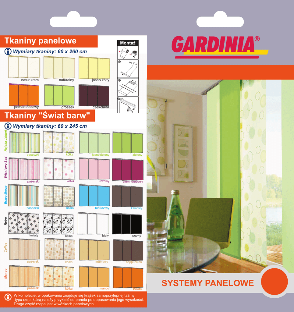 Tkaniny panelowe Monta¿ Wymiary tkaniny: 60 x 260 cm natur krem naturalny jasno ¿ó³ty pomarañczowy groszek czekolada Tkaniny "Œwiat barw" Rajska Jab³oñ Wymiary tkaniny: 60 x 245 cm kó³ka jasnozielony zielony paseczki kó³ka ró¿owy ciemnoró¿owy paseczki kó³ka turkusowy kawowy Retro Brzeg Morza Wiœniowy Sad paseczki kó³ka bia³y czarny paseczki kó³ka kremowy cappuccino paseczki kó³ka Mango Coffee kwiaty mango papaja W komplecie, w opakowaniu znajduje siê kr¹¿ek samoprzylepnej taœmy typu rzep, któr¹ nale¿y przykleiæ do panela po dopasowaniu jego wysokoœci. Druga czêœæ rzepa jest w wózkach panelowych. SYSTEMY PANELOWE Szyna Atlanta Basic (w elementach) Szyna Atlanta Basic - warto wiedzieæ ! - szyna trzytorowa o szerokoœci 5,5 cm lub piêciotorowa o szerokoœci 10cm 3. Uchwyt szybkomocuj¹cy do szyny 3 torowej 1. Szyna aluminiowa 3 torowa - dostêpne d³ugoœci szyn: szyna trzytorowa: 160cm, 210cm, 260cm, 310cm szyna piêciotorowa: 210cm, 260cm, 310cm 2. Uchwyt œcienny regulowany 6. Uchwyt szybkomocuj¹cy do szyny 5 torowej - mo¿liwoœæ przed³u¿ania d³ugoœci szyny za pomoc¹ ³¹cznika szyn 4. Szyna aluminiowa 5 torowa - szyna aluminiowa w kolorze bia³ym lub srebrnym 5. £¹czniki wózków - monta¿ do sufitu lub œciany 7. Wózek panelowy 60 cm z obci¹¿nikiem tkaniny 8. £¹cznik szyn 9. Zakoñczenia szyn - istnieje mo¿liwoœæ zawieszenia na szynie firany lub zas³ony za pomoc¹ akcesoriów od plastikowej szyny sufitowej 10. Dr¹¿ek przesuwaj¹cy Szyna rozsuwana (komplet) Szyna rozsuwana - warto wiedzieæ ! - szyna dwutorowa z 4 wózkami panelowymi oraz szyna trzytorowa z 6 wózkami panelowymi - mo¿liwoœæ rozsuwania szyny dwutorowej na d³. od 140 do 225 cm oraz trzytorowej od 225 cm do 335 cm. - wózki zsuwaj¹ siê w skrajne po³o¿enie 1. Komplet szyny rozsuwanej W komplecie: - szyna, wózki panelowe, patyk do przesuwania wózków, obci¹¿niki do paneli, elementy monta¿owe Oba systemy pozwalaj¹ na ³¹czenie tkanin z kolekcji "Œwiat barw" i "Tkaniny panelowe" www.gardinia.pl - szyna aluminiowa w kolorze srebrnym - monta¿ do sufitu lub œciany www.gardinia.pl