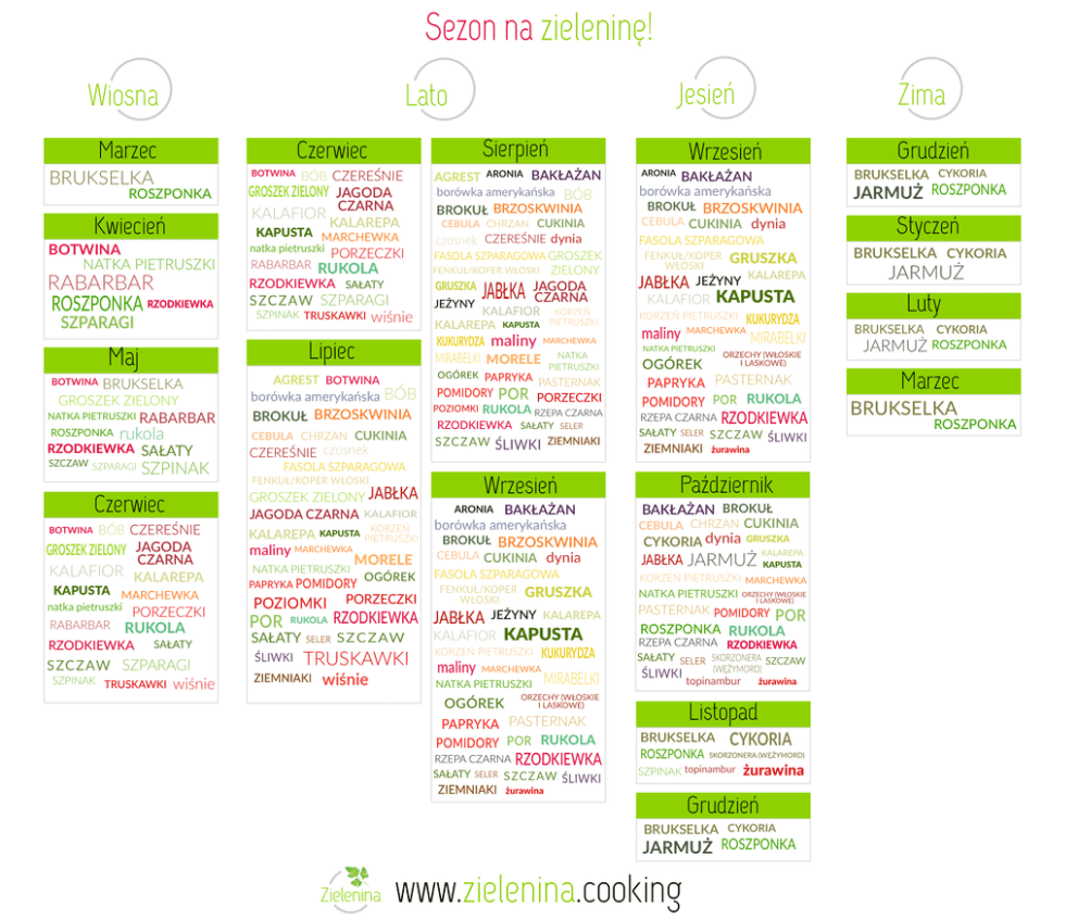 Sezon na zieleninę! Wiosna Marzec BRUKSELKA BOTWINA ROSZPONKA Kwiecień RABARBAR ROSZPONKA RZODKIEWKA SZPARAGI BRUKSELKA GROSZEK ZIELONY NATKA PIETRUSZKI RABARBAR rukola RZODKIEWKA SAŁATY SZCZAW SZPARAGI SZPINAK Czerwiec BOTWINA BÓB CZEREŚNIE GROSZEK ZIELONY JAGODA CZARNA KALAFIOR KALAREPA KAPUSTA MARCHEWKA natka pietruszki RABARBAR PORZECZKI RUKOLA RZODKIEWKA BÓB CZEREŚNIE GROSZEK ZIELONY JAGODA CZARNA KALAFIOR KAPUSTA MARCHEWKA natka pietruszki RABARBAR PORZECZKI RUKOLA RZODKIEWKA SAŁATY SZCZAW SZPARAGI SZPINAK TRUSKAWKI wiśnie SAŁATY S ZCZ AW SZPARAGI SZPINAK TRUSKAWKI wiśnie Sierpień AGREST BOTWINA borówka amerykańska BÓB BROKUŁ BRZOSKWINIA CEBULA CHRZAN CUKINIA CZEREŚNIE czosnek czosnek CZEREŚNIE dynia FASOLA SZPARAGOWA GROSZEK FENKUŁ/KOPER WŁOSKI ZIELONY GRUSZKA JAGODA FASOLA SZPARAGOWA CEBULA CHRZAN CUKINIA JEŻYNY maliny MARCHEWKA NATKA PIETRUSZKI POZIOMKI POR RUKOLA SAŁATY ŚLIWKI SELER KORZEŃ PIETRUSZKI MORELE PAPRYKA POMIDORY OGÓREK PORZECZKI CZARNA OGÓREK PAPRYKA S ZC Z AW wiśnie KORZEŃ PIETRUSZKI MARCHEWKA NATKA PIETRUSZKI PASTERNAK POMIDORY POR PORZECZKI POZIOMKI RUKOLA RZEPA CZARNA RZODKIEWKA SAŁATY SELER SZCZAW ŚLIWKI ZIEMNIAKI Wrzesień BAKŁAŻAN borówka amerykańska ARONIA BROKUŁ BRZOSKWINIA CEBULA CUKINIA dynia FASOLA SZPARAGOWA FENKUŁ/KOPER WŁOSKI RZODKIEWKA JABŁKA TRUSKAWKI ZIEMNIAKI JABŁKA KALAFIOR KALAREPA KAPUSTA FENKUŁ/KOPER WŁOSKI KALAREPA KAPUSTA Wrzesień BAKŁAŻAN borówka amerykańska FASOLA SZPARAGOWA GROSZEK ZIELONY JABŁKA JAGODA CZARNA KALAFIOR Zima AGREST ARONIA BAKŁAŻAN borówka amerykańska BÓB BROKUŁ BRZOSKWINIA KUKURYDZA maliny MIRABELKI MORELE Lipiec Maj ROSZPONKA Czerwiec KALAREPA BOTWINA NATKA PIETRUSZKI BOTWINA Jesień Lato GRUSZKA JEŻYNY KALAREPA KALAFIOR KAPUSTA KORZEŃ PIETRUSZKI maliny MARCHEWKA KUKURYDZA NATKA PIETRUSZKI OGÓREK MIRABELKI BROKUŁ BRZOSKWINIA CEBULA CUKINIA FENKUŁ/KOPER WŁOSKI JABŁKA RZODKIEWKA RZEPA CZARNA SAŁATY SELER S ZCZ AW żurawina ŚLIWKI dynia GRUSZKA JEŻYNY KALAREPA KAPUSTA KALAFIOR KORZEŃ PIETRUSZKI maliny MARCHEWKA NATKA PIETRUSZKI KUKURYDZA MIRABELKI ORZECHY (WŁOSKIE I LASKOWE) OGÓREK PAPRYKA PASTERNAK POMIDORY POR RUKOLA RZODKIEWKA RZEPA CZARNA SAŁATY SELER S ZCZ AW ZIEMNIAKI żurawina ŚLIWKI Październik BAKŁAŻAN BROKUŁ CEBULA CHRZAN CUKINIA CYKORIA dynia GRUSZKA KALAREPA JABŁKA JARMUŻ KAPUSTA KORZEŃ PIETRUSZKI MARCHEWKA NATKA PIETRUSZKI ORZECHY (WŁOSKIE I LASKOWE) PASTERNAK POMIDORY POR ROSZPONKA RUKOLA RZEPA CZARNA RZODKIEWKA SAŁATY SELER SKORZONERA SZCZAW ŚLIWKI ORZECHY (WŁOSKIE I LASKOWE) PAPRYKA PASTERNAK POMIDORY POR RUKOLA ZIEMNIAKI ARONIA (WĘŻYMORD) topinambur żurawina Listopad BRUKSELKA CYKORIA ROSZPONKA SKORZONERA (WĘŻYMORD) SZPINAK topinambur żurawina Grudzień BRUKSELKA CYKORIA JARMUŻ ROSZPONKA www.zielenina.cooking Grudzień BRUKSELKA CYKORIA JARMUŻ ROSZPONKA Styczeń BRUKSELKA CYKORIA JARMUŻ Luty BRUKSELKA CYKORIA JARMUŻ ROSZPONKA Marzec BRUKSELKA ROSZPONKA