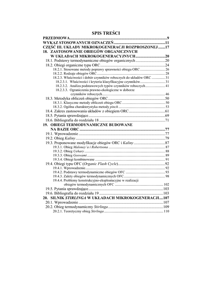 Spis treści 5 SPIS TREŚCI PRZEDMOWA...................................................................................................9 WYKAZ STOSOWANYCH OZNACZEŃ ....................................................11 CZĘŚĆ III. UKŁADY MIKROKOGENERACJI ROZPROSZONEJ .......17 18. ZASTOSOWANIE OBIEGÓW ORGANICZNYCH W UKŁADACH MIKROKOGENERACYJNYCH ..............................20 18.1. Podstawy termodynamiczne obiegów organicznych ..............................20 18.2. Obiegi organiczne typu ORC ..................................................................24 18.2.1. Stosowane metody poprawy sprawności obiegu ORC ............................ 26 18.2.2. Rodzaje obiegów ORC ............................................................................ 28 18.2.3. Właściwości i dobór czynników roboczych do układów ORC ............... 31 18.2.3.1. Właściwości i kryteria klasyfikacyjne czynników............................ 31 18.2.3.2. Analiza podstawowych typów czynników roboczych ...................... 41 18.2.3.3. Ograniczenia prawno-ekologiczne w doborze czynników roboczych ...................................................................... 46 18.3. Metodyka obliczeń obiegów ORC ..........................................................50 18.3.1. Klasyczne metody obliczeń obiegu ORC ................................................ 50 18.3.2. Ogólna charakterystyka metody pinch .................................................... 53 18.4. Zakres zastosowania układów z obiegiem ORC .....................................61 18.5. Pytania sprawdzające ..............................................................................69 18.6. Bibliografia do rozdziału 18 ...................................................................71 19. OBIEGI TERMODYNAMICZNE BUDOWANE NA BAZIE ORC .......................................................................................77 19.1. Wprowadzenie ........................................................................................77 19.2. Obieg Kaliny ...........................................................................................79 19.3. Proponowane modyfikacje obiegów ORC i Kaliny ................................87 19.3.1. Obieg Maloney’a i Robertsona ............................................................... 87 19.3.2. Obieg Uehary .......................................................................................... 88 19.3.3. Obieg Goswami ....................................................................................... 89 19.3.4. Obiegi kombinowane .............................................................................. 91 19.4. Obiegi typu OFC (Organic Flash Cycle)................................................92 19.4.1. Wprowadzenie......................................................................................... 92 19.4.2. Podstawy termodynamiczne obiegów OFC ............................................ 93 19.4.3. Zalety obiegów termodynamicznych OFC .............................................. 98 19.4.4. Problemy konstrukcyjno-eksploatacyjne w realizacji obiegów termodynamicznych OFC ...................................................... 102 19.5. Pytania sprawdzające ............................................................................103 19.6. Bibliografia do rozdziału 19 .................................................................103 20. SILNIK STIRLINGA W UKŁADACH MIKROKOGENERACJI ....107 20.1. Wprowadzenie ......................................................................................107 20.2. Obieg termodynamiczny Stirlinga ........................................................109 20.2.1. Teoretyczny obieg Stirlinga .................................................................. 110 6 Spis treści 20.2.2. Porównawczy obieg Rallisa dla silników Stirlinga ............................... 115 20.3. Zasada działania silnika Stirlinga .........................................................117 20.4. Podstawowe typy rozwiązań konstrukcyjnych silników Stirlinga .......120 20.4.1. Rozwiązanie konstrukcyjne typu alfa α ................................................ 121 20.4.2. Rozwiązanie konstrukcyjne typu beta β ................................................ 122 20.4.3. Rozwiązanie konstrukcyjne typu gamma γ ........................................... 123 20.5. Niekonwencjonalne rozwiązania konstrukcyjne silników Stirlinga .....125 20.5.1. Silnik Stirlinga z „tłokami cieczowymi” − fluidyna ............................. 125 20.5.2. Silnik termoakustyczny ......................................................................... 128 20.6. Teoretyczny obieg silnika Ericssona ....................................................130 20.7. Lewobieżne obiegi Stirlinga oraz Ericssona i ich praktyczne wykorzystanie ....................................................................133 20.7.1. Lewobieżny obieg Stirlinga .................................................................. 133 20.7.2. Lewobieżny obieg Ericssona ................................................................ 136 20.8. Wybrane przykłady zastosowań silników Stirlinga w mikrokogeneracji .............................................................................137 20.9. Pytania sprawdzające ............................................................................140 20.10. Bibliografia do rozdziału 20 ...............................................................141 CZĘŚĆ IV. WYBRANE PROBLEMY ENERGII ODPADOWEJ I AKUMULACJI ENERGII .....................................................145 21. GOSPODARKA ENERGIĄ ODPADOWĄ .........................................146 21.1. Wprowadzenie ......................................................................................146 21.2. Pojęcie energii odpadowej ....................................................................147 21.2.1. Definicja energii odpadowej .................