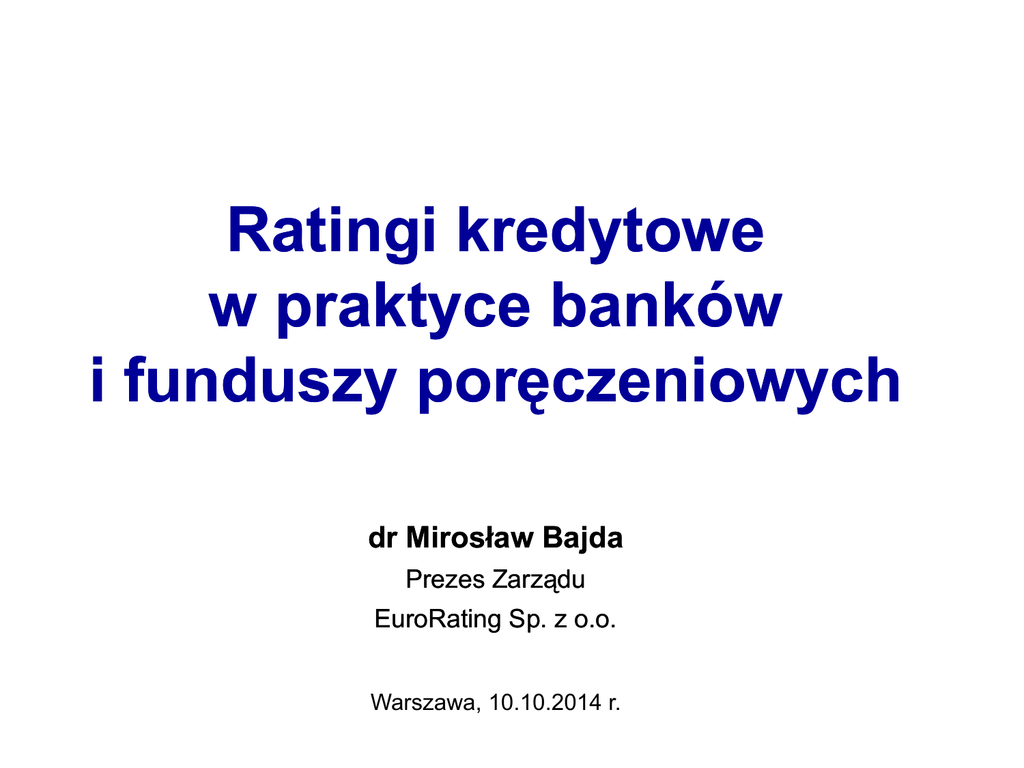 Ratingi kredytowe w praktyce banków i funduszy poręczeniowych dr Mirosław Bajda Prezes Zarządu EuroRating Sp. z o.o. Warszawa, 10.10.2014 r. Historia Ratingi kredytowe funduszy poręczeniowych – historia Pierwsze ratingi zostały nadane grupie funduszy poręczeniowych przez agencję ratingową EuroRating w 2009 roku Maksymalnie ocenie agencji EuroRating podlegało 15 funduszy W okresie V-X.2013 r. ocenę ratingową grupy 26 funduszy przeprowadziła na zlecenie PARP bułgarska agencja ratingowa BCRA Liczba funduszy ocenianych przez EuroRating zmniejszyła się do 6 20 z 26 ratingów BCRA zostało już w 2014 roku wycofanych Stan obecny Ratingi kredytowe funduszy poręczeniowych – stan obecny Na dzień 09.10.2014 r. pozostało 6 aktywnych ratingów funduszy poręczeniowych nadanych przez BCRA na zlecenie PARP (ratingi te zostaną prawdopodobnie wycofane do końca października b.r.) EuroRating prowadzi obecnie ocenę 6 funduszy poręczeniowych (z czego 5 to ratingi publiczne) Banki nie stosują ratingów funduszy do celów regulacyjnych i nie wymagają od funduszy niezależnej oceny ratingowej Przytłaczająca większość działających w Polsce funduszy poręczeń kredytowych nie posiada obecnie żadnego ratingu kredytowego Wymogi regulacyjne Regulacje dotyczące oceny ryzyka kredytowego funduszy Rekomendacja Związku Banków Polskich z dnia 10.08.2010 r. dot. zasad współpracy pomiędzy bankami a funduszami poręczeniowymi posiadanie ratingu kredytowego nadanego przez niezależną agencję ratingową umożliwia funduszom osiąganie wyższego mnożnika kapitałowego Rozporządzenie Ministra Finansów z dnia 30. sierpnia 2010 r. ws. zasad tworzenia przez banki rezerw na ryzyko niższe rezerwy na kredyty poręczane przez fundusz z ratingiem na poziomie inwestycyjnym przyznanym przez uznaną agencję ratingową Rozporządzenie Parlamentu Europejskiego i Rady (UE) nr 575/2013 z dnia 26.06.2013 r. ws. wymogów ostrożnościowych w bankach Rating funduszy vs. banki Korzyści dla banków ze współpracy z funduszami z ratingiem Bezpośrednia korzyść finansowa niższe rezerwy kapitałowe na kredyty poręczane przez fundusze posiadające rating na poziomie inwestycyjnym Pomoc dla banków w ocenie i monitoringu wiarygodności funduszy możliwość redukcji kosztów własnych (rezygnacja lub rzadsza ocena własna) Rating jako istotny element standaryzacji działalności funduszy sprowadzenie oceny różnych funduszy do wspólnego mianownika Rating jako podstawa do ustalania limitów ekspozycji na fundusze rating jako regulator ryzyka poszczególnych funduszy Agencja ratingowa Kryteria wyboru podmiotu oceniającego ryzyko funduszy Wymóg posiadania rejestracji w UE przez ESMA (status ECAI) Konieczność zapewnienia pełnej niezależności i obiektywizmu przy ocenie ryzyka funduszy Ocena na podstawie jednolitej, profesjonalnej i wiarygodnej metodologii Porównywalność skali ryzyka z ocenami międzynarodowych agencji Udostępnianie aktualnej i obszernej informacji na temat ryzyka kredytowego funduszy dla szerokiego grona odbiorców Konieczność zapewnienia ciągłości oceny funduszy w długim terminie Agencja ratingowa EuroRating EuroRating – ocena ryzyka funduszy poręczeniowych Ocena ratingowa funduszy prowadzona jest w sposób ciągły od 2009 r. Profesjonalna metodologia ratingowa do oceny funduszy poręczeniowych uznana przez BGK i ZBP oraz sprawdzona w praktyce Standardowa weryfikacja nadanych ratingów odbywa się co kwartał Pełny raport ratingowy (objętość ok. 30-40 stron) aktualizowany co najmniej raz w roku Ratingi funduszy poręczeniowych są ratingami publicznymi (publikowanymi bezpłatnie w sposób ogólnodostępny) Możliwość zapisu na listę mailingową dotyczącą ratingów funduszy Co powinien zrobić sektor funduszy? Co należy zrobić aby banki zaczęły stosować ratingi? Zagwarantowanie ciągłości oceny ratingowej funduszy Konieczność uzyskania masy krytycznej rating powinna posiadać duża grupa (20-30) funduszy Jednoznaczne wyjaśnienie kwestii regulacyjnych uzyskana interpretacja rozporządzenia Ministra Finansów z 30.08.2010 r. wydana przez Komisję Nadzoru Finansowego wysłane zapytanie do Ministerstwa Finansów Dotarcie do jak największej grupy banków z informacją o korzyściach związanych ze współpracą z funduszami posiadającymi rating kredytowy Co mogą zrobić banki? Co mogą zrobić banki w kwestii upowszechnienia ratingów? Podjęcie strategicznej decyzji o rozwoju współpracy z funduszami Rozpoczęcie wymagania od funduszy poddawania się ocenie ratingowej uzyskanie masy krytycznej liczby ocenianych funduszy Rozpoczęcie stosowania ratingów do celów operacyjnych rating jako uzupełnienie lub substytut własnej oceny ryzyka funduszy wyznaczanie limitów ekspozycji na fundusze w oparciu o rating Rozpoczęcie stosowania ratingów do celów regulacyjnych niższe rezerwy kapitałowe na kredyty poręczane przez fundusze Przyszłość współpracy banków z funduszami poręczeniowymi Co jeszcze możemy zrobić?