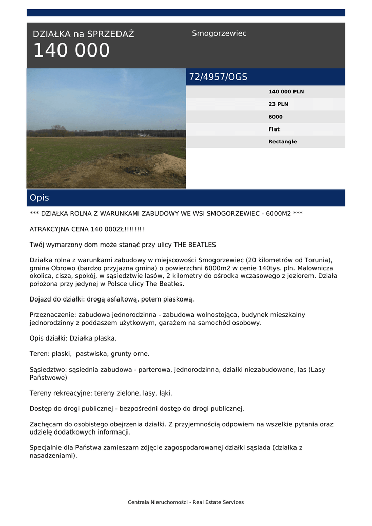 DZIAŁKA na SPRZEDAŻ Smogorzewiec 140 000 72/4957/OGS 140 000 PLN 23 PLN 6000 Flat Rectangle Opis *** DZIAŁKA ROLNA Z WARUNKAMI ZABUDOWY WE WSI SMOGORZEWIEC - 6000M2 *** ATRAKCYJNA CENA 140 000ZŁ!!!!!!!! Twój wymarzony dom może stanąć przy ulicy THE BEATLES Działka rolna z warunkami zabudowy w miejscowości Smogorzewiec (20 kilometrów od Torunia), gmina Obrowo (bardzo przyjazna gmina) o powierzchni 6000m2 w cenie 140tys. pln. Malownicza okolica, cisza, spokój, w sąsiedztwie lasów, 2 kilometry do ośrodka wczasowego z jeziorem. Działa położona przy jedynej w Polsce ulicy The Beatles. Dojazd do działki: drogą asfaltową, potem piaskową. Przeznaczenie: zabudowa jednorodzinna - zabudowa wolnostojąca, budynek mieszkalny jednorodzinny z poddaszem użytkowym, garażem na samochód osobowy. Opis działki: Działka płaska. Teren: płaski, pastwiska, grunty orne. Sąsiedztwo: sąsiednia zabudowa - parterowa, jednorodzinna, działki niezabudowane, las (Lasy Państwowe) Tereny rekreacyjne: tereny zielone, lasy, łąki. Dostęp do drogi publicznej - bezpośredni dostęp do drogi publicznej. Zachęcam do osobistego obejrzenia działki. Z przyjemnością odpowiem na wszelkie pytania oraz udzielę dodatkowych informacji. Specjalnie dla Państwa zamieszam zdjęcie zagospodarowanej działki sąsiada (działka z nasadzeniami). Centrala Nieruchomości - Real Estate Services Serdecznie zapraszam na prezentację nieruchomości, z przyjemnością odpowiem Państwu na wszelkie pytania oraz udzielę dodatkowych informacji gdyż to naprawdę wyjątkowa oferta na rynku!!! ***************** KAROLINA RUTKOWSKA TEL 663 899 715 *********************************** Centrala Nieruchomości: ZAPEWNIAMY BEZPŁATNE I PROFESJONALNE DORADZTWO ZARÓWNO W ZAKRESIE NIERUCHOMOŚCI JAK I POZYSKIWANIU POD NIE KREDYTÓW HIPOTECZNYCH Powyższe informacje zostały sporządzone na podstawie oświadczeń właścicieli i nie są ofertą w rozumieniu przepisów Kodeksu Cywilnego. Mają one jedynie charakter informacyjny. Większość naszych klientów pochodzi z polecenia - ZAUFAJ NAM I TY I NIE CZEKAJ, AŻ KTOŚ CIĘ WYPRZEDZI! Zadzwoń i umów się na prezentację ! Nr licencji pośrednika odpowiedzialnego za wykonanie umowy pośrednictwa 14260. zobacz inne nasze oferty na www.centralanieruchomosci.pl facebook.com/Centrala.N Karolina Rutkowska tel. (+48) 663 899 715 email: [email protected] Centrala Nieruchomości - Real Estate Services Powered by TCPDF (www.tcpdf.org)