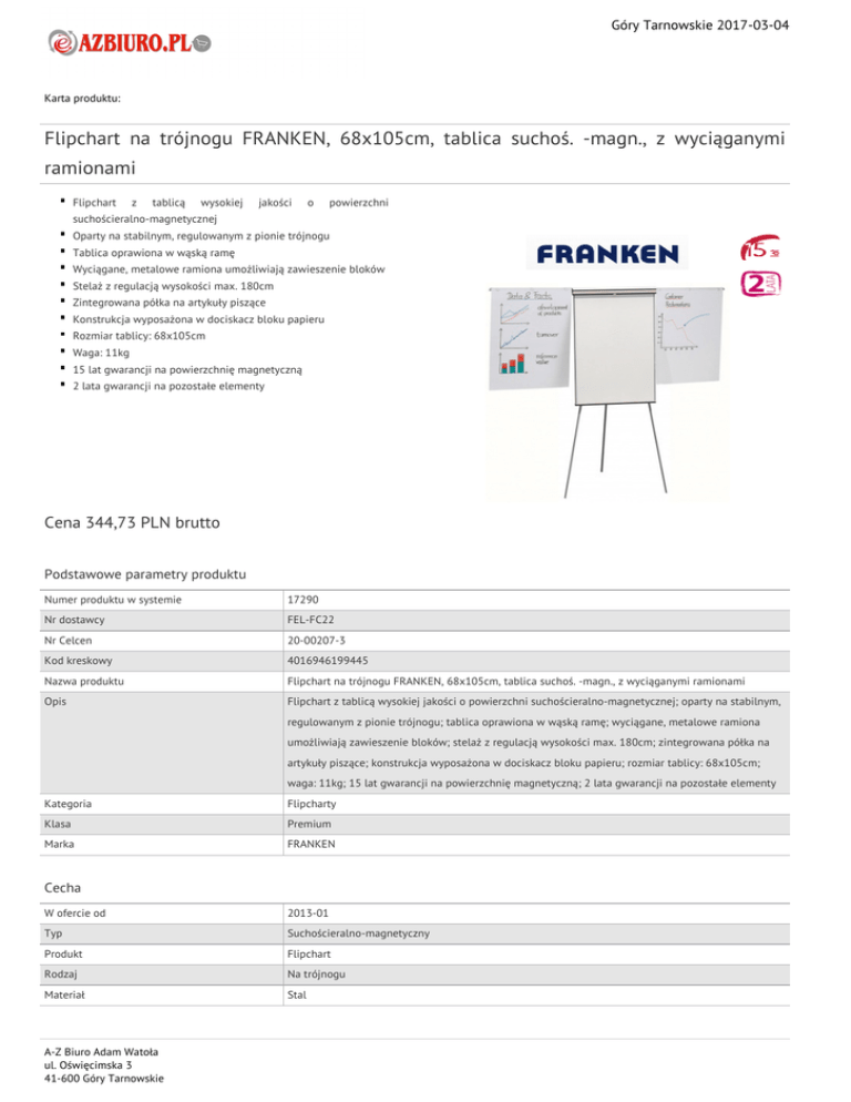 Góry Tarnowskie 2017-03-04 Karta produktu: Flipchart na trójnogu FRANKEN, 68x105cm, tablica suchoś. -magn., z wyciąganymi ramionami Flipchart z tablicą wysokiej jakości o powierzchni suchościeralno-magnetycznej Oparty na stabilnym, regulowanym z pionie trójnogu Tablica oprawiona w wąską ramę Wyciągane, metalowe ramiona umożliwiają zawieszenie bloków Stelaż z regulacją wysokości max. 180cm Zintegrowana półka na artykuły piszące Konstrukcja wyposażona w dociskacz bloku papieru Rozmiar tablicy: 68x105cm Waga: 11kg 15 lat gwarancji na powierzchnię magnetyczną 2 lata gwarancji na pozostałe elementy Cena 344,73 PLN brutto Podstawowe parametry produktu Numer produktu w systemie 17290 Nr dostawcy FEL-FC22 Nr Celcen 20-00207-3 Kod kreskowy 4016946199445 Nazwa produktu Flipchart na trójnogu FRANKEN, 68x105cm, tablica suchoś. -magn., z wyciąganymi ramionami Opis Flipchart z tablicą wysokiej jakości o powierzchni suchościeralno-magnetycznej; oparty na stabilnym, regulowanym z pionie trójnogu; tablica oprawiona w wąską ramę; wyciągane, metalowe ramiona umożliwiają zawieszenie bloków; stelaż z regulacją wysokości max. 180cm; zintegrowana półka na artykuły piszące; konstrukcja wyposażona w dociskacz bloku papieru; rozmiar tablicy: 68x105cm; waga: 11kg; 15 lat gwarancji na powierzchnię magnetyczną; 2 lata gwarancji na pozostałe elementy Kategoria Flipcharty Klasa Premium Marka FRANKEN Cecha W ofercie od 2013-01 Typ Suchościeralno-magnetyczny Produkt Flipchart Rodzaj Na trójnogu Materiał Stal A-Z Biuro Adam Watoła ul. Oświęcimska 3 41-600 Góry Tarnowskie Góry Tarnowskie 2017-03-04 Karta katalogowa produktu cd. Flipchart na trójnogu FRANKEN, 68x105cm, tablica suchoś. -magn., z wyciąganymi ramionami Wymiary Rozmiar Regulowany Wymiary (mm) 680x1050 Certyfikaty Ilość lat gwarancji 15 Nowy produkt w ofercie Standard Hit Standard Wspólny słownik zamówień CPV 30195913-5 Sztalugi flipchart Kolor Kolor Serdecznie zapraszamy do współpracy A-Z Biuro Adam Watoła zespół. A-Z Biuro Adam Watoła ul. Oświęcimska 3 41-600 Góry Tarnowskie Biały