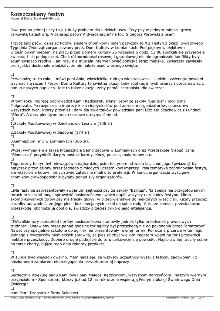 Rozszczekany festyn Nadesłał Dorta Burkhard-Mikruta Dwa psy na jednej ulicy to już duży problem dla ludzkich uszu. Trzy psy w jednym miejscu grożą całkowitą katastrofą. A dziesięć psów? A dwadzieścia? na fot. Grzegorz Porowski z psem Trzydzieści psów, dziesięć kotów, siedem chomików i jeden patyczak to XII Festyn z okazji Światowego Tygodnia Zwierząt zorganizowany przez Dom Kultury w Łomiankach. Pod pięknym, błękitnym wrześniowym niebem, na placu przed Domem Kultury 25 września o godz. 13.00 spotkali się przyjaciele zwierząt i ich podopieczni. Choć różnorodności rasowej i gatunkowej nic nie ograniczało konflikty były zdumiewająco rzadkie - ani razu nie musiała interweniować pobliska straż miejska. Zwierzęta zawiesiły broń jakby doskonale wiedziały, że nie należy psuć własnego święta. Przychodzę tu co roku - mówi pani Ania, właścicielka rudego wielorasowca. - Ludzie i zwierzęta powinni trzymać się razem! Festyn Domu Kultury to świetna okazji żeby spotkać innych psiarzy i porozmawiać z nimi o naszych pupilach. Jest to także okazja, żeby pomóc schronisku dla zwierząt. W tym roku imprezę poprowadził Kamil Kędziorek, trener psów ze szkoły "Baritus" i jego żona Małgorzata. Po rozpoczęciu imprezy kilka ciepłych słów pod adresem organizatorów, sponsorów i wszystkich tych, którzy przynieśli dary dla zwierzaków powiedziała pani Elżbieta Stachowicz z Fundacji "Sfora". A dary pieniężne oraz rzeczowe otrzymaliśmy od: 1.Szkoły Podstawowej w Dziekanowie Leśnym (106 zł) 2.Szkoły Podstawowej w Sadowej (174 zł) 3.Gimnazjum nr 1 w Łomiankach (205 zł). Wyżej wymienieni a także Przedszkole Samorządowe w Łomiankach oraz Przedszkole Niepubliczne "Słoneczko" przynieśli dary w postaci karmy. Kocy, puszek, makaronów etc. Tegoroczny festyn był niewątpliwie najbardziej psim festynem od wielu lat, choć jego ?gwiazdą? był patyczak przyniesiony przez jednego z młodych uczestników imprezy. Psia tematyka zdominowała festyn, ale właściciele kotów i innych zwierzątek nie mieli o to pretensji. W końcu organizacja wyścigów chomików prawdopodobnie byłaby ponad siły organizatorów. Na festynie zaprezentowały swoje umiejętności psy ze szkoły "Baritus". Na specjalnie przygotowanych torach przeszkód mogli sprawdzić posłuszeństwo swoich pupili wszyscy uczestnicy festynu. Mimo skomplikowanych torów psy nie traciły głowy, w przeciwieństwie do niektórych właścicieli. Każdy przecież chciałby udowodnić, że jego pies i bez specjalnych szkół da sobie radę. A to, że zamiast przeskakiwać przeszkodę, obchodzi ją dookoła, świadczy przecież tylko o jego inteligencji. Wszelkie tory przeszkód i próby posłuszeństwa stanowiły jednak tylko przedsmak prawdziwych trudności. Ustawiany przez ponad godzinę tor agillity był przeszkodą nie do pokonania przez "amatorów". Nawet psy specjalnie szkolone do agillity nie prezentowały równej formy. Półroczna przerwa w teninigu jednego z owczarków niemieckich sprawiła, że pies ze zbyt wielkim impetem wpadł na tor i przewrócił niektóre przeszkody. Dopiero drugie podejście do toru całkowicie się powiodło. Najsprawniej radziły sobie na torze charty, bijące tego dnia rękordy prędkości. W sumie było wesoło i gwarno. Mam nadzieję, że wszyscy uczestnicy wyszli z festynu zadowoleni i z niezłomnym zamiarem nieprzegapienia przyszłorocznej imprezy. Serdecznie dziękuję panu Kamilowi i pani Małgosi Kędziorkom, wszystkim darczyńcom i naszym wiernym przyjaciołom - Sponsorom, którzy już od 12 lat rokrocznie wspierają Festyn z okazji Światowego Dnia Zwierząt: pani Marii Dragstra z firmy Selectwa http://stare.lomianki.art.pl - Serwis archiwalny Domu Kultury w Łomiankach Powered by Mambo Generated: 4 March, 2017, 10:37 panu Mirosławowi Kornilukowi z hurtowni Helkra panstwu Iwonie i Piotrowi Bronikowskim z firmy Broplast panu Bogumiłowi Władkowskiego ze sklepu z artykułami zwierzęcymi na Bazarku. Dorota Burkhard-Mikruta http://stare.lomianki.art.pl - Serwis archiwalny Domu Kultury w Łomiankach Powered by Mambo Generated: 4 March, 2017, 10:37