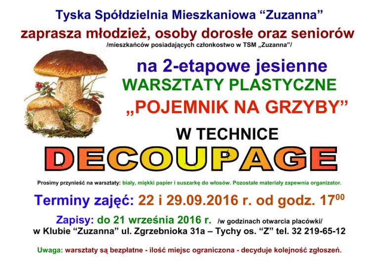 Tyska Spółdzielnia Mieszkaniowa “Zuzanna” zaprasza młodzież, osoby dorosłe oraz seniorów /mieszkańców posiadających członkostwo w TSM „Zuzanna”/ na 2-etapowe jesienne WARSZTATY PLASTYCZNE „POJEMNIK NA GRZYBY” W TECHNICE Prosimy przynieść na warsztaty: biały, miękki papier i suszarkę do włosów. Pozostałe materiały zapewnia organizator. Terminy zajęć: 22 i 29.09.2016 r. od godz. 1700 Zapisy: do 21 września 2016 r. /w godzinach otwarcia placówki/ w Klubie “Zuzanna” ul. Zgrzebnioka 31a – Tychy os. “Z” tel. 32 219-65-12 Uwaga: warsztaty są bezpłatne - ilość miejsc ograniczona - decyduje kolejność zgłoszeń.