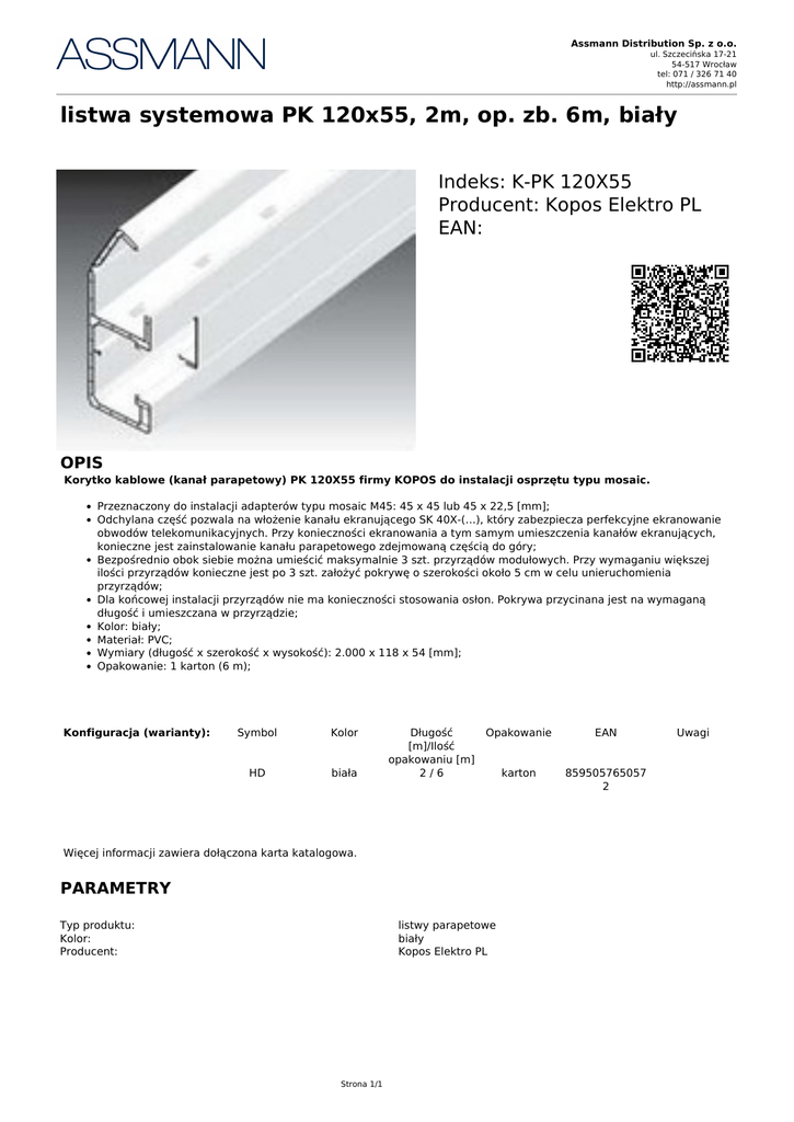 Assmann Distribution Sp. z o.o. ul. Szczecińska 17-21 54-517 Wrocław tel: 071 / 326 71 40 http://assmann.pl listwa systemowa PK 120x55, 2m, op. zb. 6m, biały Indeks: K-PK 120X55 Producent: Kopos Elektro PL EAN: OPIS Korytko kablowe (kanał parapetowy) PK 120X55 firmy KOPOS do instalacji osprzętu typu mosaic. Przeznaczony do instalacji adapterów typu mosaic M45: 45 x 45 lub 45 x 22,5 [mm]; Odchylana część pozwala na włożenie kanału ekranującego SK 40X-(…), który zabezpiecza perfekcyjne ekranowanie obwodów telekomunikacyjnych. Przy konieczności ekranowania a tym samym umieszczenia kanałów ekranujących, konieczne jest zainstalowanie kanału parapetowego zdejmowaną częścią do góry; Bezpośrednio obok siebie można umieścić maksymalnie 3 szt. przyrządów modułowych. Przy wymaganiu większej ilości przyrządów konieczne jest po 3 szt. założyć pokrywę o szerokości około 5 cm w celu unieruchomienia przyrządów; Dla końcowej instalacji przyrządów nie ma konieczności stosowania osłon. Pokrywa przycinana jest na wymaganą długość i umieszczana w przyrządzie; Kolor: biały; Materiał: PVC; Wymiary (długość x szerokość x wysokość): 2.000 x 118 x 54 [mm]; Opakowanie: 1 karton (6 m); Konfiguracja (warianty): Symbol Kolor HD biała Długość [m]/Ilość opakowaniu [m] 2/6 Opakowanie EAN karton 859505765057 2 Więcej informacji zawiera dołączona karta katalogowa. PARAMETRY Typ produktu: Kolor: Producent: listwy parapetowe biały Kopos Elektro PL Strona 1/1 Powered by TCPDF (www.tcpdf.org) Uwagi