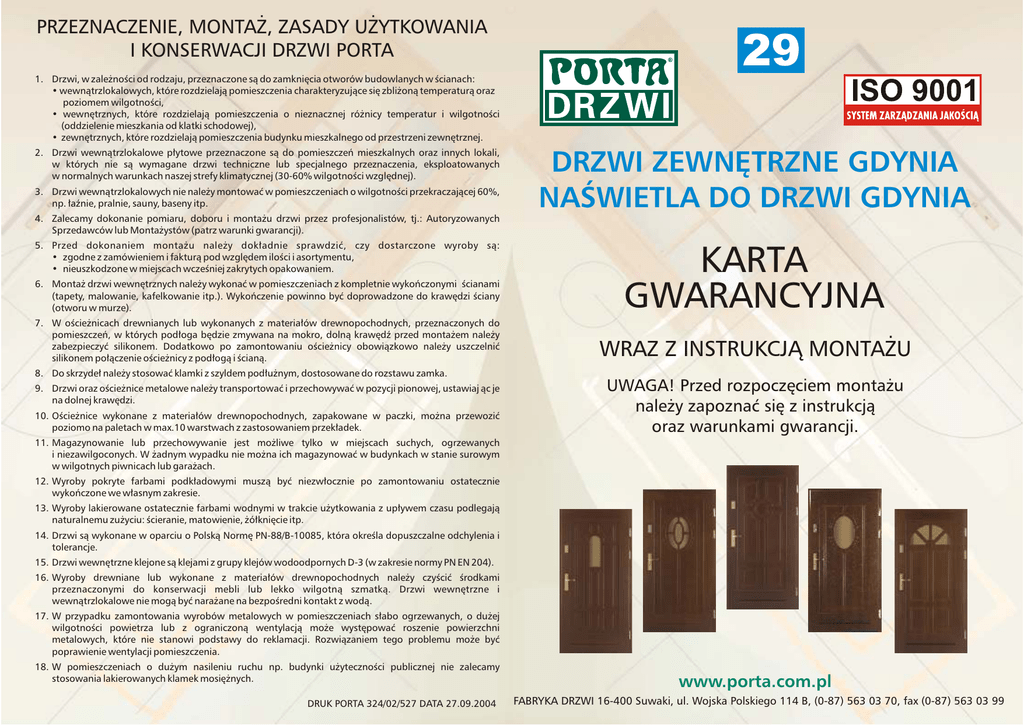PRZEZNACZENIE, MONTA¯, ZASADY U¯YTKOWANIA I KONSERWACJI DRZWI PORTA 1. Drzwi, w zale¿noœci od rodzaju, przeznaczone s¹ do zamkniêcia otworów budowlanych w œcianach: • wewn¹trzlokalowych, które rozdzielaj¹ pomieszczenia charakteryzuj¹ce siê zbli¿on¹ temperatur¹ oraz poziomem wilgotnoœci, • wewnêtrznych, które rozdzielaj¹ pomieszczenia o nieznacznej ró¿nicy temperatur i wilgotnoœci (oddzielenie mieszkania od klatki schodowej), • zewnêtrznych, które rozdzielaj¹ pomieszczenia budynku mieszkalnego od przestrzeni zewnêtrznej. 2. Drzwi wewn¹trzlokalowe p³ytowe przeznaczone s¹ do pomieszczeñ mieszkalnych oraz innych lokali, w których nie s¹ wymagane drzwi techniczne lub specjalnego przeznaczenia, eksploatowanych w normalnych warunkach naszej strefy klimatycznej (30-60% wilgotnoœci wzglêdnej). 3. Drzwi wewn¹trzlokalowych nie nale¿y montowaæ w pomieszczeniach o wilgotnoœci przekraczaj¹cej 60%, np. ³aŸnie, pralnie, sauny, baseny itp. 29 DRZWI ZEWNÊTRZNE GDYNIA NAŒWIETLA DO DRZWI GDYNIA 4. Zalecamy dokonanie pomiaru, doboru i monta¿u drzwi przez profesjonalistów, tj.: Autoryzowanych Sprzedawców lub Monta¿ystów (patrz warunki gwarancji). 5. Przed dokonaniem monta¿u nale¿y dok³adnie sprawdziæ, czy dostarczone wyroby s¹: • zgodne z zamówieniem i faktur¹ pod wzglêdem iloœci i asortymentu, • nieuszkodzone w miejscach wczeœniej zakrytych opakowaniem. 6. Monta¿ drzwi wewnêtrznych nale¿y wykonaæ w pomieszczeniach z kompletnie wykoñczonymi œcianami (tapety, malowanie, kafelkowanie itp.). Wykoñczenie powinno byæ doprowadzone do krawêdzi œciany (otworu w murze). KARTA GWARANCYJNA 7. W oœcie¿nicach drewnianych lub wykonanych z materia³ów drewnopochodnych, przeznaczonych do pomieszczeñ, w których pod³oga bêdzie zmywana na mokro, doln¹ krawêdŸ przed monta¿em nale¿y zabezpieczyæ silikonem. Dodatkowo po zamontowaniu oœcie¿nicy obowi¹zkowo nale¿y uszczelniæ silikonem po³¹czenie oœcie¿nicy z pod³og¹ i œcian¹. WRAZ Z INSTRUKCJ¥ MONTA¯U 8. Do skrzyde³ nale¿y stosowaæ klamki z szyldem pod³u¿nym, dostosowane do rozstawu zamka. 9. Drzwi oraz oœcie¿nice metalowe nale¿y transportowaæ i przechowywaæ w pozycji pionowej, ustawiaj ¹c je na dolnej krawêdzi. 10. Oœcie¿nice wykonane z materia³ów drewnopochodnych, zapakowane w paczki, mo¿na przewoziæ poziomo na paletach w max.10 warstwach z zastosowaniem przek³adek. UWAGA! Przed rozpoczêciem monta¿u nale¿y zapoznaæ siê z instrukcj¹ oraz warunkami gwarancji. 11. Magazynowanie lub przechowywanie jest mo¿liwe tylko w miejscach suchych, ogrzewanych i niezawilgoconych. W ¿adnym wypadku nie mo¿na ich magazynowaæ w budynkach w stanie surowym w wilgotnych piwnicach lub gara¿ach. 12. Wyroby pokryte farbami podk³adowymi musz¹ byæ niezw³ocznie po zamontowaniu ostatecznie wykoñczone we w³asnym zakresie. 13. Wyroby lakierowane ostatecznie farbami wodnymi w trakcie u¿ytkowania z up³ywem czasu podlegaj¹ naturalnemu zu¿yciu: œcieranie, matowienie, ¿ó³kniêcie itp. 14. Drzwi s¹ wykonane w oparciu o Polsk¹ Normê PN-88/B-10085, która okreœla dopuszczalne odchylenia i tolerancje. 15. Drzwi wewnêtrzne klejone s¹ klejami z grupy klejów wodoodpornych D-3 (w zakresie normy PN EN 204). 16. Wyroby drewniane lub wykonane z materia³ów drewnopochodnych nale¿y czyœciæ œrodkami przeznaczonymi do konserwacji mebli lub lekko wilgotn¹ szmatk¹. Drzwi wewnêtrzne i wewn¹trzlokalowe nie mog¹ byæ nara¿ane na bezpoœredni kontakt z wod¹. 17. W przypadku zamontowania wyrobów metalowych w pomieszczeniach s³abo ogrzewanych, o du¿ej wilgotnoœci powietrza lub z ograniczon¹ wentylacj¹ mo¿e wystêpowaæ roszenie powierzchni metalowych, które nie stanowi podstawy do reklamacji. Rozwi¹zaniem tego problemu mo¿e byæ poprawienie wentylacji pomieszczenia. 18. W pomieszczeniach o du¿ym nasileniu ruchu np. budynki u¿ytecznoœci publicznej nie zalecamy stosowania lakierowanych klamek mosiê¿nych. DRUK PORTA 324/02/527 DATA 27.09.2004 www.porta.com.pl FABRYKA DRZWI 16-400 Suwaki, ul. Wojska Polskiego 114 B, (0-87) 563 03 70, fax (0-87) 563 03 99 WARUNKI GWARANCJI 1. Porta KMI Fornir jako Gwarant udziela gwarancji na swoje produkty na terenie RP pod warunkiem, ¿e zostan¹ one zamontowane zgodnie z zamieszczon¹ w niniejszej karcie instrukcj¹ monta¿u oraz bêd¹ u¿ytkowane zgodnie z ich przeznaczeniem. W wykonywaniu obowi¹zków gwarancyjnych poœrednicz¹ na podstawie umów dealerskich przedstawiciele fabryki Dealerzy Porta KMI Poland 2. Okres gwarancji na wyroby firmy Porta KMI Fornir wynosi: - 12 miesiêcy na wyroby standardowe, - 24 miesi¹ce na wyroby antyw³amaniowe, - 24 miesi¹ce na drzwi zewnêtrzne drewniane. Okres gwarancji ulega wyd³u¿eniu o nastêpne 12 miesiêcy w przypadku monta¿u zakupionych produktów przez Autoryzowane Grupy Monta¿owe (posiadaj¹ce aktualn¹ autoryzacjê), a fakt ten zostanie potwierdzony przystawieniem odpowiedniej pieczêci w niniejszej karcie. 3. Okres gwarancji liczony jest od daty sprzeda¿y uwidocznionej na dowodzie zakupu (fakturze). 4. Warunkiem œwiadczenia us³ug gwarancyjnych jest przed³o¿enie przez Kupuj¹cego w punkcie sprzeda¿y karty gwarancyjnej wraz z dowodem zakupu i faktury za monta¿ (w przypadku wyd³u¿onej gwarancji). Karta gwarancyjna za³¹czona jest do produktu. Obowi¹zkiem Kupuj¹cego jest odebranie karty gwarancyjnej od Sprzedawcy lub Autoryzowanego Monta¿ysty. Wszelkie adnotacje i zapisy w karcie gwarancyjnej mog¹ byæ dokonywane wy³¹cznie przez Gwaranta, upowa¿niony do tego punkt sprzeda¿y lub Autoryzowanego Monta¿ystê. Dzia³ reklamacji znajduje siê w Porta KMI Poland, 84-239 Bolszewo, ul. Szkolna 26, tel. (0-58) 677 81 00 5. Gwarant zobowi¹zuje siê do rozpatrzenia i za³atwienia reklamacji w mo¿liwie najkrótszym terminie. 6. Zw³oka w za³atwieniu reklamacji nie zachodzi, gdy oglêdzin, wymiany lub naprawy nie dokonano z przyczyn le¿¹cych po stronie Kupuj¹cego. 7