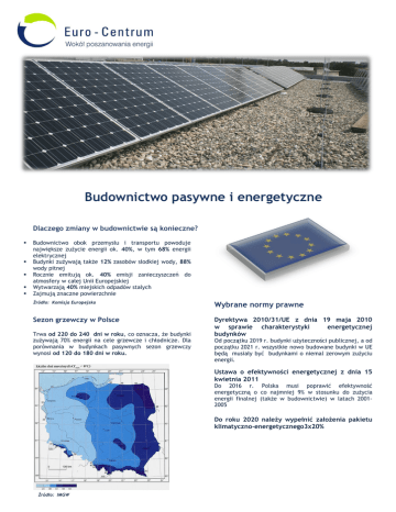 Budownictwo pasywne i energetyczne Dlaczego zmiany w budownictwie są konieczne? Budownictwo obok przemysłu i transportu powoduje największe zużycie energii ok. 40%, w tym 68% energii elektrycznej Budynki zużywają także 12% zasobów słodkiej wody, 88% wody pitnej Rocznie emitują ok. 40% emisji zanieczyszczeń do atmosfery w całej Unii Europejskiej Wytwarzają 40% miejskich odpadów stałych Zajmują znaczne powierzchnie Źródło: Komisja Europejska Wybrane normy prawne Sezon grzewczy w Polsce Dyrektywa 2010/31/UE z dnia 19 maja 2010 w sprawie charakterystyki energetycznej budynków Trwa od 220 do 240 dni w roku, co oznacza, że budynki zużywają 70% energii na cele grzewcze i chłodnicze. Dla porównania w budynkach pasywnych sezon grzewczy wynosi od 120 do 180 dni w roku. Od początku 2019 r. budynki użyteczności publicznej, a od początku 2021 r. wszystkie nowo budowane budynki w UE będą musiały być budynkami o niemal zerowym zużyciu energii. Ustawa o efektywności energetycznej z dnia 15 kwietnia 2011 Do 2016 r. Polska musi poprawić efektywność energetyczną o co najmniej 9% w stosunku do zużycia energii finalnej (także w budownictwie) w latach 20012005 Do roku 2020 należy wypełnić założenia pakietu klimatyczno-energetycznego3x20% Źródło: IMGW Porównanie standardów ochrony cieplnej budynków Kraj Okres Polska Budynki z lat 1967 – 85 Budynki z lat 1985 – 92 Budynki po roku 1993 Od 1998 roku Wskaźnik sezonowy zapotrzebowania na ciepło do ogrzewania [kWh/ (m2·rok)] 240 ÷ 290 160 ÷ 200 120 ÷ 160 90 ÷ 120 Austria Budynki aktualnie wznoszone Planowane 25 ÷ 50 15 ÷ 25 Niemcy Budynki zgodne z przepisami obowiązującymi od 1995 roku Planowane 50 ÷ 100 30 ÷ 70 Szwajcaria Dom energooszczędny Budynki aktualnie wznoszone 55 55 ÷ 85 Szwecja Budynki aktualnie wznoszone 30÷60 Dania Budynki aktualnie wznoszone 50 Źródło: ekooszczedni.pl, termodom.pl Ile to kosztuje? Dom pasywny Dom energooszczędny Dom standardowy Powierzchnia netto [m2] 154,2 152,0 152,0 Zapotrzebowanie energii EK [kWh/ m2/ rok] 13,5 44,7 120,0 Koszt budowy pod klucz [zł] 471 000 392 200 358 400 Koszt budowy 1 m2 3 005 2 580 2 357 Różnica kosztów inwestycji [zł] 112 600 33 800 0 Różnica kosztów inwestycji [%] 31,4 8,6 0 Różnica kosztów ogrzewania [%] 11 37 100 Porównanie kosztów inwestycji oraz zapotrzebowania na energię budynków: Źródło: Lipińscy Domy Czas zwrotu nakładów na realizację: Budynku pasywnego: od 35 do 40 lat Budynku energooszczędnego od kilku do kilkunastu lat www.euro-centrum.com.pl