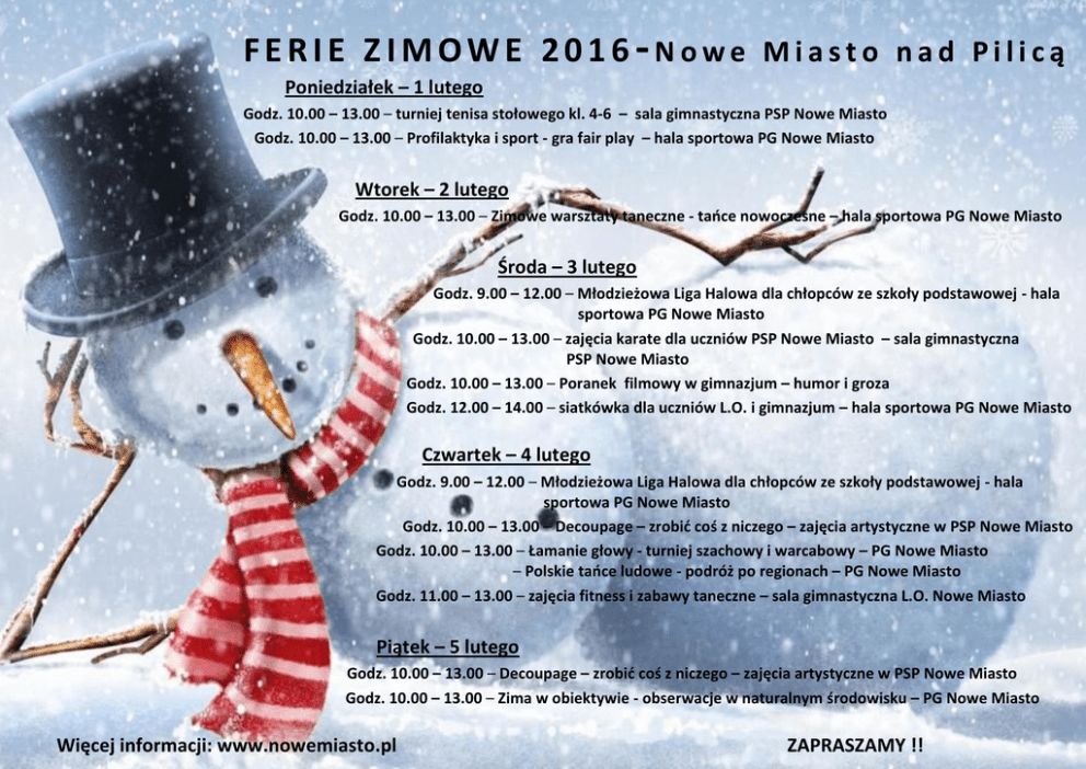 FERIE ZIMOWE 2016-Nowe Miasto nad Pilicą Poniedziałek – 1 lutego Godz. 10.00 – 13.00 – turniej tenisa stołowego kl. 4-6 – sala gimnastyczna PSP Nowe Miasto Godz. 10.00 – 13.00 – Profilaktyka i sport - gra fair play – hala sportowa PG Nowe Miasto Wtorek – 2 lutego Godz. 10.00 – 13.00 – Zimowe warsztaty taneczne - tańce nowoczesne – hala sportowa PG Nowe Miasto Środa – 3 lutego Godz. 9.00 – 12.00 – Młodzieżowa Liga Halowa dla chłopców ze szkoły podstawowej - hala sportowa PG Nowe Miasto Godz. 10.00 – 13.00 – zajęcia karate dla uczniów PSP Nowe Miasto – sala gimnastyczna PSP Nowe Miasto Godz. 10.00 – 13.00 – Poranek filmowy w gimnazjum – humor i groza Godz. 12.00 – 14.00 – siatkówka dla uczniów L.O. i gimnazjum – hala sportowa PG Nowe Miasto Czwartek – 4 lutego Godz. 9.00 – 12.00 – Młodzieżowa Liga Halowa dla chłopców ze szkoły podstawowej - hala sportowa PG Nowe Miasto Godz. 10.00 – 13.00 – Decoupage – zrobić coś z niczego – zajęcia artystyczne w PSP Nowe Miasto Godz. 10.00 – 13.00 – Łamanie głowy - turniej szachowy i warcabowy – PG Nowe Miasto – Polskie tańce ludowe - podróż po regionach – PG Nowe Miasto Godz. 11.00 – 13.00 – zajęcia fitness i zabawy taneczne – sala gimnastyczna L.O. Nowe Miasto Piątek – 5 lutego Godz. 10.00 – 13.00 – Decoupage – zrobić coś z niczego – zajęcia artystyczne w PSP Nowe Miasto Godz. 10.00 – 13.00 – Zima w obiektywie - obserwacje w naturalnym środowisku – PG Nowe Miasto Więcej informacji: www.nowemiasto.pl ZAPRASZAMY !!