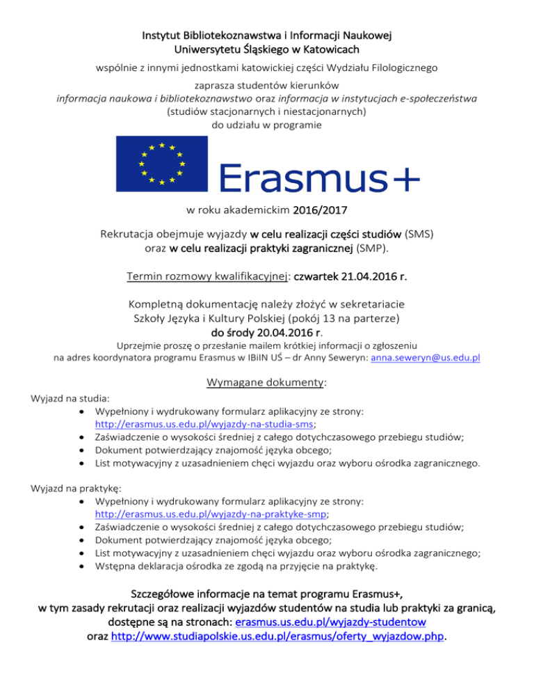 Instytut Bibliotekoznawstwa i Informacji Naukowej Uniwersytetu Śląskiego w Katowicach wspólnie z innymi jednostkami katowickiej części Wydziału Filologicznego zaprasza studentów kierunków informacja naukowa i bibliotekoznawstwo oraz informacja w instytucjach e-społeczeństwa (studiów stacjonarnych i niestacjonarnych) do udziału w programie w roku akademickim 2016/2017 Rekrutacja obejmuje wyjazdy w celu realizacji części studiów (SMS) oraz w celu realizacji praktyki zagranicznej (SMP). Termin rozmowy kwalifikacyjnej: czwartek 21.04.2016 r. Kompletną dokumentację należy złożyć w sekretariacie Szkoły Języka i Kultury Polskiej (pokój 13 na parterze) do środy 20.04.2016 r. Uprzejmie proszę o przesłanie mailem krótkiej informacji o zgłoszeniu na adres koordynatora programu Erasmus w IBiIN UŚ – dr Anny Seweryn: [email protected] Wymagane dokumenty: Wyjazd na studia: Wypełniony i wydrukowany formularz aplikacyjny ze strony: http://erasmus.us.edu.pl/wyjazdy-na-studia-sms; Zaświadczenie o wysokości średniej z całego dotychczasowego przebiegu studiów; Dokument potwierdzający znajomość języka obcego; List motywacyjny z uzasadnieniem chęci wyjazdu oraz wyboru ośrodka zagranicznego. Wyjazd na praktykę: Wypełniony i wydrukowany formularz aplikacyjny ze strony: http://erasmus.us.edu.pl/wyjazdy-na-praktyke-smp; Zaświadczenie o wysokości średniej z całego dotychczasowego przebiegu studiów; Dokument potwierdzający znajomość języka obcego; List motywacyjny z uzasadnieniem chęci wyjazdu oraz wyboru ośrodka zagranicznego; Wstępna deklaracja ośrodka ze zgodą na przyjęcie na praktykę. Szczegółowe informacje na temat programu Erasmus+, w tym zasady rekrutacji oraz realizacji wyjazdów studentów na studia lub praktyki za granicą, dostępne są na stronach: erasmus.us.edu.pl/wyjazdy-studentow oraz http://www.studiapolskie.us.edu.pl/erasmus/oferty_wyjazdow.php. Oferta uczelni partnerskich na rok 2016/2017: uczelnia Slezská univerzita v Opavě Filozoficko-přírodovědecká fakulta v Opavě Ústav bohemistiky a knihovnictví Latvijas Universitate Sociālo zinātņu fakultāte Informācijas un bibliotēku studiju nodaļa Fachhochschule Köln Institut für Informationswissenschaft Hochschule für Technik, Wirtschaft und Kultur Leipzig Fakultät Medien Univerza v Ljubljani Oddelek za Bibliotekarstvo, Informacijsko Znanost in Knjigarstvo Univerzita Komenského v Bratislave Katedra knižničnej a informačnej vedy kraj (miasto) szacowana poziom liczba wymagany wysokość studiów miejsc język stypendium* Czechy (Opava) I, II, III Łotwa (Ryga) I, II, III Niemcy (Kolonia) I 2 Niemcy (Lipsk) I, II 2 Słowenia (Lublana) I 1 2 czeski/ angielski 400€ / m-c (A1) 3 łotewski lub angielski 300€ / m-c (B1) Słowacja I, II, III (Bratysława) niemiecki (B1) niemiecki (B1/B2) 400€ / m-c 400€ / m-c słoweński lub angielski 400€ / m-c (B2) 2 słowacki lub angielski 300€ / m-c (B2) * studenci uprawnieni do otrzymywania stypendium socjalnego otrzymają stypendium podwyższone o dodatkowe 200€ (dotyczy to wyłącznie wyjazdów w celu zrealizowania części studiów w zagranicznej uczelni partnerskiej) W ramach programu Erasmus+ studenci mogą się ubiegać o wyjazdy na studia i na praktyki w innych krajach uczestniczących w programie. Na każdym z trzech poziomów studiów (licencjackie, magisterskie, doktoranckie) można skorzystać z wyjazdu lub wyjazdów trwających łącznie do 12 miesięcy. Minimalny czas pobytu na studiach za granicą wynosi 3 miesiące, a na praktyce – 2 miesiące. Pobyt na stypendium musi zostać rozpoczęty i zakończony pomiędzy 1.06.2016 r. a 30.09.2017 r.; stypendium początkowo wypłacane jest przez okres maksymalnie 5 miesięcy (studia) lub 3 miesiące (praktyka) – w miarę dostępności środków finansowych okres ten może zostać wydłużony. Stypendium nie pokrywa wszystkich kosztów utrzymania studenta za granicą. Jeśli pozwolą na to środki finansowe, możliwe będzie przyznanie dofinansowania na kolejne miesiące pobytu. Okres pobytu na stypendium będzie ustalany z dokładnością do jednego dnia (miesiąc = 30 dni). Okres studiów zrealizowanych w ramach programu Erasmus+ w uczelni partnerskiej jest traktowany jako równoważny z okresem studiów w Uniwersytecie Śląskim; praktyka zrealizowana w ramach programu Erasmus+ jest traktowana jako równoważna z praktyką zrealizowaną w kraju. Wyjazd w ramach programu Erasmus+ nie może spowodować przedłużenia okresu studiów. W momencie wyjazdu na studia kandydat powinien być studentem Uniwersytetu Śląskiego (co najmniej drugiego roku studiów pierwszego stopnia). W momencie wyjazdu na zagraniczną praktykę lub staż kandydat powinien być studentem lub absolwentem Uniwersytetu Śląskiego. Wyjazd absolwenta uczelni może się odbyć w ciągu jednego roku od ukończenia studiów, a jego długość jest wliczana do łącznego czasu trwania mobilności na tym poziomie studiów, na którym student został zakwalifikowany na wyjazd (rekrutacja odbywa się na ostatnim roku studiów). Zagraniczna praktyka studencka w ramach programu Erasmus+ może być realizowana w dowolnie wybranej instytucji znajdującej się na terenie kraju uczestniczącego w programie Erasmus+ (z wyjątkiem: instytucji Unii Europejskiej, instytucji zarządzających programami Unii Europejskiej, polskich placówek dyplomatycznych oraz zagranicznych oddziałów polskich firm lub instytucji). Miesięczna wysokość stypendium uzależniona jest od kraju pobytu i w przypadku wyjazdu na praktyki wynosić będzie około: 600€ / m-c – Austria, Dania, Finlandia, Francja, Irlandia, Lichtenstein, Norwegia, Szwecja, Zjednoczone Królestwo, Włochy 500€ / m-c – Belgia, Chorwacja, Cypr, Czechy, Grecja, Hiszpania, Holandia, Islandia, Luksemburg, Niemcy, Portugalia, Słowenia, Turcja 400€ / m-c – Bułgaria, Estonia, Macedonia (FYROM), Litwa, Łotwa, Malta, Rumunia, Słowacja, Węgry