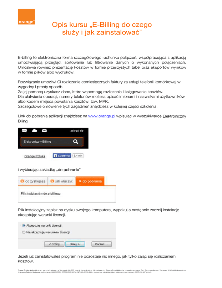 Opis kursu „E-Billing do czego służy i jak zainstalować” E-billing to elektroniczna forma szczegółowego rachunku połączeń, współpracująca z aplikacją umożliwiającą przegląd, sortowanie lub filtrowanie danych o wykonanych połączeniach. Umożliwia również prezentację kosztów w formie przejrzystych tabel oraz eksportów wyników w formie plików albo wydruków. Rozwiązanie umożliwi Ci rozliczanie comiesięcznych faktury za usługi telefonii komórkowej w wygodny i prosty sposób. Za jej pomocą uzyskasz dane, które wspomogą rozliczenia i księgowanie kosztów. Dla ułatwienia operacji, numery telefonów możesz opisać imionami i nazwiskami użytkowników albo kodem miejsca powstania kosztów, tzw. MPK. Szczegółowe omówienie tych zagadnień znajdziesz w kolejnej części szkolenia. Link do pobrania aplikacji znajdziesz na www.orange.pl wpisując w wyszukiwarce Elektroniczny Biling i wybierając zakładkę „do pobrania” Plik instalacyjny zapisz na dysku swojego komputera, wypakuj a następnie zacznij instalację akceptując warunki licencji. Jeżeli już zainstalowałeś program nie pozostaje nic innego, jak tylko zająć się rozliczaniem kosztów. Orange Polska Spółka Akcyjna z siedzibą i adresem w Warszawie (02-326) przy Al. Jerozolimskich 160, wpisana do Rejestru Przedsiębiorców prowadzonego przez Sąd Rejonowy dla m.st. Warszawy XII Wydział Gospodarczy Krajowego Rejestru Sądowego pod numerem 0000010681; REGON 012100784, NIP 526-02-50-995; z pokrytym w całości kapitałem zakładowym wynoszącym 3.937.072.437 złotych.