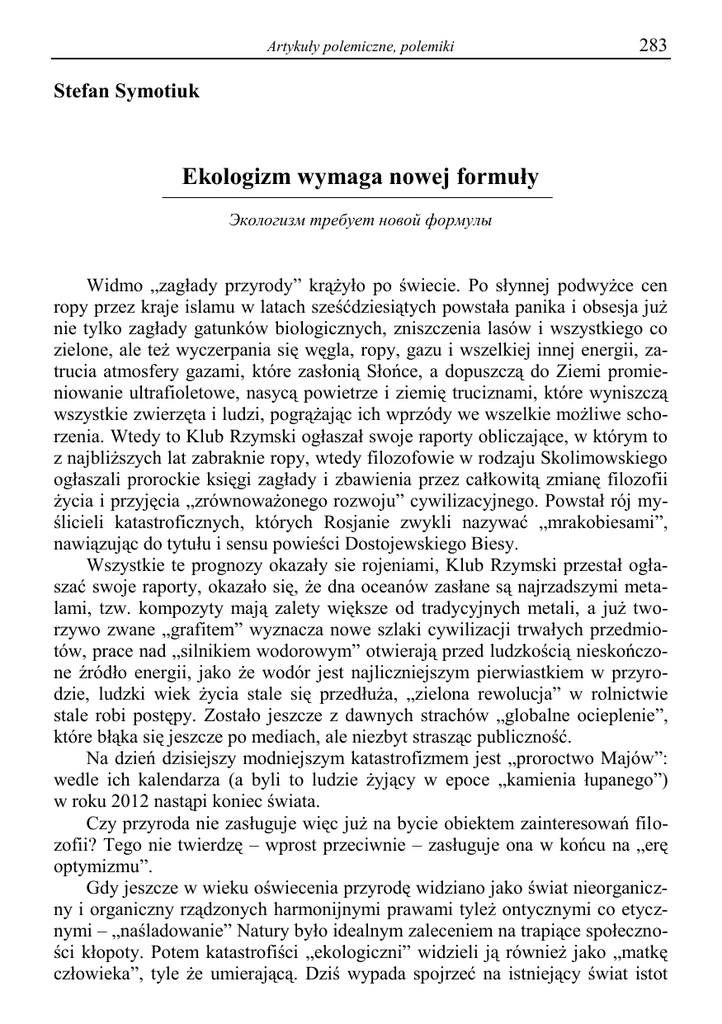 Artykuły polemiczne, polemiki 283 Stefan Symotiuk Ekologizm wymaga nowej formuły Экологизм требует новой формулы Widmo „zagłady przyrody” krążyło po świecie. Po słynnej podwyżce cen ropy przez kraje islamu w latach sześćdziesiątych powstała panika i obsesja już nie tylko zagłady gatunków biologicznych, zniszczenia lasów i wszystkiego co zielone, ale też wyczerpania się węgla, ropy, gazu i wszelkiej innej energii, zatrucia atmosfery gazami, które zasłonią Słońce, a dopuszczą do Ziemi promieniowanie ultrafioletowe, nasycą powietrze i ziemię truciznami, które wyniszczą wszystkie zwierzęta i ludzi, pogrążając ich wprzódy we wszelkie możliwe schorzenia. Wtedy to Klub Rzymski ogłaszał swoje raporty obliczające, w którym to z najbliższych lat zabraknie ropy, wtedy filozofowie w rodzaju Skolimowskiego ogłaszali prorockie księgi zagłady i zbawienia przez całkowitą zmianę filozofii życia i przyjęcia „zrównoważonego rozwoju” cywilizacyjnego. Powstał rój myślicieli katastroficznych, których Rosjanie zwykli nazywać „mrakobiesami”, nawiązując do tytułu i sensu powieści Dostojewskiego Biesy. Wszystkie te prognozy okazały sie rojeniami, Klub Rzymski przestał ogłaszać swoje raporty, okazało się, że dna oceanów zasłane są najrzadszymi metalami, tzw. kompozyty mają zalety większe od tradycyjnych metali, a już tworzywo zwane „grafitem” wyznacza nowe szlaki cywilizacji trwałych przedmiotów, prace nad „silnikiem wodorowym” otwierają przed ludzkością nieskończone źródło energii, jako że wodór jest najliczniejszym pierwiastkiem w przyrodzie, ludzki wiek życia stale się przedłuża, „zielona rewolucja” w rolnictwie stale robi postępy. Zostało jeszcze z dawnych strachów „globalne ocieplenie”, które błąka się jeszcze po mediach, ale niezbyt strasząc publiczność. Na dzień dzisiejszy modniejszym katastrofizmem jest „proroctwo Majów”: wedle ich kalendarza (a byli to ludzie żyjący w epoce „kamienia łupanego”) w roku 2012 nastąpi koniec świata. Czy przyroda nie zasługuje więc już na bycie obiektem zainteresowań filozofii? Tego nie twierdzę – wprost przeciwnie – zasługuje ona w końcu na „erę optymizmu”. Gdy jeszcze w wieku oświecenia przyrodę widziano jako świat nieorganiczny i organiczny rządzonych harmonijnymi prawami tyleż ontycznymi co etycznymi – „naśladowanie” Natury było idealnym zaleceniem na trapiące społeczności kłopoty. Potem katastrofiści „ekologiczni” widzieli ją również jako „matkę człowieka”, tyle że umierającą. Dziś wypada spojrzeć na istniejący świat istot 284 Полемические статьи, полемики żywych jako punkt wyjścia, kapitał dany ludzkości do stworzenia świata bardziej pięknego i doskonałego niż to, co „życie” w swojej samodzielnej, ewolucyjnej, mutacyjnej pracy samo zdołało stworzyć. Ono dotąd rozwijało się wedle zasady „tak krawiec kraje jak mu materii staje”: musiało stale „czołgać sie niewolniczo” wobec środowiska fizykalno-klimatycznego, dostosowując się doń, ostro karane śmiercią za każdą zbytnią fantazję i nowatorstwo. Wygrywało to, co „średnie”, „rozsądne”, banalne. Tylko artyści dotąd spostrzegali te możliwości istot żywych, które fizykalna przyroda tępiła jak mogła, a to skąpiąc istotom żywym surowców, a to niszcząc je klimatem, suszami itp. Słynny francuski „malarz naiwny” celnik Rousseau dał piękne wizje przyrody żywej o baśniowych kształtach, Gauguin ukazywał zwierzęta o niezwykłych kształtach i barwach. Aktualnie zachwyt wzbudził film amerykański Avatar, pokazujący planetę o roślinach i zwierzętach tak baśniowo pięknych, że miałoby się ochotę porzucić rachityczne krzaki i lasy ziemskie i przenieść się na stałe do świata tak bujnego życia i fantastycznego środowiska. Środki po temu zaczynamy opanowywać – to inżynieria genetyczna, ale też nowe możliwości tworzenia nawozów sztucznych, wpływania na klimat itp. Możemy uczynić ziemię wielką oranżerią, pełną bujnego życia, drzew, kwiatów, ptaków itp. Zarazem możemy i nasze organizmy ulepszyć, zmienić, rozwinąć do form, na które nie było s t a ć ubożuchnego świata pierwotnego, w którym zaistniała „ewolucja”. To jest szansa dla Ziemi i człowieka, szansa nowej „odysei”, wielkiej „pierestrojki” historycznej, przygody z „autokreacją”, jaką daje człowiekowi do ręki nauka. Jest całkowitym złudzeniem twierdzenie, że jakiś „zrównoważony rozwój” powstrzyma człowieka przed tym nowym światem życia, że będziemy „filantropijnie” chronić karłowate rośliny, szybko umierające organizmy własne, że poddamy się trapiącym te organizmy chorobom, patrząc na cierpienia osób nam bliskich i własne... To konserwatyzm, minimalizm, samoograniczanie się a nawet m a s o c h i z m tak prognozować przyszłość człowieka na ziemi. To program „czołgania się” przed światem, zamiast stania się w sposób pełny i konsekwentny gatunkiem homo creator, również w odniesieniu do przyrody. Również realizacją nakazu (jeśli dla kogoś ma to znaczenie): „Czyńcie sobie ziemię poddaną”. Właściwie nie jest ta filozofia „kreacji nowej przyrody” kwestią „wyboru” ludzkiego. Jest to raczej kwestia ludzkiego to be or not to be, dylemat Hamleta. Rozwijamy się w świecie podobnym do drabiny, w której górnych partiach szczebli przybywa, a w dolnych szczeble murszeją i odpadają. Możemy iść tylko przed siebie. Stanąć w miejscu a tym bardziej cofnąć się – nie sposób. Dziś konserwatyzm jest większą u t o p i ą , niż dawne wizje „nowego wspaniałego świata”. Cofnięcie się w przeszłość lub zatrzymanie się tu, gdzie jesteśmy, jest większym koszmarem, niż możliwe „rewolucje”. Okazało się za naszych czasów, że m