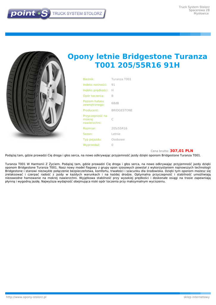 Truck System Stolorz Spacerowa 2B Mysłowice Opony letnie Bridgestone Turanza T001 205/55R16 91H Bieżnik: Turanza T001 Indeks nośności: 91 Indeks prędkości: H Opór toczenia: B Poziom hałasu zewnętrznego: 68dB Producent: BRIDGESTONE Przyczepność na mokrej nawierzchni: C Rozmiar: 205/55R16 Sezon: Letnie Typ pojazdu: Osobowe Wyprzedaż: 0 Cena brutto: 307,01 PLN Podążaj tam, gdzie prowadzi Cię droga i głos serca, na nowo odkrywając przyjemność jazdy dzięki oponom Bridgestone Turanza T001. Turanza T001 W Harmonii Z Życiem. Podążaj tam, gdzie prowadzi Cię droga i głos serca, na nowo odkrywając przyjemność jazdy dzięki oponom Bridgestone Turanza T001. Nasz nowy model flagowy z grupy opon szosowych powstał z wykorzystaniem najnowszych technologii Bridgestone i stanowi niezwykłe połączenie bezpieczeństwa, komfortu, trwałości i szacunku dla środowiska. Dzięki tym oponom możesz się zrelaksować i czerpać radość z jazdy w każdych warunkach i na każdej drodze. Optymalna przyczepność i stabilność umożliwiają niezawodne hamowanie na mokrej nawierzchni. Wyjątkowa stabilność przy wysokiej prędkości i doskonałe osiągi na trasie zapewniają płynną i wygodną jazdę. Najwyższa wydajność obejmująca niski opór toczenia przy maksymalnym wyciszeniu. http://www.opony-stolorz.pl sklep internetowy