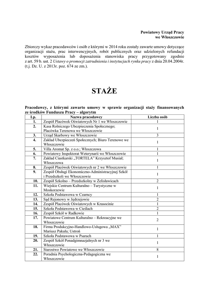 Powiatowy Urząd Pracy we Włoszczowie Zbiorczy wykaz pracodawców i osób z którymi w 2014 roku zostały zawarte umowy dotyczące organizacji stażu, prac interwencyjnych, robót publicznych oraz udzielonych refundacji kosztów wyposażenia lub doposażenia stanowiska pracy przygotowany zgodnie z art. 59 b. ust. 2 Ustawy o promocji zatrudnienia i instytucjach rynku pracy z dnia 20.04.2004r. (t.j. Dz. U. z 2013r. poz. 674 ze zm.). STAŻE Pracodawcy, z którymi zawarto umowy w sprawie organizacji staży finansowanych ze środków Funduszu Pracy – algorytm Lp. 1. 2. 3. 4. 5. 6. 7. 8. 9. 10. 11. 12. 13. 14. 15. 16. 17. 18. 19. 20. 21. 22. Nazwa pracodawcy Zespół Placówek Oświatowych Nr 1 we Włoszczowie Kasa Rolniczego Ubezpieczenia Społecznego; Placówka Terenowa we Włoszczowie Urząd Skarbowy we Włoszczowie Zakład Ubezpieczeń Społecznych; Biuro Terenowe we Włoszczowie Villa Aromat Sp. z o.o.; Włoszczowa Powiatowy Inspektorat Weterynarii we Włoszczowie Zakład Ciastkarski „TORTELA” Krzysztof Musiał; Włoszczowa Zespół Placówek Oświatowych nr 2 we Włoszczowie Zespół Obsługi Ekonomiczno-Administracyjnej Szkół i Przedszkoli we Włoszczowie Zespół Szkolno – Przedszkolny w Żelisławicach Wiejskie Centrum Kulturalno – Turystyczne w Moskorzewie Szkoła Podstawowa w Czarncy Sąd Rejonowy w Jędrzejowie Zespół Placówek Oświatowych w Krasocinie Szkoła Podstawowa w Cieślach Zespół Szkół w Radkowie Powiatowe Centrum Kulturalno – Rekreacyjne we Włoszczowie Firma Produkcyjno-Handlowo-Usługowa „MAX” Mariusz Pakuła; Ustroń Szkoła Podstawowa w Psarach Zespół Szkół Ponadgimnazjalnych nr 3 we Włoszczowie Starostwo Powiatowe we Włoszczowie Poradnia Psychologiczna-Pedagogiczna we Włoszczowie Liczba osób 1 1 3 1 1 1 1 1 1 2 1 1 2 1 2 1 2 1 1 1 8 1 23. 24. 25. 26. 27. 28. 29. 30. 31. 32. 33. 34. 35. 36. 37. 38. 39. 40. 41. 42. 43. 44. 45. 46. 47. 48. 49. 50. 51. Agencja Restrukturyzacji i Modernizacji Rolnictwa Świętokrzyski Oddział Regionalny w Kielcach; Biuro Powiatowe we Włoszczowie Przedszkole Samorządowe Nr 3 we Włoszczowie Przedszkole Samorządowe Nr 2 we Włoszczowie Urząd Gminy Secemin Urząd Gminy Włoszczowa Zespół Opieki Zdrowotnej we Włoszczowie Urząd Gminy Kluczewsko CONECT Marcin Barszcz; Pilczyca WYKOR Sp. z o. o.; Przedbórz Przychodnia Lekarska „EURO-MED” Jolanta Dębska; Secemin DOMEKO Radosław Grabiec; Włoszczowa Przedsiębiorstwo Gospodarki Komunalnej i Mieszkaniowej Sp. z o.o. we Włoszczowie Gminna Spółdzielnia „Samopomoc Chłopska" w Kluczewsku Urząd Gminy Moskorzew CENTRUM BHP Ewelina Niedbał; Włoszczowa Szkoła Podstawowa w Mieczynie ROAD Sp. z o.o.; Włoszczowa Gminny Zespól Ekonomiczno - Administracyjny Szkół w Seceminie Apteka Źródlana, Punkt Apteczny; Szczekociny „Tartak” Marcin Krzysztofik; Chlewice Firma „BIG-WOOD”Alicja Danek; Częstochowa „MNEMONIKSOFT” Grzegorz Kowalczyk; Olkusz „DREWSTOL” P. Grzesiak, D. Milewski Spółka jawna; Secemin Firma Handlowa BUD-STAL Zbigniew Wyrwał; Włoszczowa Przedsiębiorstwo Usługowo-Handlowe „ROLMA” Marian Pasoń; Wola Wiśniowa Piekarnia Cukiernia Tomasz Sosnowski; Włoszczowa Dom Pomocy Społecznej we Włoszczowie Regionalne Centrum Naukowo-Technologiczne w Podzamczu Przedsiębiorstwo Usługowo-Handlowe „KAJAWA” Wojciech Pudło; Włoszczowa Ogółem 2 1 1 1 8 4 1 1 1 1 2 1 1 1 1 1 1 1 1 1 1 1 1 1 1 1 1 1 1 76 Pracodawcy, z którymi zawarto umowy w sprawie organizacji staży w ramach projektu systemowego „Od apatii do sukcesu” realizowanego w ramach Poddziałania 6.1.3 POKL współfinansowanego z EFS Lp. 1. 2. 3. Nazwa pracodawcy Gabinet Kosmetyczny „MAGDA” Magdalena Wolska; Włoszczowa Przychodnia Lekarska „EURO-MED” Jolanta Dębska; Secemin Niepubliczny Zakład Opieki Zdrowotnej „NOVOMED” Dariusz Młodawski; Włoszczowa Liczba osób 1 1 1 4. 5. 6. 7. 8. 9. 10. 11. 12. 13. 14. 15. 16. 17. 18. 19. 20. 21. 22. 23. 24. 25. 26. 27. 28. 29. 30. 31. 32. 33. 34. 35. 36. 37. 38. 39. 40. 41. Firma Usługowo-Handlowa „ATD” Danuta Łęcka; Pilczyca-Kolonia Biuro Rachunkowe Magdalena Szklarz; Wola Świdzińska OL-MAR s.c. Marzec P., Marzec J. Komenda Powiatowa Państwowej Straży Pożarnej we Włoszczowie Zakład Usług Gastronomicznych Leszek Czerwiński; Włoszczowa Villa Aromat Sp. z o.o.; Włoszczowa Firma Handlowa „BELLA” hurt-detal Henryk Celebański; Włoszczowa Zespół Placówek Oświatowych nr 2 we Włoszczowie Zespół Szkół Ponadgimnazjalnych nr 2 we Włoszczowie Zakład Ciastkarski „TORTELA” Krzysztof Musiał; Włoszczowa Gminna Spółdzielnia „Samopomoc Chłopska” w Kluczewsku Ośrodek Szkolenia Kierowców „AUTO-SZKOŁA” Paweł Wasik; Secemin Firma Handlowa „SARA” hurt-detal Justyna Celebańska Firma „BIG-WOOD” Alicja Danek; Częstochowa Firma Handlowa „WAGA” Zbigniew Żesławski I Liceum Ogólnokształcące we Włoszczowie Zespół Obsługi Placówek Oświatowych w Krasocinie Szkoła Podstawowa w Cieślach Firma Usługowo-Handlowa „APOLLO” Michał Hajduk; Chęciny Sklep Motoryzacyjny Anna Szustak; Włoszczowa Zespół Placówek Oświatowych w Kurzelowie Pracownia Protetyczna „NANO-TECH” Paweł Nogajczyk; Kielce Urząd Gminy Nagłowice TRADORE Sp. z o.o.; Kielce Gminny Ośrodek Pomocy Społecznej w Seceminie Gminny Ośrodek Pomocy Społecznej w Krasocinie Biblioteka Publiczna we Włoszczowie Zespół Placówek Oświatowych w Bukowie Hurtownia polfamixów, pasz i dodatków paszowych Beata Potyńska; Jędrzejów P.H.U. „ASTEL” Artur Dzierzgwa; Włoszczowa Hercu Pneumatic Artur Duda; Bilcza CONECT Marcin Barszcz; Pilczyca Działalność Transportowa „RAF-TRANS” Rafał Krzysztofik; Psary Zespół Szkół w Seceminie Powiatowy Urząd Pracy we Włoszczowie Biuro Doradztwa i Usług Karolina Krzysiek; Częstochowa REMA Marek Piechowski; Włoszczowa Urząd Gminy Krasocin 1 1 1 1 1 1 1 1 5 1 2 1 2 1 1 2 2 2 1 1 2 1 1 1 2 2 1 2 1 1 1 1 1 3 5 1 1 8 42. 43. 44. 45. 46. 