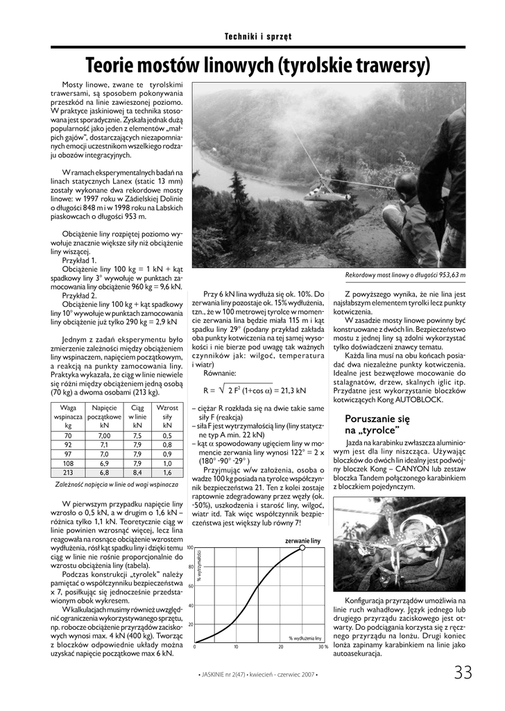 Te chnik i i s pr z ê t Teorie mostów linowych (tyrolskie trawersy) Mosty linowe, zwane też tyrolskimi trawersami, są sposobem pokonywania przeszkód na linie zawieszonej poziomo. W praktyce jaskiniowej ta technika stosowana jest sporadycznie. Zyskała jednak dużą popularność jako jeden z elementów „małpich gajów”, dostarczających niezapomnianych emocji uczestnikom wszelkiego rodzaju obozów integracyjnych. W ramach eksperymentalnych badań na linach statycznych Lanex (static 13 mm) zostały wykonane dwa rekordowe mosty linowe: w 1997 roku w Zádielskiej Dolinie o długości 848 m i w 1998 roku na Labskich piaskowcach o długości 953 m. Obciążenie liny rozpiętej poziomo wywołuje znacznie większe siły niż obciążenie liny wiszącej. Przykład 1. Obciążenie liny 100 kg = 1 kN + kąt spadkowy liny 3° wywołuje w punktach zamocowania liny obciążenie 960 kg = 9,6 kN. Przykład 2. Obciążenie liny 100 kg + kąt spadkowy liny 10° wywołuje w punktach zamocowania liny obciążenie już tylko 290 kg = 2,9 kN Jednym z zadań eksperymentu było zmierzenie zależności między obciążeniem liny wspinaczem, napięciem początkowym, a reakcją na punkty zamocowania liny. Praktyka wykazała, że ciąg w linie niewiele się różni między obciążeniem jedną osobą (70 kg) a dwoma osobami (213 kg). Waga Napięcie wspinacza początkowe kg kN 70 92 97 108 213 7,00 7,1 7,0 6,9 6,8 Ciąg w linie kN Wzrost siły kN 7,5 7,9 7,9 7,9 8,4 0,5 0,8 0,9 1,0 1,6 Zależność napięcia w linie od wagi wspinacza W pierwszym przypadku napięcie liny wzrosło o 0,5 kN, a w drugim o 1,6 kN – różnica tylko 1,1 kN. Teoretycznie ciąg w linie powinien wzrosnąć więcej, lecz lina reagowała na rosnące obciążenie wzrostem wydłużenia, rósł kąt spadku liny i dzięki temu ciąg w linie nie rośnie proporcjonalnie do wzrostu obciążenia liny (tabela). Podczas konstrukcji „tyrolek” należy pamiętać o współczynniku bezpieczeństwa x 7, posiłkując się jednocześnie przedstawionym obok wykresem. W kalkulacjach musimy również uwzględnić ograniczenia wykorzystywanego sprzętu, np. robocze obciążenie przyrządów zaciskowych wynosi max. 4 kN (400 kg). Tworząc z bloczków odpowiednie układy można uzyskać napięcie początkowe max 6 kN. Rekordowy most linowy o długości 953,63 m Przy 6 kN lina wydłuża się ok. 10%. Do zerwania liny pozostaje ok. 15% wydłużenia, tzn., że w 100 metrowej tyrolce w momencie zerwania lina będzie miała 115 m i kąt spadku liny 29° (podany przykład zakłada oba punkty kotwiczenia na tej samej wysokości i nie bierze pod uwagę tak ważnych cz ynników jak: wilgoć, temper atur a i wiatr) Równanie: R= 2 2 F (1+cos ) = 21,3 kN – ciężar R rozkłada się na dwie takie same siły F (reakcja) – siła F jest wytrzymałością liny (liny statyczne typ A min. 22 kN) – kąt spowodowany ugięciem liny w momencie zerwania liny wynosi 122° = 2 x (180° -90° -29° ) Przyjmując w/w założenia, osoba o wadze 100 kg posiada na tyrolce współczynnik bezpieczeństwa 21. Ten z kolei zostaje raptownie zdegradowany przez węzły (ok. -50%), uszkodzenia i starość liny, wilgoć, wiatr itd. Tak więc współczynnik bezpieczeństwa jest większy lub równy 7! Z powyższego wynika, że nie lina jest najsłabszym elementem tyrolki lecz punkty kotwiczenia. W zasadzie mosty linowe powinny być konstruowane z dwóch lin. Bezpieczeństwo mostu z jednej liny są zdolni wykorzystać tylko doświadczeni znawcy tematu. Każda lina musí na obu końcach posiadać dwa niezależne punkty kotwiczenia. Idealne jest bezwęzłowe mocowanie do stalagnatów, drzew, skalnych iglic itp. Przydatne jest wykorzystanie bloczków kotwiczących Kong AUTOBLOCK. Poruszanie się na „tyrolce” Jazda na karabinku zwłaszcza aluminiowym jest dla liny niszcząca. Używając bloczków do dwóch lin idealny jest podwójny bloczek Kong – CANYON lub zestaw bloczka Tandem połączonego karabinkiem z bloczkiem pojedynczym. Koniguracja przyrządów umożliwia na linie ruch wahadłowy. Język jednego lub drugiego przyrządu zaciskowego jest otwarty. Do podciągania korzysta się z ręcznego przyrządu na lonżu. Drugi koniec lonża zapinamy karabinkiem na linie jako autoasekuracja. • JASKINIE nr 2(47) • kwiecień - czerwiec 2007 • 33 W y pr a w y Przy poruszaniu się na jednej linie wspinacz przesuwa przyrząd zaciskowy do przodu, nogą dociska strzemię, które przez mały bloczek ruszy „tandem” (na którym wisi wspinacz) do góry. Przyrząd za tandemem zabezpiecza przed cofnięciem się wspinacza do tyłu. ENGlISh SuMMARIES 10 Göll 2006 Zbigniew Rysiecki In July 2006 the author with seven other cavers from WKTJ Poznań and RKG Nocek Ruda Śląska continued exploration in the Göll massif in the Austrian Alps. The main object explored was Unvollendeterschacht (1336/302). Climbing to windows in Studnia z Oknami (Shaft with Windows) gave way to extensive and spacious old series sloping gently to the south. Three independent downgoing series were found there and explored, as well as some leads approaching surface. These may result in inding a new entrance that would allow to avoid the danger of falling ice in the present entrance series. The new survey amounts to 2110 m in length. The deepest point achieved is at -664 m. The cave is now 2938 m long and the Hochschartehöhlensystem is 10,370 m long. its name is “forty and four”. 14 And 15 expedition of Speleoklub Wrocław to the Picos de Europa th Agnieszka Majewska Opis koniguracji: 1. Przyrząd zaciskowy 2. Karabinek łączący ze strzemieniem 3. Płytka Kong-SLYDE do regulacji strzemienia 4. Mały bloczek do przesuwania tandemu 5. Strzemię pod nogę – REP sznur 6. Krótki express, na którym wisi wspinacz – PA 7. Karabinek łączący bloczki (zapobiega utracie energii podczas używania strzemienia, wynikającej z kiwania się liny) 8. HMS zawiesza mały bloczek na tandemie 9. Tandem (pojedynczy bloczek z powo