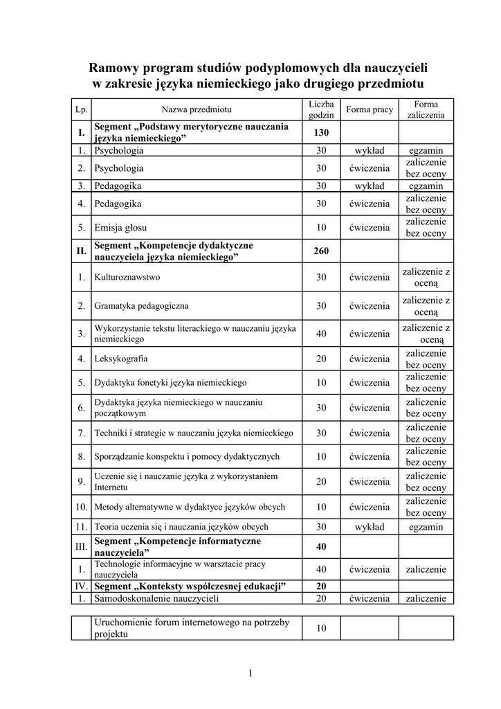Ramowy program studiów podyplomowych dla nauczycieli w zakresie języka niemieckiego jako drugiego przedmiotu Lp. Liczba godzin Nazwa przedmiotu Segment „Podstawy merytoryczne nauczania języka niemieckiego” 1. Psychologia I. Forma pracy 130 30 wykład 2. Psychologia 30 ćwiczenia 3. Pedagogika 30 wykład 4. Pedagogika 30 ćwiczenia 5. Emisja głosu 10 ćwiczenia II. Segment „Kompetencje dydaktyczne nauczyciela języka niemieckiego” Forma zaliczenia egzamin zaliczenie bez oceny egzamin zaliczenie bez oceny zaliczenie bez oceny 260 1. Kulturoznawstwo 30 ćwiczenia zaliczenie z oceną 2. Gramatyka pedagogiczna 30 ćwiczenia zaliczenie z oceną 3. niemieckiego 40 ćwiczenia 4. Leksykografia 20 ćwiczenia 5. Dydaktyka fonetyki języka niemieckiego 10 ćwiczenia 6. początkowym 30 ćwiczenia 7. Techniki i strategie w nauczaniu języka niemieckiego 30 ćwiczenia 8. Sporządzanie konspektu i pomocy dydaktycznych 10 ćwiczenia 9. Internetu 20 ćwiczenia 10. Metody alternatywne w dydaktyce języków obcych 10 ćwiczenia 11. Teoria uczenia się i nauczania języków obcych Segment „Kompetencje informatyczne III. nauczyciela” 30 wykład zaliczenie z oceną zaliczenie bez oceny zaliczenie bez oceny zaliczenie bez oceny zaliczenie bez oceny zaliczenie bez oceny zaliczenie bez oceny zaliczenie bez oceny egzamin 40 ćwiczenia zaliczenie 20 20 ćwiczenia zaliczenie Wykorzystanie tekstu literackiego w nauczaniu języka Dydaktyka języka niemieckiego w nauczaniu Uczenie się i nauczanie języka z wykorzystaniem Technologie informacyjne w warsztacie pracy 1. nauczyciela IV. Segment „Konteksty współczesnej edukacji” 1. Samodoskonalenie nauczycieli Uruchomienie forum internetowego na potrzeby projektu 1 40 10