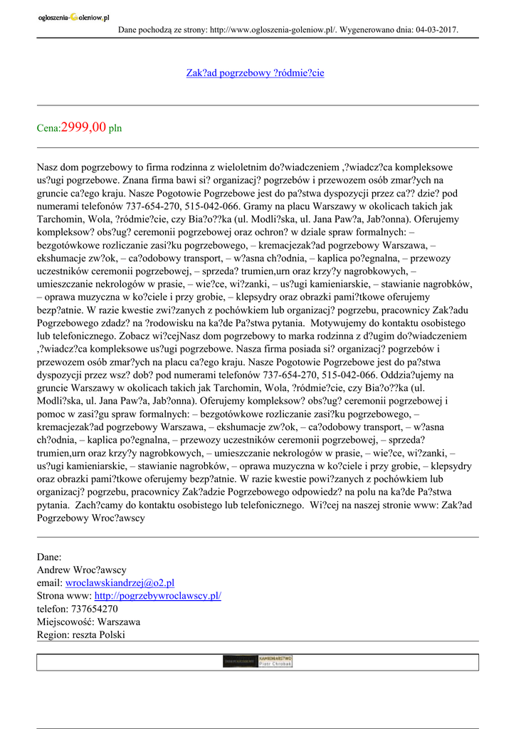 Dane pochodzą ze strony: http://www.ogloszenia-goleniow.pl/. Wygenerowano dnia: 04-03-2017. Zak?ad pogrzebowy ?ródmie?cie Cena:2999,00 pln Nasz dom pogrzebowy to firma rodzinna z wieloletnim do?wiadczeniem ,?wiadcz?ca kompleksowe us?ugi pogrzebowe. Znana firma bawi si? organizacj? pogrzebów i przewozem osób zmar?ych na gruncie ca?ego kraju. Nasze Pogotowie Pogrzebowe jest do pa?stwa dyspozycji przez ca?? dzie? pod numerami telefonów 737-654-270, 515-042-066. Gramy na placu Warszawy w okolicach takich jak Tarchomin, Wola, ?ródmie?cie, czy Bia?o??ka (ul. Modli?ska, ul. Jana Paw?a, Jab?onna). Oferujemy kompleksow? obs?ug? ceremonii pogrzebowej oraz ochron? w dziale spraw formalnych: – bezgotówkowe rozliczanie zasi?ku pogrzebowego, – kremacjezak?ad pogrzebowy Warszawa, – ekshumacje zw?ok, – ca?odobowy transport, – w?asna ch?odnia, – kaplica po?egnalna, – przewozy uczestników ceremonii pogrzebowej, – sprzeda? trumien,urn oraz krzy?y nagrobkowych, – umieszczanie nekrologów w prasie, – wie?ce, wi?zanki, – us?ugi kamieniarskie, – stawianie nagrobków, – oprawa muzyczna w ko?ciele i przy grobie, – klepsydry oraz obrazki pami?tkowe oferujemy bezp?atnie. W razie kwestie zwi?zanych z pochówkiem lub organizacj? pogrzebu, pracownicy Zak?adu Pogrzebowego zdadz? na ?rodowisku na ka?de Pa?stwa pytania. Motywujemy do kontaktu osobistego lub telefonicznego. Zobacz wi?cejNasz dom pogrzebowy to marka rodzinna z d?ugim do?wiadczeniem ,?wiadcz?ca kompleksowe us?ugi pogrzebowe. Nasza firma posiada si? organizacj? pogrzebów i przewozem osób zmar?ych na placu ca?ego kraju. Nasze Pogotowie Pogrzebowe jest do pa?stwa dyspozycji przez wsz? dob? pod numerami telefonów 737-654-270, 515-042-066. Oddzia?ujemy na gruncie Warszawy w okolicach takich jak Tarchomin, Wola, ?ródmie?cie, czy Bia?o??ka (ul. Modli?ska, ul. Jana Paw?a, Jab?onna). Oferujemy kompleksow? obs?ug? ceremonii pogrzebowej i pomoc w zasi?gu spraw formalnych: – bezgotówkowe rozliczanie zasi?ku pogrzebowego, – kremacjezak?ad pogrzebowy Warszawa, – ekshumacje zw?ok, – ca?odobowy transport, – w?asna ch?odnia, – kaplica po?egnalna, – przewozy uczestników ceremonii pogrzebowej, – sprzeda? trumien,urn oraz krzy?y nagrobkowych, – umieszczanie nekrologów w prasie, – wie?ce, wi?zanki, – us?ugi kamieniarskie, – stawianie nagrobków, – oprawa muzyczna w ko?ciele i przy grobie, – klepsydry oraz obrazki pami?tkowe oferujemy bezp?atnie. W razie kwestie powi?zanych z pochówkiem lub organizacj? pogrzebu, pracownicy Zak?adzie Pogrzebowego odpowiedz? na polu na ka?de Pa?stwa pytania. Zach?camy do kontaktu osobistego lub telefonicznego. Wi?cej na naszej stronie www: Zak?ad Pogrzebowy Wroc?awscy Dane: Andrew Wroc?awscy email: [email protected] Strona www: http://pogrzebywroclawscy.pl/ telefon: 737654270 Miejscowość: Warszawa Region: reszta Polski Dane pochodzą ze strony: http://www.ogloszenia-goleniow.pl/. Wygenerowano dnia: 04-03-2017.