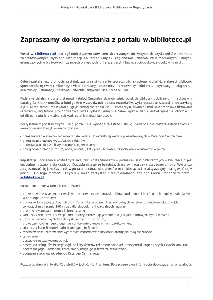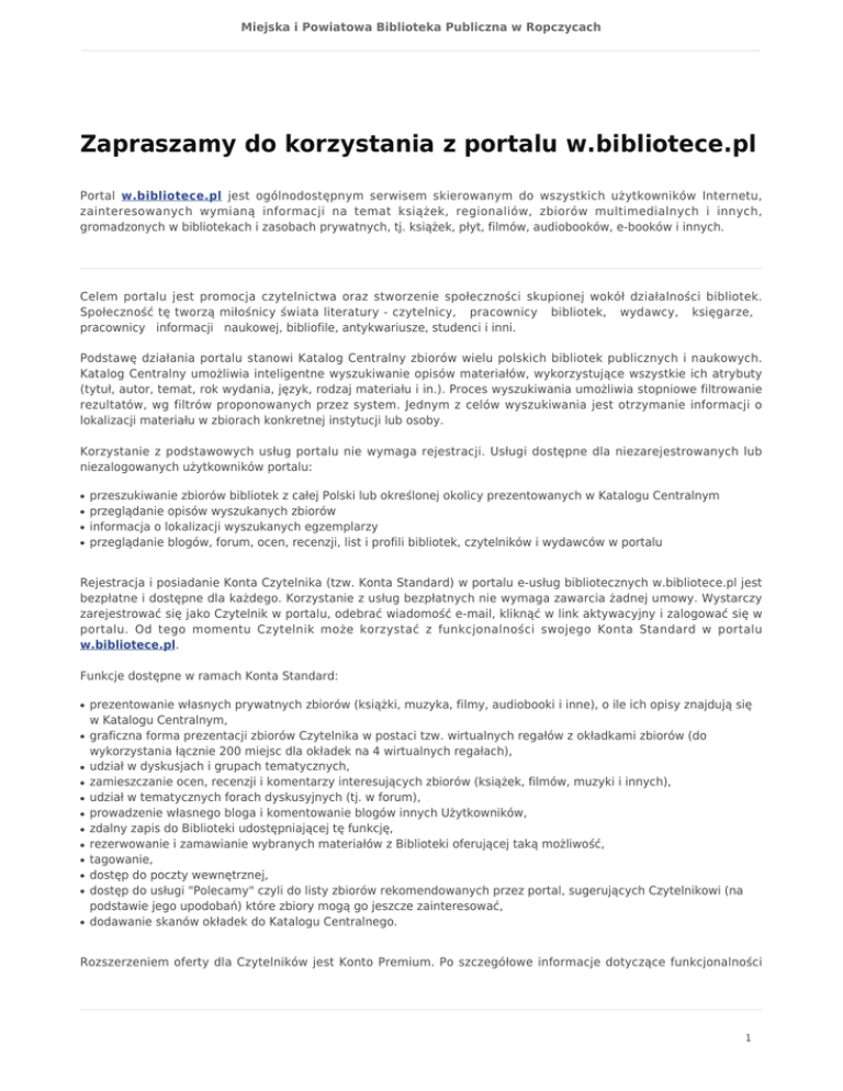 Miejska i Powiatowa Biblioteka Publiczna w Ropczycach Zapraszamy do korzystania z portalu w.bibliotece.pl Portal w.bibliotece.pl jest ogólnodostępnym serwisem skierowanym do wszystkich użytkowników Internetu, zainteresowanych wymianą informacji na temat książek, regionaliów, zbiorów multimedialnych i innych, gromadzonych w bibliotekach i zasobach prywatnych, tj. książek, płyt, filmów, audiobooków, e-booków i innych. Celem portalu jest promocja czytelnictwa oraz stworzenie społeczności skupionej wokół działalności bibliotek. Społeczność tę tworzą miłośnicy świata literatury - czytelnicy, pracownicy bibliotek, wydawcy, księgarze, pracownicy informacji naukowej, bibliofile, antykwariusze, studenci i inni. Podstawę działania portalu stanowi Katalog Centralny zbiorów wielu polskich bibliotek publicznych i naukowych. Katalog Centralny umożliwia inteligentne wyszukiwanie opisów materiałów, wykorzystujące wszystkie ich atrybuty (tytuł, autor, temat, rok wydania, język, rodzaj materiału i in.). Proces wyszukiwania umożliwia stopniowe filtrowanie rezultatów, wg filtrów proponowanych przez system. Jednym z celów wyszukiwania jest otrzymanie informacji o lokalizacji materiału w zbiorach konkretnej instytucji lub osoby. Korzystanie z podstawowych usług portalu nie wymaga rejestracji. Usługi dostępne dla niezarejestrowanych lub niezalogowanych użytkowników portalu: ● ● ● ● przeszukiwanie zbiorów bibliotek z całej Polski lub określonej okolicy prezentowanych w Katalogu Centralnym przeglądanie opisów wyszukanych zbiorów informacja o lokalizacji wyszukanych egzemplarzy przeglądanie blogów, forum, ocen, recenzji, list i profili bibliotek, czytelników i wydawców w portalu Rejestracja i posiadanie Konta Czytelnika (tzw. Konta Standard) w portalu e-usług bibliotecznych w.bibliotece.pl jest bezpłatne i dostępne dla każdego. Korzystanie z usług bezpłatnych nie wymaga zawarcia żadnej umowy. Wystarczy zarejestrować się jako Czytelnik w portalu, odebrać wiadomość e-mail, kliknąć w link aktywacyjny i zalogować się w portalu. Od tego momentu Czytelnik może korzystać z funkcjonalności swojego Konta Standard w portalu w.bibliotece.pl. Funkcje dostępne w ramach Konta Standard: ● ● ● ● ● ● ● ● ● ● ● ● prezentowanie własnych prywatnych zbiorów (książki, muzyka, filmy, audiobooki i inne), o ile ich opisy znajdują się w Katalogu Centralnym, graficzna forma prezentacji zbiorów Czytelnika w postaci tzw. wirtualnych regałów z okładkami zbiorów (do wykorzystania łącznie 200 miejsc dla okładek na 4 wirtualnych regałach), udział w dyskusjach i grupach tematycznych, zamieszczanie ocen, recenzji i komentarzy interesujących zbiorów (książek, filmów, muzyki i innych), udział w tematycznych forach dyskusyjnych (tj. w forum), prowadzenie własnego bloga i komentowanie blogów innych Użytkowników, zdalny zapis do Biblioteki udostępniającej tę funkcję, rezerwowanie i zamawianie wybranych materiałów z Biblioteki oferującej taką możliwość, tagowanie, dostęp do poczty wewnętrznej, dostęp do usługi "Polecamy" czyli do listy zbiorów rekomendowanych przez portal, sugerujących Czytelnikowi (na podstawie jego upodobań) które zbiory mogą go jeszcze zainteresować, dodawanie skanów okładek do Katalogu Centralnego. Rozszerzeniem oferty dla Czytelników jest Konto Premium. Po szczegółowe informacje dotyczące funkcjonalności 1 Miejska i Powiatowa Biblioteka Publiczna w Ropczycach konta Premium odsyłamy do portalu w.bibliotece.pl. 2