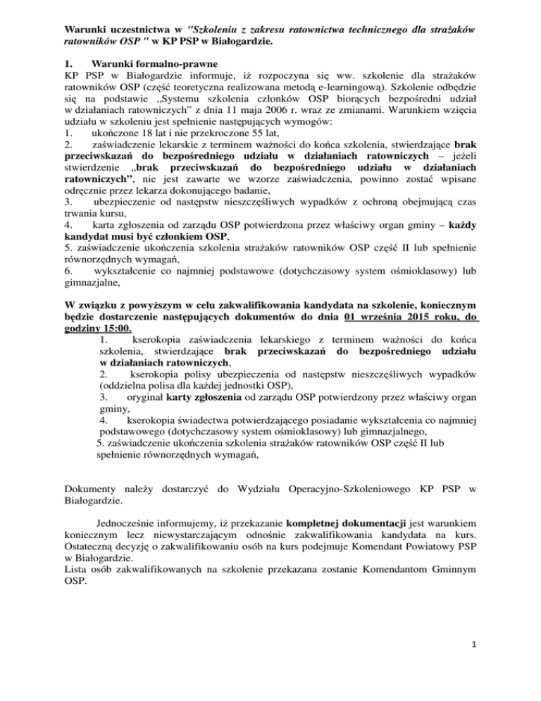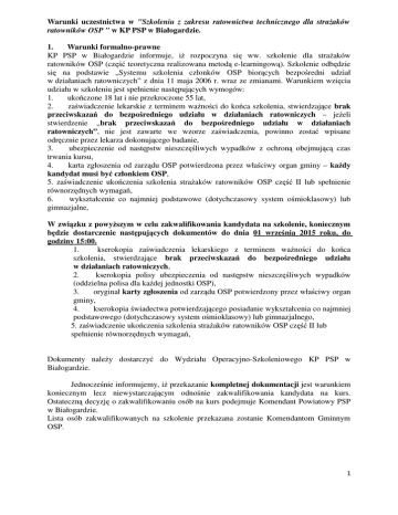 Warunki uczestnictwa w "Szkoleniu z zakresu ratownictwa technicznego dla strażaków ratowników OSP " w KP PSP w Białogardzie. 1. Warunki formalno-prawne KP PSP w Białogardzie informuje, iż rozpoczyna się ww. szkolenie dla strażaków ratowników OSP (część teoretyczna realizowana metodą e-learningową). Szkolenie odbędzie się na podstawie „Systemu szkolenia członków OSP biorących bezpośredni udział w działaniach ratowniczych” z dnia 11 maja 2006 r. wraz ze zmianami. Warunkiem wzięcia udziału w szkoleniu jest spełnienie następujących wymogów: 1. ukończone 18 lat i nie przekroczone 55 lat, 2. zaświadczenie lekarskie z terminem ważności do końca szkolenia, stwierdzające brak przeciwskazań do bezpośredniego udziału w działaniach ratowniczych – jeżeli stwierdzenie „brak przeciwskazań do bezpośredniego udziału w działaniach ratowniczych”, nie jest zawarte we wzorze zaświadczenia, powinno zostać wpisane odręcznie przez lekarza dokonującego badanie, 3. ubezpieczenie od następstw nieszczęśliwych wypadków z ochroną obejmującą czas trwania kursu, 4. karta zgłoszenia od zarządu OSP potwierdzona przez właściwy organ gminy – każdy kandydat musi być członkiem OSP, 5. zaświadczenie ukończenia szkolenia strażaków ratowników OSP część II lub spełnienie równorzędnych wymagań, 6. wykształcenie co najmniej podstawowe (dotychczasowy system ośmioklasowy) lub gimnazjalne, W związku z powyższym w celu zakwalifikowania kandydata na szkolenie, koniecznym będzie dostarczenie następujących dokumentów do dnia 01 września 2015 roku, do godziny 15:00. 1. kserokopia zaświadczenia lekarskiego z terminem ważności do końca szkolenia, stwierdzające brak przeciwskazań do bezpośredniego udziału w działaniach ratowniczych, 2. kserokopia polisy ubezpieczenia od następstw nieszczęśliwych wypadków (oddzielna polisa dla każdej jednostki OSP), 3. oryginał karty zgłoszenia od zarządu OSP potwierdzony przez właściwy organ gminy, 4. kserokopia świadectwa potwierdzającego posiadanie wykształcenia co najmniej podstawowego (dotychczasowy system ośmioklasowy) lub gimnazjalnego, 5. zaświadczenie ukończenia szkolenia strażaków ratowników OSP część II lub spełnienie równorzędnych wymagań, Dokumenty należy dostarczyć do Wydziału Operacyjno-Szkoleniowego KP PSP w Białogardzie. Jednocześnie informujemy, iż przekazanie kompletnej dokumentacji jest warunkiem koniecznym lecz niewystarczającym odnośnie zakwalifikowania kandydata na kurs. Ostateczną decyzję o zakwalifikowaniu osób na kurs podejmuje Komendant Powiatowy PSP w Białogardzie. Lista osób zakwalifikowanych na szkolenie przekazana zostanie Komendantom Gminnym OSP. 1 2. Realizacja szkolenia 2.1.Część teoretyczna – e-learning 2.1.1. Kurs Warunkiem przystąpienia do części praktycznej jest ukończenie 100 % kursu znajdującego się na platformie e-learningowej: • „Ratownictwo techniczne”, Procent realizacji kursu widoczny jest w zakładce „Strona główna”, po zalogowaniu użytkownika. 2.1.2. Test Po ukończeniu szkolenia na platformie e-learningowej, każdy kursant ma obowiązek odbyć również test. Warunkiem jego zaliczenia jest uzyskanie więcej niż 80 % możliwych do zdobycia punktów. Rozpoczęcie testu możliwe w zakładce „Testy”, po zalogowaniu użytkownika. W przypadku zdobycia mniejszej niż wymagana ilość punktów, kursant może zresetować test. Opcja ta możliwa jest w zakładce „Moje konto”- należy kliknąć polecenie „resetuj wyniki testów”. Test należy wykonywać do momentu uzyskania wymaganej liczby punktów. Fakt ukończenia kursu e-learning oraz zaliczenie testu na platformie e-learningowej, będzie sprawdzane w chwili składania dokumentów, czyli do dnia 01 września 2015 roku, do godziny 15:00. W przypadku niezrealizowania w wymaganym zakresie i terminie szkoleń i testów dokumenty kandydata na kurs nie zostaną przyjęte. W związku z ograniczoną ilością miejsc na części praktycznej (20 strażaków), decydującym parametrem o kolejności przyjęć będą wyniki osiągnięte na teście kwalifikującym oraz potrzeby jednostek. Lista osób, które zostaną dopuszczone do części praktycznej kursu przekazana zostanie Komendantom Gminnym OSP. 2.1.3. Test kwalifikujący do kursu W dniu 7 września br. w siedzibie KP PSP w Białogardzie przeprowadzony będzie sprawdzian wiedzy dla strażaków ubiegających się o uczestnictwo w kursie. Sprawdzian będzie zawierał pytania testowe z materiału, który zawarty jest na platformie e-learningowej. Test ma za zadanie wyłonić skład strażaków na kurs, jednocześnie odrzucić osoby, które w sposób nieuczciwy zdobyły zaliczenie na platformie e-learningowej. 2.2.Część praktyczna – zajęcia w JRG KP PSP w Białogardzie. Kurs odbywał się będzie w dniach 13, 19 i 20 września 2015 roku. Warunkiem dopuszczenia do zajęć praktycznych jest ukończenie kursu i zaliczenia testu na platformie e-learningowej oraz zaliczenie testu kwalifikującego do kursu, który przeprowadzony zostanie w dniu 7 września br. w siedzibie KP PSP w Białogardzie. Osoby, które nie spełnią tych warunków, zostaną wykreślone z listy kursantów i nie będą mogły wziąć udziału w części praktycznej. 2 Zajęcia praktyczne odbywać się będą w różnych miejscach, o których informacja dotrze do Komendantów Gminnych OSP, jak tylko zostaną one zagwarantowane. Każdy strażak na zajęciach praktycznych zobowiązany jest posiadać kompletne umundurowanie: środki ochrony indywidualnej: ubranie specjalne, rękawice specjalne, kominiarka, buty · strażackie, hełm strażacki, · ekwipunek osobisty: pas strażacki, toporek strażacki, zatrzaśnik, podpinka. Jednostki posiadające sprzęt hydrauliczny zobowiązane są do ćwiczenia na własnym sprzęcie podczas prowadzonego szkolenia. Obecność na wszystkich zajęciach praktycznych jest obowiązkowa. 2.3.Egzamin Egzami