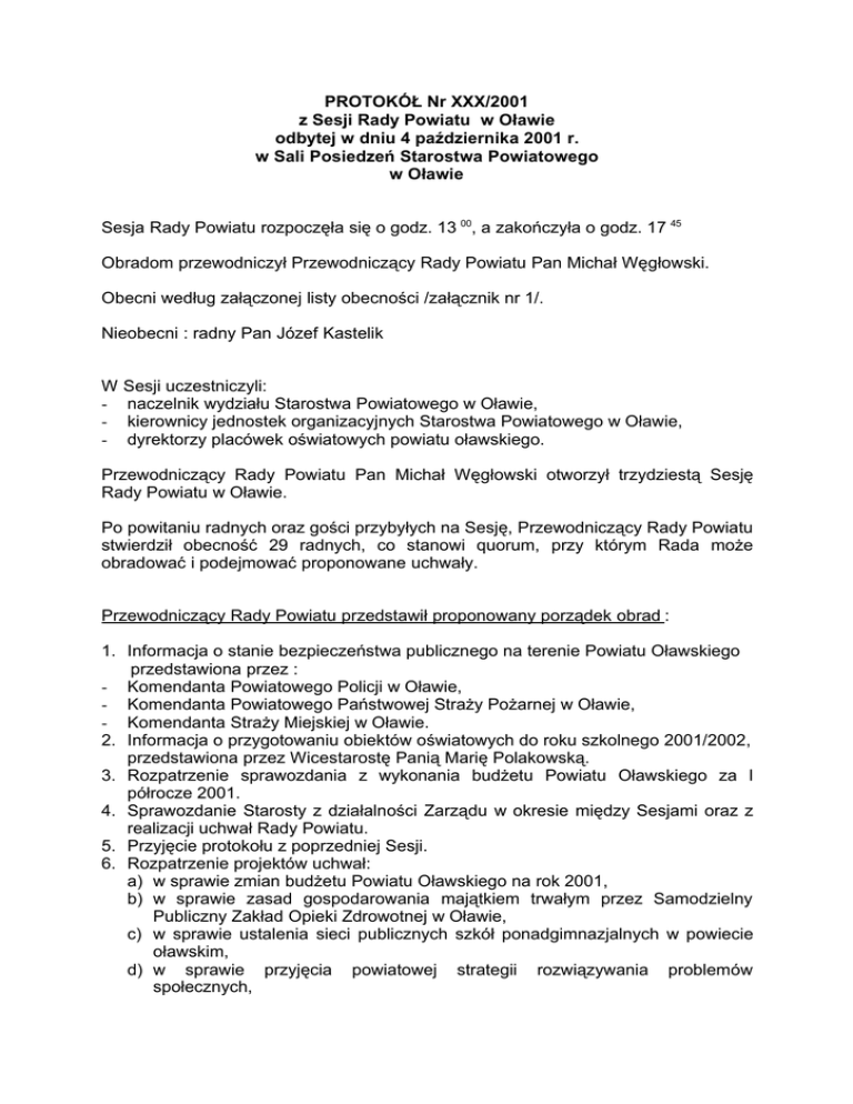 PROTOKÓŁ Nr XXX/2001 z Sesji Rady Powiatu w Oławie odbytej w dniu 4 października 2001 r. w Sali Posiedzeń Starostwa Powiatowego w Oławie Sesja Rady Powiatu rozpoczęła się o godz. 13 00, a zakończyła o godz. 17 45 Obradom przewodniczył Przewodniczący Rady Powiatu Pan Michał Węgłowski. Obecni według załączonej listy obecności /załącznik nr 1/. Nieobecni : radny Pan Józef Kastelik W - Sesji uczestniczyli: naczelnik wydziału Starostwa Powiatowego w Oławie, kierownicy jednostek organizacyjnych Starostwa Powiatowego w Oławie, dyrektorzy placówek oświatowych powiatu oławskiego. Przewodniczący Rady Powiatu Pan Michał Węgłowski otworzył trzydziestą Sesję Rady Powiatu w Oławie. Po powitaniu radnych oraz gości przybyłych na Sesję, Przewodniczący Rady Powiatu stwierdził obecność 29 radnych, co stanowi quorum, przy którym Rada może obradować i podejmować proponowane uchwały. Przewodniczący Rady Powiatu przedstawił proponowany porządek obrad : 1. Informacja o stanie bezpieczeństwa publicznego na terenie Powiatu Oławskiego przedstawiona przez : - Komendanta Powiatowego Policji w Oławie, - Komendanta Powiatowego Państwowej Straży Pożarnej w Oławie, - Komendanta Straży Miejskiej w Oławie. 2. Informacja o przygotowaniu obiektów oświatowych do roku szkolnego 2001/2002, przedstawiona przez Wicestarostę Panią Marię Polakowską. 3. Rozpatrzenie sprawozdania z wykonania budżetu Powiatu Oławskiego za I półrocze 2001. 4. Sprawozdanie Starosty z działalności Zarządu w okresie między Sesjami oraz z realizacji uchwał Rady Powiatu. 5. Przyjęcie protokołu z poprzedniej Sesji. 6. Rozpatrzenie projektów uchwał: a) w sprawie zmian budżetu Powiatu Oławskiego na rok 2001, b) w sprawie zasad gospodarowania majątkiem trwałym przez Samodzielny Publiczny Zakład Opieki Zdrowotnej w Oławie, c) w sprawie ustalenia sieci publicznych szkół ponadgimnazjalnych w powiecie oławskim, d) w sprawie przyjęcia powiatowej strategii rozwiązywania problemów społecznych, e) zmieniająca uchwałę Nr XX/126/2000 Rady Powiatu w Oławie z dnia 7 listopada 2000 r. w sprawie wysokości diet przysługujących radnemu Powiatu Oławskiego. 7. Sprawy samorządu powiatowego, komunikaty, interpelacje, zapytania, wnioski i oświadczenia radnych. Przewodniczący Rady Powiatu zaproponował wprowadzenie do punktu 6 proponowanego porządku obrad Sesji, projektu uchwały w sprawie skargi Pani Anny Kotlińskiej, na działalność Powiatowego Inspektora Nadzoru Budowlanego w Oławie. Radny Pan Arkadiusz Stefaniszyn przedstawił wniosek Komisji Promocji, Rozwoju Gospodarczego i Infrastruktury Technicznej dot. zdjęcia z porządku obrad Sesji uchwały zmieniającej uchwałę Nr XX/126/2000 Rady Powiatu w Oławie z dnia 7 listopada 2000 r. w sprawie wysokości diet przysługujących radnemu Powiatu Oławskiego. Rada Powiatu jednogłośnie przyjęła proponowaną zmianę do porządku obrad Sesji poprzez wprowadzenie do punktu 6 „Rozpatrzenie projektów uchwał”, projektu uchwały w sprawie skargi Anny Kotlińskiej, na działalność Powiatowego Inspektora Nadzoru Budowlanego w Oławie. Przewodniczący Rady poddał pod głosowanie wniosek Komisji Promocji, Rozwoju Gospodarczego i Infrastruktury Technicznej. W wyniku jawnego głosowania Rad Powiatu większością głosów zdjęła z porządku obrad Sesji projekt uchwały zmieniający uchwałę Nr XX/126/2000 Rady Powiatu w Oławie z dnia 7 listopada w sprawie wysokości diet przysługujących radnemu Powiatu Oławskiego. Przewodniczący Rady Powiatu poddał pod głosowanie proponowany porządek obrad wraz z przyjętymi zmianami. Rada Powiatu jednogłośnie przyjęła porządek obrad Sesji wraz z przyjętymi zmianami. W głosowaniu uczestniczyło 29 radnych. Przewodniczący Rady Powiatu, Starosta Pan Stanisław Kałuża oraz Wicestarosta Pani Maria Polakowska dokonali aktu wręczenia listów gratulacyjnych rodzicom uczniów szkół średnich, z tytułu przyznania stypendium Prezesa Rady Ministrów za wybitne osiągnięcia w nauce. Ad. 1 Informacja o stanie bezpieczeństwa publicznego na terenie Powiatu Oławskiego, przedstawiona przez Komendanta Powiatowego Policji w Oławie, Przewodniczący Rady Powiatu poprosił Komendanta Powiatowego Policji w Oławie Pana Józefa Kusia o przedstawienie powyższej informacji /załącznik nr 2/. Przewodniczący Rady Powiatu podziękował Komendantowi Powiatowemu Policji w Oławie Panu Józefowi Kusiowi za przedstawienie informacji o stanie bezpieczeństwa publicznego na terenie Powiatu Oławskiego. Informacja o stanie bezpieczeństwa publicznego na terenie Powiatu Oławskiego, przedstawiona przez Komendanta Powiatowego Państwowej Straży Pożarnej w Oławie. Przewodniczący Rady Powiatu poprosił Komendanta Powiatowego Państwowej Straży Pożarnej w Oławie Pana Jerzego Łabowskiego o przedstawienie powyższej informacji /załącznik nr 3/. Przewodniczący Rady Powiatu podziękował Komendantowi Powiatowemu Policji w Oławie Panu Jerzemu Łabowskiemu za przedstawienie informacji o stanie bezpieczeństwa publicznego na terenie Powiatu Oławskiego. Informacja o stanie bezpieczeństwa publicznego na terenie Powiatu Oławskiego, przedstawiona przez Komendanta Straży Miejskiej w Oławie. Przewodniczący Rady Powiatu poprosił Komendanta Straży Miejskiej Pana Stanisława Kwiatkowskiego o przedstawienie powyższej informacji /załącznik nr 4/. Nadto Komendant Straży Miejskiej przedstawił informację o wspólnych działaniach z Policją za okres I półrocza 2001 r. /załącznik nr 4/. Przewodniczący Rady Powiatu podziękował Komendantowi Straży Miejskiej w Oławie Panu Stanisławowi Kwiatkowskiemu za przedstawienie powyższych informacji. Przewodniczący Komisji Przestrzegania Prawa i Porządku Publicznego Pan Jacek Pilawa przedstawił stanowisko Rady Powiatu Oławskiego w sprawie bezpieczeństwa i porządku publicznego /załącznik nr 5/. Rada Powiatu powyższe stanowisko przyjęła pr