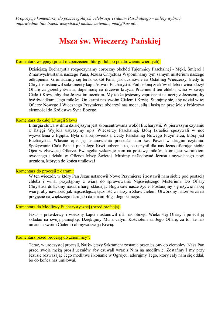 Propozycje komentarzy do poszczególnych celebracji Triduum Paschalnego – należy wybrać odpowiednie (nie trzeba wszystkich) można zmieniać, modyfikować… Msza św. Wieczerzy Pańskiej Komentarz wstępny (przed rozpoczęciem liturgii lub po pozdrowieniu wiernych): Dzisiejszą Eucharystią rozpoczynamy coroczny obchód Tajemnicy Paschalnej - Męki, Śmierci i Zmartwychwstania naszego Pana, Jezusa Chrystusa Wspominamy tym samym misterium naszego odkupienia. Gromadzimy się teraz wokół Pana, jak uczniowie na Ostatniej Wieczerzy, kiedy to Chrystus ustanowił sakramenty kapłaństwa i Eucharystii. Pod osłoną znaków chleba i wina złożył Ofiarę za grzechy świata, dopełnioną na drzewie krzyża. Przemienił ten chleb i wino w swoje Ciało i Krew, aby dać Je swoim uczniom. My także jesteśmy zaproszeni na ucztę z Jezusem, by być świadkami Jego miłości. On karmi nas swoim Ciałem i Krwią. Starajmy się, aby udział w tej Ofierze Nowego i Wiecznego Przymierza obdarzył nas mocą, siłą i łaską na przejście z królestwa ciemności do Królestwa Syna Bożego. Komentarz do całej Liturgii Słowa Liturgia słowa w dniu dzisiejszym jest skoncentrowana wokół Eucharystii. W pierwszym czytaniu z Księgi Wyjścia usłyszymy opis Wieczerzy Paschalnej, którą Izraelici spożywali w noc wyzwolenia z Egiptu. Była ona zapowiedzią Uczty Paschalnej Nowego Przymierza, którą jest Eucharystia. Właśnie opis jej ustanowienia przekaże nam św. Paweł w drugim czytaniu. Spożywanie Ciała Pana i picie Jego Krwi uobecnia to, co uczynił dla nas Jezus ofiarując siebie Ojcu w zbawczej Ofierze. Ewangelia wskazuje nam na postawę miłości, która jest warunkiem owocnego udziału w Ofierze Mszy Świętej. Musimy naśladować Jezusa umywającego nogi uczniom, których do końca umiłował Komentarz do procesji z darami: W ten wieczór, w który Pan Jezus ustanowił Nowe Przymierze i zostawił nam siebie pod postacią chleba i wina, przystąpmy z wiarą do sprawowania Najświętszego Misterium. Do Ofiary Chrystusa dołączmy naszą ofiarę, składając Bogu całe nasze życie. Postarajmy się ożywić naszą wiarę, aby nawiązać jak najściślejszą łączność z naszym Zbawicielem. Otwórzmy nasze serca na przyjęcie największego daru jaki daje nam Bóg - Jego samego. Komentarz do Modlitwy Eucharystycznej (przed prefacją): Jezus - prawdziwy i wieczny kapłan ustanowił dla nas obrzęd Wiekuistej Ofiary i polecił ją składać na swoją pamiątkę. Dziękujmy Mu z całym Kościołem za Jego Ofiarę, za to, że nas umacnia swoim Ciałem i obmywa swoją Krwią. Komentarz przed procesją do „ciemnicy”: Teraz, w uroczystej procesji, Najświętszy Sakrament zostanie przeniesiony do ciemnicy. Nasz Pan przed swoją męką prosił uczniów aby czuwali wraz z Nim na modlitwie. Zostańmy i my przy Jezusie rozważając Jego modlitwę i konanie w Ogrójcu, adorujmy Tego, który cały nam się oddał, bo do końca nas umiłował. Liturgia Męki Pańskiej Komentarz (przed wejściem asysty i celebransa) Kończąc pierwszy dzień Triduum Paschalnego gromadzimy się w ciszy i skupieniu na sprawowaniu pamiątki męki i śmierci naszego Pana, Jezusa Chrystusa. Chcemy przeżywać wypełnienie zapowiedzi, którą Jezus dał swoim uczniom w Wieczerniku. W tych godzinach, które przypominają nam czas męki Zbawiciela będziemy rozważać Słowo Boże i adorować Krzyż, na którym Jezus rozciągnął swoje ręce, aby zgromadzić w jedno rozproszone dzieci Boże. Wspominając śmierć Chrystusa pamiętajmy, iż nie była ona dla niego klęską i przegraną. Była zwycięstwem i została opromieniona blaskiem zmartwychwstania. Za chwilę uklękniemy przed Bożym majestatem i będziemy modlić się w ciszy, podczas gdy kapłani będą leżeć krzyżem - w postawie największego uniżenia. Komentarz do całej Liturgii Słowa Liturgia słowa jest dzisiaj skoncentrowana na zbawczej męce naszego Pana. Pierwsze czytanie zawiera proroctwo Izajasza ukazujące cierpienia Sługi Pańskiego. Tym Sługą jest Pan Jezus, który poniósł śmierć za nasze grzechy. To on jest Mesjaszem zapowiadanym przez proroków. Był On do nas podobny we wszystkim oprócz grzechu, jak mówi o Nim drugie czytanie. Dlatego możemy się do Niego zbliżać z wielką ufnością. W opisie Męki Pańskiej według świętego Jana ukaże nam się obraz Jezusa, który dobrowolnie oddaje swoje życie abyśmy my sami mogli życie odzyskać. Komentarz do modlitwy powszechnej Chrystus umarł za całą ludzkość. Podwyższony na krzyżu przyciągnął wszystkich do siebie. Dlatego módlmy się za wszystkich ludzi i cały świat. Uczynimy to modlitwą sięgającą chrześcijańskiej starożytności. Na każde wezwanie, którym zwróci się do nas kapłan [diakon] odpowiedzmy modlitwą w ciszy. Następnie kapłan zbierze nasze modlitwy szczególną prośbą, po której wypowiedzmy “Amen” na znak osobistego potwierdzenia. Komentarz do kolekty (czytany w czasie zbierania kolekty) Kolekta zbierana w czasie Liturgii Wielkopiątkowej przeznaczona jest na Boży Grób w Jerozolimie oraz potrzeby chrześcijan w Ziemi Świętej. Nasz dar materialny ma być dziś wyrazem odpowiedzialności za miejsca, gdzie żył i umarł Jezus Chrystus, jak też za tych nielicznych chrześcijan żyjących tam obecnie. Ma to być skuteczny znak miłości i solidarności z tymi, którzy opiekują się miejscami świętymi, a zwłaszcza Bazyliką Bożego Grobu w Jerozolimie, która zawiera w swym wnętrzu Golgotę – miejsce śmierci Chrystusa i grób – miejsce Jego zmartwychwstania. Chrześcijanie w Ziemi Świętej znajdują się w zdecydowanej mniejszości i dlatego też pomagamy im naszą ofiarą w utrzymaniu szkół katolickich, tworzeniu Ośrodków Studium Biblijnego, upowszechnianiu kultury chrześcijańskiego wschodu, w działalności instytucji duszpasterskich, kulturalnych i charytatywnych Kościołów Wschodnich, szczególnie Patriarchatu Łacińskiego Je