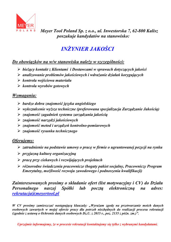 Meyer Tool Poland Sp. z o.o., ul. Inwestorska 7, 62-800 Kalisz poszukuje kandydatów na stanowisko: INŻYNIER JAKOŚCI Do obowiązków na w/w stanowisku należy w szczególności: bieżący kontakt z Klientami i Dostawcami w sprawach dotyczących jakości analizowanie problemów jakościowych i wdrażanie działań korygujących kontrola wejściowa materiału kontrola wyrobów gotowych Wymagania: bardzo dobra znajomość języka angielskiego wykształcenie wyższe techniczne (preferowana specjalizacja Zarządzanie Jakością) znajomość zagadnień systemu zarządzania jakością znajomość narzędzi jakościowych znajomość metod i urządzeń kontrolno-pomiarowych znajomość rysunku technicznego Oferujemy: zatrudnienie na podstawie umowy o pracę w firmie o ugruntowanej pozycji na rynku przyjazną kulturę organizacyjną pracę przy ciekawych i rozwijających projektach różnorodne świadczenia pracownicze (bogaty pakiet socjalny, Pracowniczy Program Emerytalny, możliwość rozwoju zawodowego i podnoszenia kwalifikacji) Zainteresowanych prosimy o składanie ofert (list motywacyjny i CV) do Działu Personalnego naszej Spółki lub pocztą elektroniczną na adres: [email protected] W CV prosimy zamieszczać następującą klauzulę: „Wyrażam zgodę na przetwarzanie moich danych osobowych zawartych w mojej ofercie pracy dla potrzeb niezbędnych do realizacji procesu rekrutacji (zgodnie z ustawą o Ochronie danych osobowych Dz.U. z 2015 r., poz. 2135 z późn. zm.)”. Uprzejmie informujemy, że w procesie rekrutacji kontaktujemy się tylko z wybranymi kandydatami.