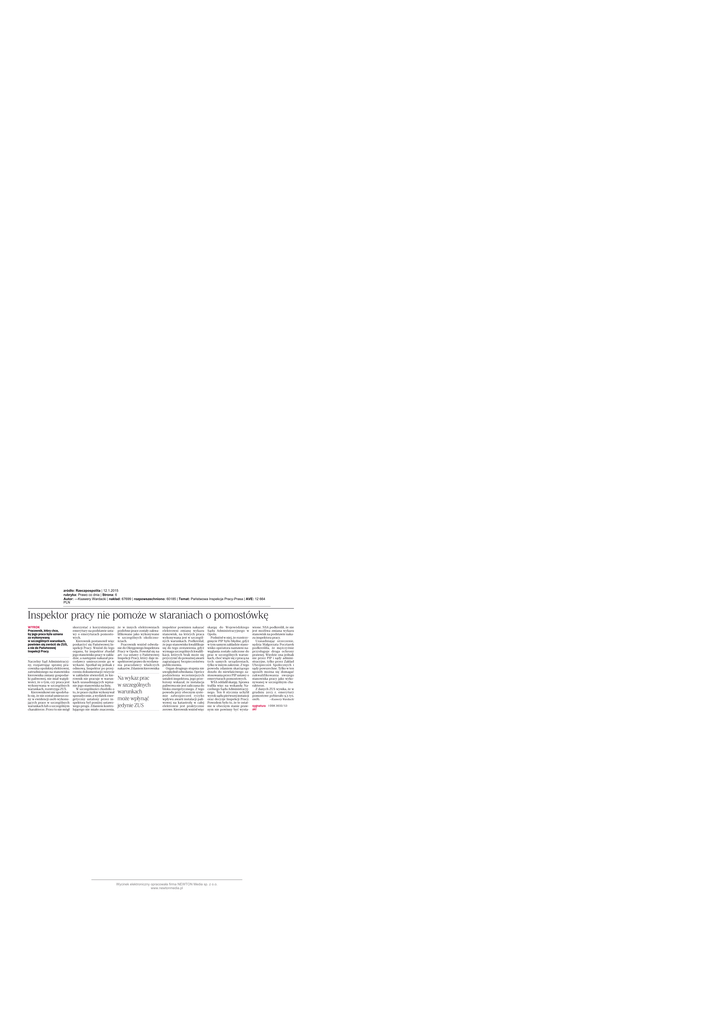 zródło: Rzeczpospolita | 12.1.2015 rubryka: Prawo co dnia | Strona: 6 Autor: —Ksawery Wardacki | nakład: 67699 | rozpowszechniono: 60185 | Temat: Państwowa Inspekcja Pracy-Prasa | AVE: 12 664 PLN Inspektor pracy nie pomoże w staraniach o pomostówkę WYROK Pracownik, który chce, by jego praca była uznana za wykonywaną w szczególnych warunkach, powinien się zwrócić do ZUS, a nie do Państwowej Inspekcji Pracy. Naczelny Sąd Administracyjny, rozpatrując sprawę pracownika opolskiej elektrowni, zatrudnionego na stanowisku kierownika zmiany gospodarki paliwowej, nie miał wątpliwości, że o tym, czy praca jest wykonywana w szczególnych warunkach, rozstrzyga ZUS. Kierownikowi nie spodobało się, że nie został umieszczony w ewidencji osób wykonujących prace w szczególnych warunkach lub o szczególnym charakterze. Przez to nie mógł skorzystać z korzystniejszej emerytury na podstawie ustawy o emeryturach pomostowych. Kierownik postanowił więc poskarżyć się Państwowej Inspekcji Pracy. Wniósł do tego organu, by inspektor zbadał jego stanowisko pracy w zakładzie, a następnie nakazał pracodawcy umieszczenie go w wykazie. Spotkał się jednak z odmową. Inspektor po przejrzeniu dokumentacji i wizycie w zakładzie stwierdził, że kierownik nie pracuje w warunkach uzasadniających wpisanie jego stanowiska na listę. W szczególności chodziło o to, że prace ciężkie wykonywał sporadycznie, a wydatek energetyczny ustalony przez inspektora był poniżej ustawowego progu. Zdaniem kontrolującego nie miało znaczenia, że w innych elektrowniach podobne prace zostały zakwalifikowane jako wykonywane w szczególnych okolicznościach. Pracownik wniósł odwołanie do Okręgowego Inspektora Pracy w Opolu. Powołał się na art. 11a ustawy o Państwowej Inspekcji Pracy, który daje inspektorowi prawo do wydawania pracodawcy władczych nakazów. Zdaniem kierownika Na wykaz prac w szczególnych warunkach może wpłynąć jedynie ZUS inspektor powinien nakazać elektrowni zmianę wykazu stanowisk, na których praca wykonywana jest w szczególnych warunkach. Podkreślał, że jego stanowisko kwalifikuje się do tego zestawienia, gdyż wymaga szczególnych kwalifikacji, których brak może się przyczynić do poważnej awarii zagrażającej bezpieczeństwu publicznemu. Organ drugiego stopnia nie uwzględnił odwołania. Oprócz podzielenia wcześniejszych ustaleń inspektora, jego przełożony wskazał, że instalacja paliwowa nie jest zaliczana do bloku energetycznego. Z tego powodu przy obecnym systemie zabezpieczeń ryzyko wpływu awarii instalacji paliwowej na katastrofę w całej elektrowni jest praktycznie zerowe. Kierownik wniósł więc skargę do Wojewódzkiego Sądu Administracyjnego w Opolu. Podniósł w niej, że rozstrzygnięcie PIP było błędne, gdyż w tym samym zakładzie stanowisko operatora nastawni nawęglania zostało zaliczone do prac w szczególnych warunkach, choć wiąże się z pracą na tych samych urządzeniach, tylko w innym zakresie. Z tego powodu zdaniem skarżącego doszło do niewłaściwego zastosowania przez PIP ustawy o emeryturach pomostowych. WSA oddalił skargę. Sprawa trafiła więc na wokandę Naczelnego Sądu Administracyjnego. Ten 8 stycznia uchylił wyrok sądu pierwszej instancji oraz decyzje Inspekcji Pracy. Powodem było to, że te ostatnie w obecnym stanie prawnym nie powinny być wysta- Wycinek elektroniczny opracowała firma NEWTON Media sp. z o.o. www.newtonmedia.pl wione. NSA podkreślił, że nie jest możliwa zmiana wykazu stanowisk na podstawie nakazu inspektora pracy. Uzasadniając orzeczenie, sędzia Małgorzata Pocztarek podkreśliła, że mężczyźnie przysługuje droga ochrony prawnej. Wiedzie ona jednak nie przez PIP i sądy administracyjne, tylko przez Zakład Ubezpieczeń Społecznych i sądy powszechne. Tylko w ten sposób można się domagać zakwalifikowania swojego stanowiska pracy jako wykonywanej w szczególnym charakterze. Z danych ZUS wynika, że w grudniu 2013 r. emerytury pomostowe pobierało 9,3 tys. —Ksawery Wardacki osób. sygnatura I OSK 3032/13 akt