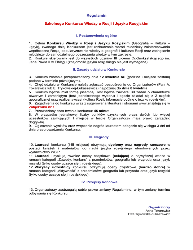 Regulamin Szkolnego Konkursu Wiedzy o Rosji i Języku Rosyjskim I. Postanowienia ogólne 1. Celem Konkursu Wiedzy o Rosji i Języku Rosyjskim (Geografia – Kultura – Język), zwanego dalej Konkursem jest rozbudzanie wśród młodzieży zainteresowania współczesną Rosją, popularyzowanie wiedzy o geografii i kulturze Rosji oraz zachęcanie młodzieży do samodzielnego poszerzania wiedzy w tym zakresie. 2. Konkurs skierowany jest do wszystkich uczniów III Liceum Ogólnokształcącego im. Jana Pawła II w Elblągu (znajomość języka rosyjskiego nie jest wymagana). II. Zasady udziału w Konkursie 3. Konkurs zostanie przeprowadzony dnia 12 kwietnia br. (godzina i miejsce zostaną podane w terminie późniejszym). 4. Chęć udziału w Konkursie należy zgłaszać bezpośrednio do Organizatorów (Pani A. Tokarewicz lub E. Trykowskiej-Łukaszewicz) najpóźniej do dnia 8 kwietnia. 5. Konkurs będzie miał formę pisemną. Test będzie zawierał 30 zadań o charakterze otwartym i zamkniętym (test jednokrotnego wyboru) i będzie składał się z 2 części: geograficznej oraz realioznawczej (kultura Rosji, informacje ogólne o języku rosyjskim). 6. Zagadnienia do konkursu wraz z sugerowaną literaturą i stronami www znajdują się w Załączniku nr 1. 7. Przewidziany czas trwania konkursu: 45 minut. 8. W przypadku jednakowej liczby punktów uzyskanych przez dwóch lub więcej uczestników zajmujących I miejsce w teście Organizatorzy mają prawo zarządzić dogrywkę. 9. Ogłoszenie wyników oraz wręczenie nagród laureatom odbędzie się w ciągu 3 dni od dnia przeprowadzenia Konkursu. III. Nagrody 10. Laureaci konkursu (I-III miejsce) otrzymują dyplomy oraz nagrody rzeczowe w postaci książek i materiałów do nauki języka rosyjskiego ufundowanych przez wydawnictwo WSiP. 11. Laureaci uzyskują również oceny cząstkowe (celujące) o najwyższej wadze w ramach kategorii „Zawody, konkurs” z przedmiotów: geografia lub przyroda oraz język rosyjski (tylko osoby uczące się j. rosyjskiego). 12. Wszyscy uczestnicy konkursu otrzymują oceny cząstkowe (bardzo dobre) w ramach kategorii „Aktywność” z przedmiotów: geografia lub przyroda oraz język rosyjski (tylko osoby uczące się j. rosyjskiego). IV. Przepisy końcowe 13. Organizatorzy zastrzegają sobie prawo zmiany Regulaminu, w tym zmiany terminu odbywania się Konkursu. Organizatorzy Anna Tokarewicz Ewa Trykowska-Łukaszewicz Załącznik nr 1 Zagadnienia do konkursu Wiedzy o Rosji i języku rosyjskim Kultura Rosji 1. Religia w Rosji – prawosławie (różnice pomiędzy kościołem prawosławnym a katolickim mi. in. obowiązujący kalendarz, krzyż prawosławny, odrzucane dogmaty). 2. Moskwa i Sankt-Petersburg - czas powstania i założyciele; zabytki (wygląd zewnętrzny, informacje ogólne) a) Moskwa – Kreml, Plac Czerwony, Galeria Trietiakowska, ulica Stary Arbat, Car-puszka, Carkołokoł, b) Sankt-Petersburg – Ermitaż, Newski prospekt, Sobór św. Izaaka, Twierdza Pietropawłowska; 3. Najważniejsze święta – Boże Narodzenie, Nowy Rok, Wielkanoc/Pascha (kiedy są obchodzone, charakterystyczne tradycje, symbole i potrawy związane z tymi świętami); 4. Tradycyjne potrawy rosyjskie – solanka, ucha, szczi, bliny, pielmieni, Beouf Strogonow (sposób przygotowania, wygląd); 5. Pamiątki i symbole Rosji – matrioszka, samowar, bałałajka, Palech, Chochłoma, walonki, jaja Faberge (wygląd zew., co przedstawiają lub symbolizują); 6. Najwybitniejsi Rosjanie i ich najważniejsze dzieła /osiągnięcia – Fiodor Dostojewski, Lew Tołstoj, Piotr Czajkowski, Michaił Bułhakow, Andrej Rublow, Kazimierz Malewicz, Nikita Michałkow; 7. Kolej Transsyberyjska – czas powstania, długość, trasa (skąd – dokąd); 8. Język rosyjski – twórcy, pochodzenie, alfabet (nazwa obecna, ilość liter), ilość użytkowników języka na świecie. Geografia Rosji 1. Warunki naturalne – znajomość mapy fizycznej: wody powierzchniowe (rzeki, jeziora, kanały), ukształtowanie powierzchni, krainy geograficzne (góry, wyżyny, niziny, depresje), klimat, gleby, strefy roślinne; 2. Strefy czasowe – obliczanie czasu słonecznego i strefowego; 3. Ludność i powierzchnia – liczba ludności, gęstość zaludnienia, struktura płci i wieku, urbanizacja, największe miasta Rosji. Geografia i kultura Rosji – proponowane strony www i literatura: 1. http://www.rosjapl.info/ 2. http://www.rosja.pl/rosja-przewodnik-turystyczny.xml 3. http://www.abcrosja.pl/ 4. http://wikitravel.org/pl/Rosja 5. http://navtur.pl/world/country/32,rosja 6. http://rosja.lovetotravel.pl/ 7. http://www.rosja.ru/geografia/index.html 8. http://www.rosja.ru/geografia/natural.html 9. http://www.rosjapl.info/historia-rosji-ukrainy-zsrr/ludnosc-rosji.html 10. Atlas geograficzny dla szkół ponadgimnazjalnych 11. Świat w liczbach.