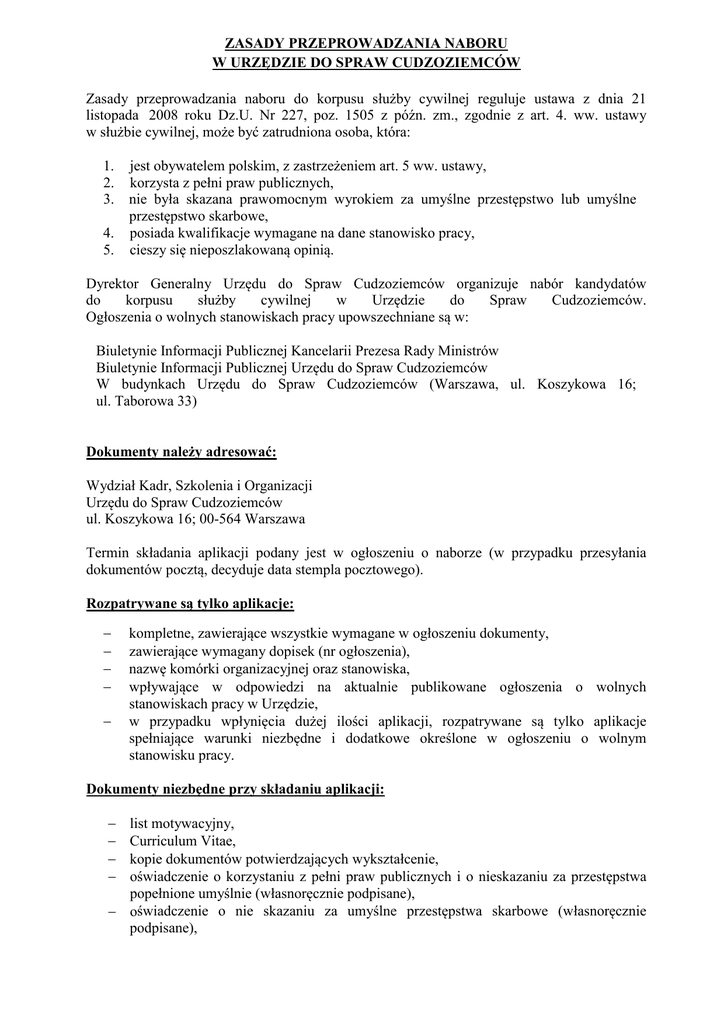 ZASADY PRZEPROWADZANIA NABORU W URZĘDZIE DO SPRAW CUDZOZIEMCÓW Zasady przeprowadzania naboru do korpusu służby cywilnej reguluje ustawa z dnia 21 listopada 2008 roku Dz.U. Nr 227, poz. 1505 z późn. zm., zgodnie z art. 4. ww. ustawy w służbie cywilnej, może być zatrudniona osoba, która: 1. 2. 3. 4. 5. jest obywatelem polskim, z zastrzeżeniem art. 5 ww. ustawy, korzysta z pełni praw publicznych, nie była skazana prawomocnym wyrokiem za umyślne przestępstwo lub umyślne przestępstwo skarbowe, posiada kwalifikacje wymagane na dane stanowisko pracy, cieszy się nieposzlakowaną opinią. Dyrektor Generalny Urzędu do Spraw Cudzoziemców organizuje nabór kandydatów do korpusu służby cywilnej w Urzędzie do Spraw Cudzoziemców. Ogłoszenia o wolnych stanowiskach pracy upowszechniane są w: Biuletynie Informacji Publicznej Kancelarii Prezesa Rady Ministrów Biuletynie Informacji Publicznej Urzędu do Spraw Cudzoziemców W budynkach Urzędu do Spraw Cudzoziemców (Warszawa, ul. Koszykowa 16; ul. Taborowa 33) Dokumenty należy adresować: Wydział Kadr, Szkolenia i Organizacji Urzędu do Spraw Cudzoziemców ul. Koszykowa 16; 00-564 Warszawa Termin składania aplikacji podany jest w ogłoszeniu o naborze (w przypadku przesyłania dokumentów pocztą, decyduje data stempla pocztowego). Rozpatrywane są tylko aplikacje: − − − − − kompletne, zawierające wszystkie wymagane w ogłoszeniu dokumenty, zawierające wymagany dopisek (nr ogłoszenia), nazwę komórki organizacyjnej oraz stanowiska, wpływające w odpowiedzi na aktualnie publikowane ogłoszenia o wolnych stanowiskach pracy w Urzędzie, w przypadku wpłynięcia dużej ilości aplikacji, rozpatrywane są tylko aplikacje spełniające warunki niezbędne i dodatkowe określone w ogłoszeniu o wolnym stanowisku pracy. Dokumenty niezbędne przy składaniu aplikacji: − − − − list motywacyjny, Curriculum Vitae, kopie dokumentów potwierdzających wykształcenie, oświadczenie o korzystaniu z pełni praw publicznych i o nieskazaniu za przestępstwa popełnione umyślnie (własnoręcznie podpisane), − oświadczenie o nie skazaniu za umyślne przestępstwa skarbowe (własnoręcznie podpisane), − oświadczenie o wyrażeniu zgody na przetwarzanie danych osobowych do celów rekrutacji (własnoręcznie podpisane), − kopia dowodu osobistego lub oświadczenie o posiadaniu obywatelstwa polskiego, − kopie dokumentów poświadczających doświadczenie zawodowe (jeśli doświadczenie jest wymagane), − kopie dokumentów poświadczających znajomość języka obcego (jeśli znajomość języka obcego jest wymagana), − kopię dokumentu poświadczającego stopień niepełnosprawności (w przypadku składania aplikacji przez osoby niepełnosprawne). Imiona i nazwiska kandydatów, którzy spełniają wymagania formalne, oraz wynik naboru stanowią informację publiczną w zakresie objętym wymaganiami określonymi w ogłoszeniu o naborze. Postępowanie kwalifikacyjne przeprowadzane jest komisyjnie z zastosowaniem metod i technik selekcji. Postępowanie kwalifikacyjne ma na celu wyłonienie do zatrudnienia najlepszego kandydata. Zgodnie z ustawą o służbie cywilnej sporządza się protokół z przeprowadzonego naboru, który zawiera: − określenie stanowiska pracy, na które był prowadzony nabór, liczbę kandydatów oraz imiona, nazwiska i adresy nie więcej niż 5 najlepszych kandydatów uszeregowanych według poziomu spełniania przez nich wymagań określonych w ogłoszeniu o naborze, − liczbę nadesłanych ofert, w tym liczbę ofert niespełniających wymogów formalnych, − informację o zastosowanych metodach i technikach naboru, − uzasadnienie dokonanego wyboru, − skład komisji przeprowadzającej nabór. Informacja o wyniku naboru stanowi informację publiczną i jest upowszechniana niezwłocznie po przeprowadzonym naborze, w siedzibie Urzędu, w Biuletynie Informacji Publicznej Urzędu oraz Biuletynie Informacji Publicznej KPRM. Wymagania formalne spełniają te oferty, które: − zostaną nadesłane w terminie określonym w ogłoszeniu (decyduje data stempla pocztowego), − zawierają komplet własnoręcznie podpisanych oświadczeń, jak również dokumenty potwierdzające wymagany poziom wykształcenia lub doświadczenia zawodowego. Więcej informacji można uzyskać pod numerem telefonu: (22) 60-150-76.