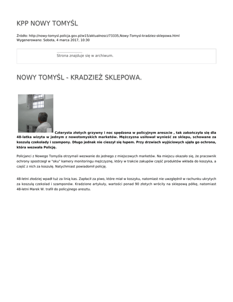 KPP NOWY TOMYŚL Źródło: http://nowy-tomysl.policja.gov.pl/w15/aktualnosci/73335,Nowy-Tomysl-kradziez-sklepowa.html Wygenerowano: Sobota, 4 marca 2017, 10:30 Strona znajduje się w archiwum. NOWY TOMYŚL - KRADZIEŻ SKLEPOWA. Czterysta złotych grzywny i noc spędzona w policyjnym areszcie , tak zakończyła się dla 48-latka wizyta w jednym z nowotomyskich marketów. Mężczyzna usiłował wynieść ze sklepu, schowane za koszulą czekolady i szampony. Długo jednak nie cieszył się łupem. Przy drzwiach wyjściowych ujęła go ochrona, która wezwała Policję. Policjanci z Nowego Tomyśla otrzymali wezwanie do jednego z miejscowych marketów. Na miejscu okazało się, że pracownik ochrony spostrzegł w "oku" kamery monitoringu mężczyznę, który w trakcie zakupów część produktów wkłada do koszyka, a część z nich za koszulę. Natychmiast powiadomił policję. 48-letni złodziej wpadł tuż za linią kas. Zapłacił za piwo, które miał w koszyku, natomiast nie uwzględnił w rachunku ukrytych za koszulą czekolad i szamponów. Kradzione artykuły, wartości ponad 90 złotych wróciły na sklepową półkę, natomiast 48-letni Marek W. trafił do policyjnego aresztu. 48-letni Marek W. Mężczyzna w chwili zatrzymania był pijany. Miał blisko promil alkoholu w organizmie. Dziś po wytrzeźwieniu przyznał się do kradzieży i poddał dobrowolnie karze grzywny w wysokości 400 złotych. Ocena: 0/5 (0) Tweetnij