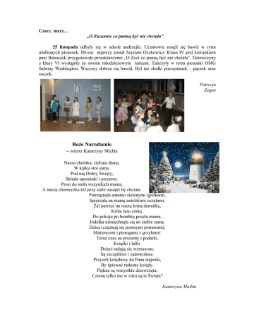 Czary, mary… „O Zuzannie co panną być nie chciała” 25 listopada odbyły się w szkole andrzejki. Uczniowie mogli się bawić w rytm ulubionych piosenek. DJ-em imprezy został Szymon Oczkowicz. Klasa IV pod kierunkiem pani Banaszek przygotowała przedstawienie „O Zuzi co panną być nie chciała”. Dziewczyny z klasy VI wystąpiły ze swoim młodzieżowym tańcem. Tańczyły w rytm piosenki OMG Sabriny Washington. Wszyscy dobrze się bawili. Był też słodki poczęstunek – pączek oraz soczek. Patrycja Zegan Boże Narodzenie – wiersz Katarzyny Michta Nasza choinka, zielona dama, W kątku stoi sama. Pod nią Dobry Święty, Składa upominki i prezenty. Prosi do stołu wszystkich mama, A nasza choineczka też przy stole zasiąść by chciała. Potrząsnęła smutno zielonymi igiełkami, Spojrzała na mamę anielskimi oczętami. Żal patrzeć na naszą leśną damulkę, Króla lasu córkę. Do pokoju po bombkę poszła mama, Jodełka uśmiechnęła się do siebie sama. Dzieci częstują się postnymi potrawami, Makowcem i pierogami z grzybami. Teraz czas na prezenty i podarki, Książki i lalki. Dzieci radują się wzruszone, Są szczęśliwe i zadowolone. Przyszli kolędnicy do Pana stajenki, By śpiewać radosne kolędy. Piękne są wszystkie dziewczęta, Czemu tylko raz w roku są te Święta? Katarzyna Michta Pomarańczowa bomba witaminowa. Witaminki dla ładnej dziewczynki. 9 XI w naszej szkole odbył się Dzień Pomarańczowy. Większość naszych uczniów tego dnia w swoim ubraniu miała jakiś element pomarańczowy. ''Pomarańczowi'' szczęściarze otrzymali równie pomarańczowy smakołyk - mandarynkę. Małe gosposie - uczennice klasy III rozdawały owoce i pilnowały by każdy ( oczywiście pomarańczowy!) został obdarowany upominkiem. Liczne konkursy i zabawy odbywały się pod opieką p. Urszuli Wierzby. W dalszej części zabawy odbył się konkurs. Każda klasa miała przygotować jak najwięcej haseł związanych ze zdrową żywnością. Klasowe zespoły gorączkowo gryzły ołówki. Trwała wielka burza mózgów. Wkrótce pojawiły się wyniki. Zwyciężyła klasa VI, kolejne miejsca zajęły klasy V i III. Następnie zespoły klasowe miały przygotować plakat ilustrujący ich hasła. I to był właśnie gwóźdź programu! Każda klasa otrzymała zestaw plastyczny i kolorowy papier. Czas przygotowania pracy był krótki i większość klas nie dokończyła swoich dzieł sztuki. Zwycięska klasa otrzymała kosz pełen owoców. Nasze prace oceniała p. Swietłana Komarowa, wybrała pracę kl. V. Szczęśliwa klasa dostała kosz owoców. Kl. VI ułożyła aż dziesięć haseł związanych ze zdrową żywnością, dlatego też otrzymała małą, słodką nagrodę. Dzień Pomarańczowy Na zawsze pozostanie w naszej pamięci. Katarzyna Michta Festiwal piosenki angielskiej … Sing and play… 1 grudnia 2010 roku w szkole nr 2 w Miechowie odbył się powiatowy festiwal piosenki angielskiej. Na początku na rozgrzanie publiczności wystąpił zespół „Kretki” .. Następnie wystąpiło 12 szkół w kategoriach: zespoły, duety i soliści. . Nasza szkoła zajęła II miejsce w kategorii zespół z piosenką . Piosenkę pt. „ Waka Waka” zaśpiewała grupa „Małe Księżniczki” w składzie; Agnieszka Góral, Marta Sokołowska, Beata Mierzwińska, Weronika Trela oraz Karolina Kuraj. W nagrodę uczestnicy otrzymali książkę „ Baśnie polskie i angielskie” wraz z dyplomem za uczestnictwo. Stroje do wykonywanej piosenki przygotowała pani Dorota Wierzba. Marta Sokołowska, Agnieszka Góral Kukiełkowy świat O Kasi co gąski zgubiła… 2 listopada odbyła się wycieczka szkolna do teatru Groteska w Krakowie na którą pojechali uczniowie z kółka teatralnego realizowanego w ramach projektu unijnego. W teatrze Groteska odbyło się przedstawienie „O Kasi co gąski zgubiła”. Wilk wraz z czarownicą uknuli plan, aby kraść zwierzęta mieszkańcom wioski. Na szczęście skrzaty leśne skłóciły ze sobą wilka i czarownice. Ci ze złości pobili się . Przed przedstawieniem odbyły się warsztaty teatralne, na których aktorzy przypomniali nam nazwy lalek oraz sposób poruszania nimi. Szkolna wigilia W przedświątecznym nastroju 22 XII w naszej szkole odbyła się uroczysta wigilia. Występowali uczniowie klasy I i II przygotowani przez p. Małgorzatę Sojka i p. Annę Wojas. Mogliśmy posłuchać kolęd w wykonaniu naszych najmłodszych artystów oraz przypomnieć sobie symbolikę niektórych świątecznych zwyczajów. Nie zabrakło też życzeń i wspólnego łamania się opłatkiem. Życzenia świąteczne wszystkim uczniom i pracownikom naszej szkoły złożyła pani dyrektor Danuta Gajos. Bardzo miłym i świątecznym akcentem tego dnia były wspólne spotkania uczniów ze swoimi wychowawcami przy klasowym wigilijnym stole. Nie zabrakło na nim tradycyjnych potraw wigilijnych i wspólnie śpiewanej kolędy. Warto przypomnieć, że świąteczną atmosferę mogliśmy poczuć już w naszej szkole dzień wcześniej. We wtorek z inicjatywy p Urszuli Wierzby i Samorządu Szkolnego na przerwach przy szkolnej choince śpiewaliśmy kolędy i pastorałki. Uczniowie klasy I i II podczas wigilijnej akademii Wigilia w klasie Dar losu Wiersz Katarzyny Michta nagrodzony w konkursie poświęconym twórczości Marii Konopnickiej organizowany przez SP w Miechowie Srebrne łzy spływały po złotej rynnie, Mrok ogarnął księżycowe lilie. Coś szepnęła gwiazda do gwiazdy. A tam hen daleko ktoś płacze, Płacze cicho… Szuka czyjegoś serca dziecko, Ale nie ma go nigdzie. Siedzi samo w starej chacie. Nie ma nikogo… Mama odeszła do wieczności, Tata zabłąkany w wielkim świecie… Jakiś człowiek duszę mu swą niesie. Otrze łzy, pogładzi czuprynę. Czemuż czas jednak tak wolno płynie? Spełnią się wszystkie jego pragnienia, Zazna rodzinnego ciepła, Głód odejdzie w ciemny mrok, Przyjaciel przyjdzie doń. Świat odezwie się na jego słowo, Wi