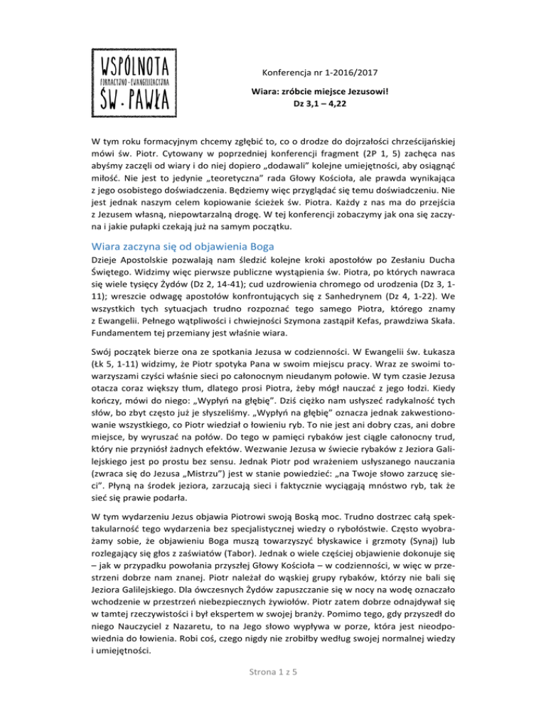 Konferencja nr 1-‐2016/2017 Wiara: zróbcie miejsce Jezusowi! Dz 3,1 – 4,22 W tym roku formacyjnym chcemy zgłębić to, co o drodze do dojrzałości chrześcijańskiej mówi św. Piotr. Cytowany w poprzedniej konferencji fragment (2P 1, 5) zachęca nas abyśmy zaczęli od wiary i do niej dopiero „dodawali” kolejne umiejętności, aby osiągnąć miłość. Nie jest to jedynie „teoretyczna” rada Głowy Kościoła, ale prawda wynikająca z jego osobistego doświadczenia. Będziemy więc przyglądać się temu doświadczeniu. Nie jest jednak naszym celem kopiowanie ścieżek św. Piotra. Każdy z nas ma do przejścia z Jezusem własną, niepowtarzalną drogę. W tej konferencji zobaczymy jak ona się zaczy-‐ na i jakie pułapki czekają już na samym początku. Wiara zaczyna się od objawienia Boga Dzieje Apostolskie pozwalają nam śledzić kolejne kroki apostołów po Zesłaniu Ducha Świętego. Widzimy więc pierwsze publiczne wystąpienia św. Piotra, po których nawraca się wiele tysięcy Żydów (Dz 2, 14-‐41); cud uzdrowienia chromego od urodzenia (Dz 3, 1-‐ 11); wreszcie odwagę apostołów konfrontujących się z Sanhedrynem (Dz 4, 1-‐22). We wszystkich tych sytuacjach trudno rozpoznać tego samego Piotra, którego znamy z Ewangelii. Pełnego wątpliwości i chwiejności Szymona zastąpił Kefas, prawdziwa Skała. Fundamentem tej przemiany jest właśnie wiara. Swój początek bierze ona ze spotkania Jezusa w codzienności. W Ewangelii św. Łukasza (Łk 5, 1-‐11) widzimy, że Piotr spotyka Pana w swoim miejscu pracy. Wraz ze swoimi to-‐ warzyszami czyści właśnie sieci po całonocnym nieudanym połowie. W tym czasie Jezusa otacza coraz większy tłum, dlatego prosi Piotra, żeby mógł nauczać z jego łodzi. Kiedy kończy, mówi do niego: „Wypłyń na głębię”. Dziś ciężko nam usłyszeć radykalność tych słów, bo zbyt często już je słyszeliśmy. „Wypłyń na głębię” oznacza jednak zakwestiono-‐ wanie wszystkiego, co Piotr wiedział o łowieniu ryb. To nie jest ani dobry czas, ani dobre miejsce, by wyruszać na połów. Do tego w pamięci rybaków jest ciągle całonocny trud, który nie przyniósł żadnych efektów. Wezwanie Jezusa w świecie rybaków z Jeziora Gali-‐ lejskiego jest po prostu bez sensu. Jednak Piotr pod wrażeniem usłyszanego nauczania (zwraca się do Jezusa „Mistrzu”) jest w stanie powiedzieć: „na Twoje słowo zarzucę sie-‐ ci”. Płyną na środek jeziora, zarzucają sieci i faktycznie wyciągają mnóstwo ryb, tak że sieć się prawie podarła. W tym wydarzeniu Jezus objawia Piotrowi swoją Boską moc. Trudno dostrzec całą spek-‐ takularność tego wydarzenia bez specjalistycznej wiedzy o rybołóstwie. Często wyobra-‐ żamy sobie, że objawieniu Boga muszą towarzyszyć błyskawice i grzmoty (Synaj) lub rozlegający się głos z zaświatów (Tabor). Jednak o wiele częściej objawienie dokonuje się – jak w przypadku powołania przyszłej Głowy Kościoła – w codzienności, w więc w prze-‐ strzeni dobrze nam znanej. Piotr należał do wąskiej grupy rybaków, którzy nie bali się Jeziora Galilejskiego. Dla ówczesnych Żydów zapuszczanie się w nocy na wodę oznaczało wchodzenie w przestrzeń niebezpiecznych żywiołów. Piotr zatem dobrze odnajdywał się w tamtej rzeczywistości i był ekspertem w swojej branży. Pomimo tego, gdy przyszedł do niego Nauczyciel z Nazaretu, to na Jego słowo wypływa w porze, która jest nieodpo-‐ wiednia do łowienia. Robi coś, czego nigdy nie zrobiłby według swojej normalnej wiedzy i umiejętności. Strona 1 z 5 W tej historii jest pewien uniwersalny rys każdego człowieka żyjącego głębią wiary. Dro-‐ ga do niej zawsze prowadzi przez objawienie. To objawienie bardzo często wydarza się w naszym świecie, w tej rzeczywistości, którą dobrze znamy. Często nie dajemy sobie prawa do tego, żeby przeżyć takie objawienie. Robimy to umniejszając świat w którym żyjemy, odbierając wartość temu, co jest naszą codziennością. Nasze myśli, emocje, re-‐ lacje, cielesność wydają nam się zbyt prozaiczne, żeby Bóg mógł się w nich objawić. Dla samych siebie wydajemy się zbyt zwyczajni, by Pan chciał do nas przyjść. Stawiamy się w ten sposób w pozycji, która przeszkadza Bogu w przychodzeniu do nas. Tymczasem nie ma innej drogi do wiary. Bóg musi przyjść do tej rzeczywistości, w której ja jestem go-‐ spodarzem. Pan może chcieć zrobić coś nieoczekiwanego i nieprzewidywalnego, co przekracza zasady naszego świata, właśnie w tym wymiarze, w którym czujemy się „fa-‐ chowcami”. W sytuacji Piotra Jezusowi nie przeszkadza nieodpowiednia pora dnia, ani stan psychiczny załogi. On ten świat „rozsadza”. Bóg jest nieskrępowany, transcendent-‐ ny, przekracza wszystko to, co stanowi nasze wyobrażenie na temat tego jak On ma za-‐ działać. Przekracza zarówno moje oczekiwania i marzenia, jak i moje umniejszenie co-‐ dzienności i tego, kim jestem. Bóg jest niezawisły w objawieniu i działa jak chce. Zrobienie miejsca Bogu i konsekwencje objawienia Znając zakończenie tej historii, przypatrzmy się jeszcze jak ona się zaczęła. Gdy do Piotra przychodzi Nauczyciel z Nazaretu, ten wpuszcza Go do swojej łodzi, ustępując mu miej-‐ sca. Piotr musi przerwać swoje zajęcia i opóźnić odpoczynek po pracowitej nocy. Jeśli chcemy Bogu pokazać naszą gotowość na Jego objawienie się, to nasza odpowiedź po-‐ winna polegać na zrobieniu Mu miejsca. Robię miejsce, to znaczy rezygnuję ze swojej aktywności, wycofuję się z moich przemądrzałych zasad i znajomości mojej codzienności. Odpowiadam raczej: „Boże, Ty działaj. Ty bądź niezależny, bo Ty jesteś Bogiem”. Daję Mu miejsce, by to On przejął inicjatywę i działał w bardzo wyraźny sposób. Z takiej po-‐ stawy powinna wyrastać modlitwa. Jeśli „wyręczamy” na niej Pana, mówiąc Mu co i jak ma zmienić w 