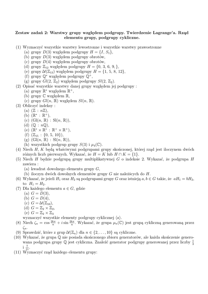 Zestaw zadań 2: Warstwy grupy względem podgrupy. Twierdzenie